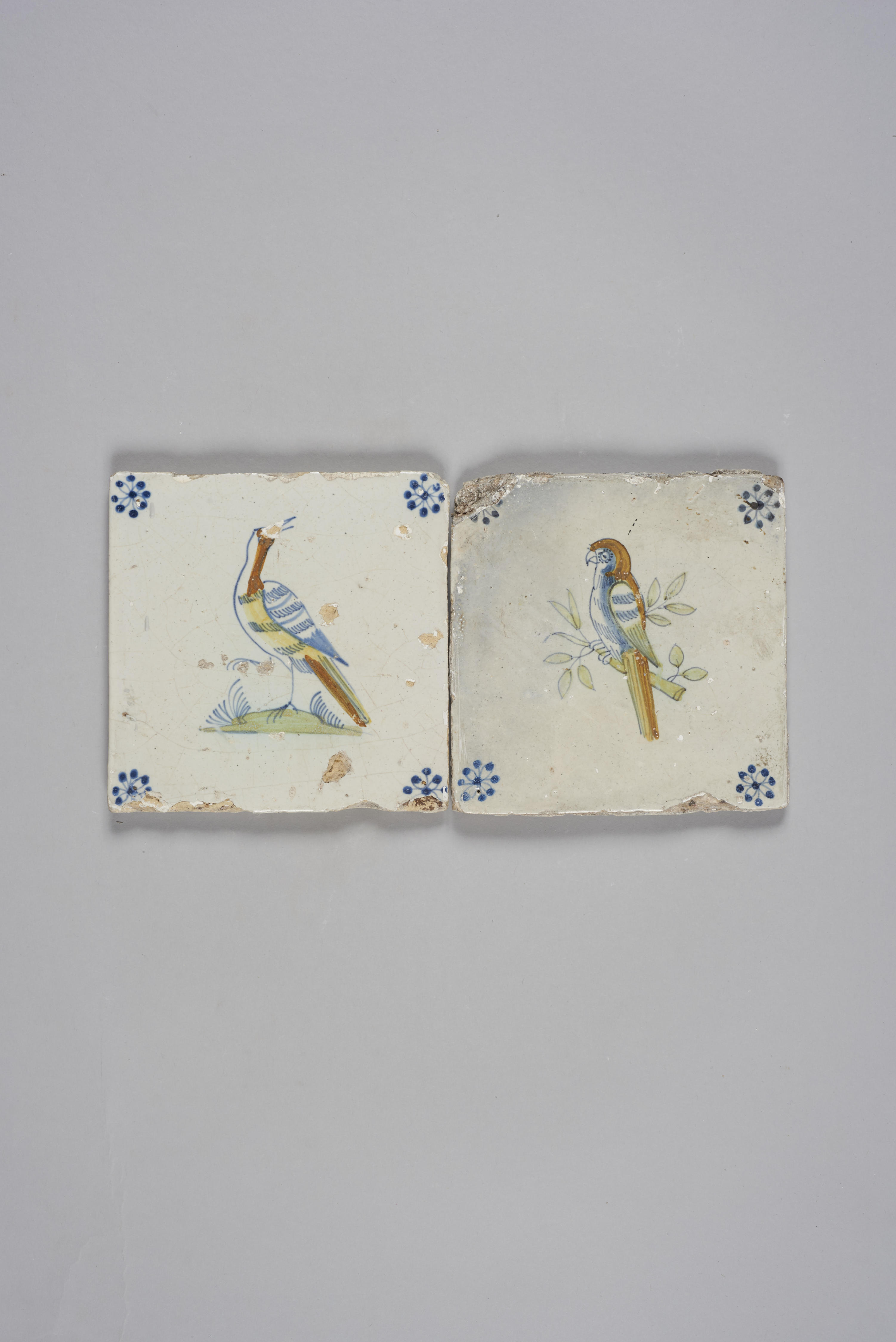 Twee wandtegels met afbeelding vogel, 1650–1700