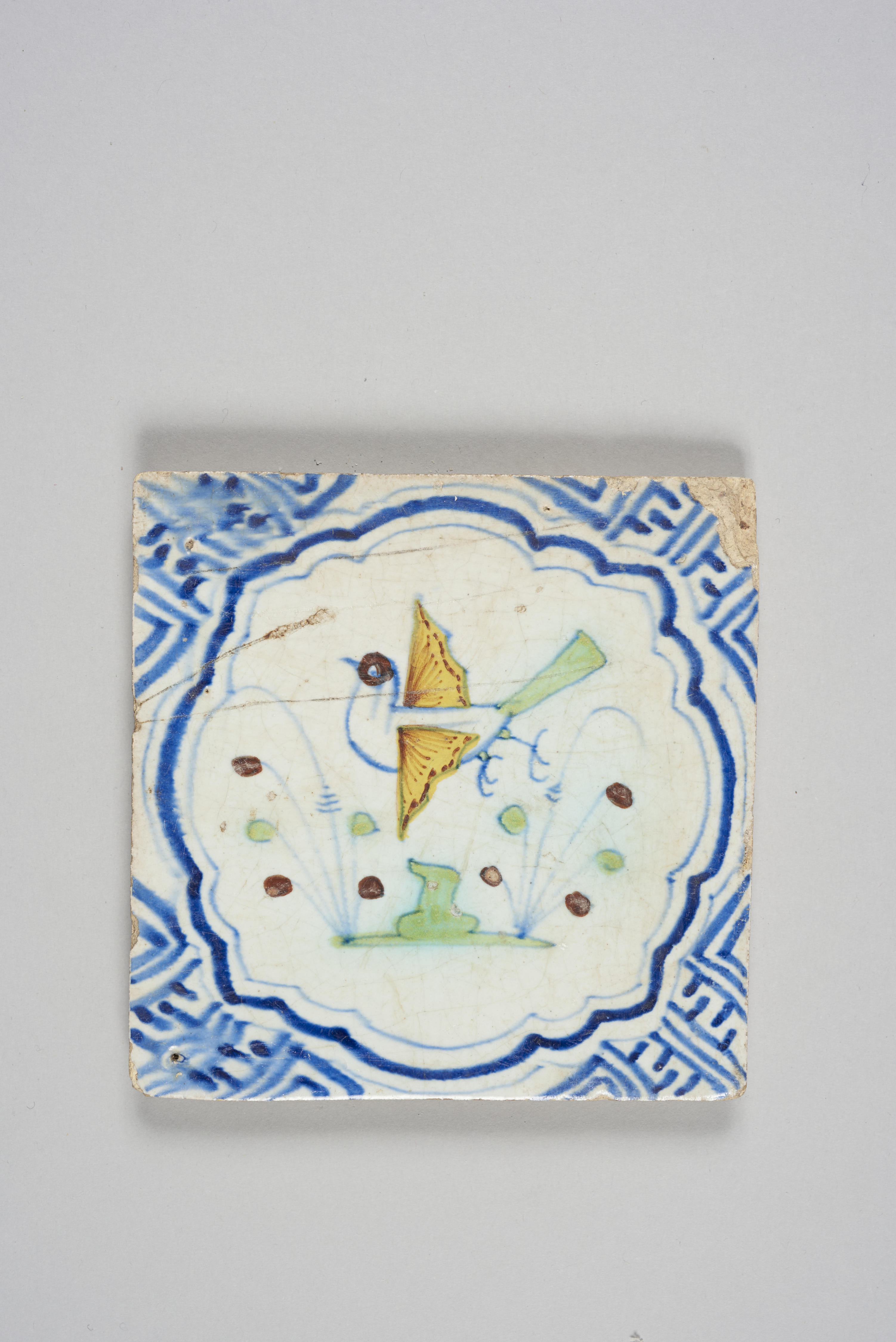 Wandtegel met afbeelding vogel in geschulpte omlijsting, 1620–1660