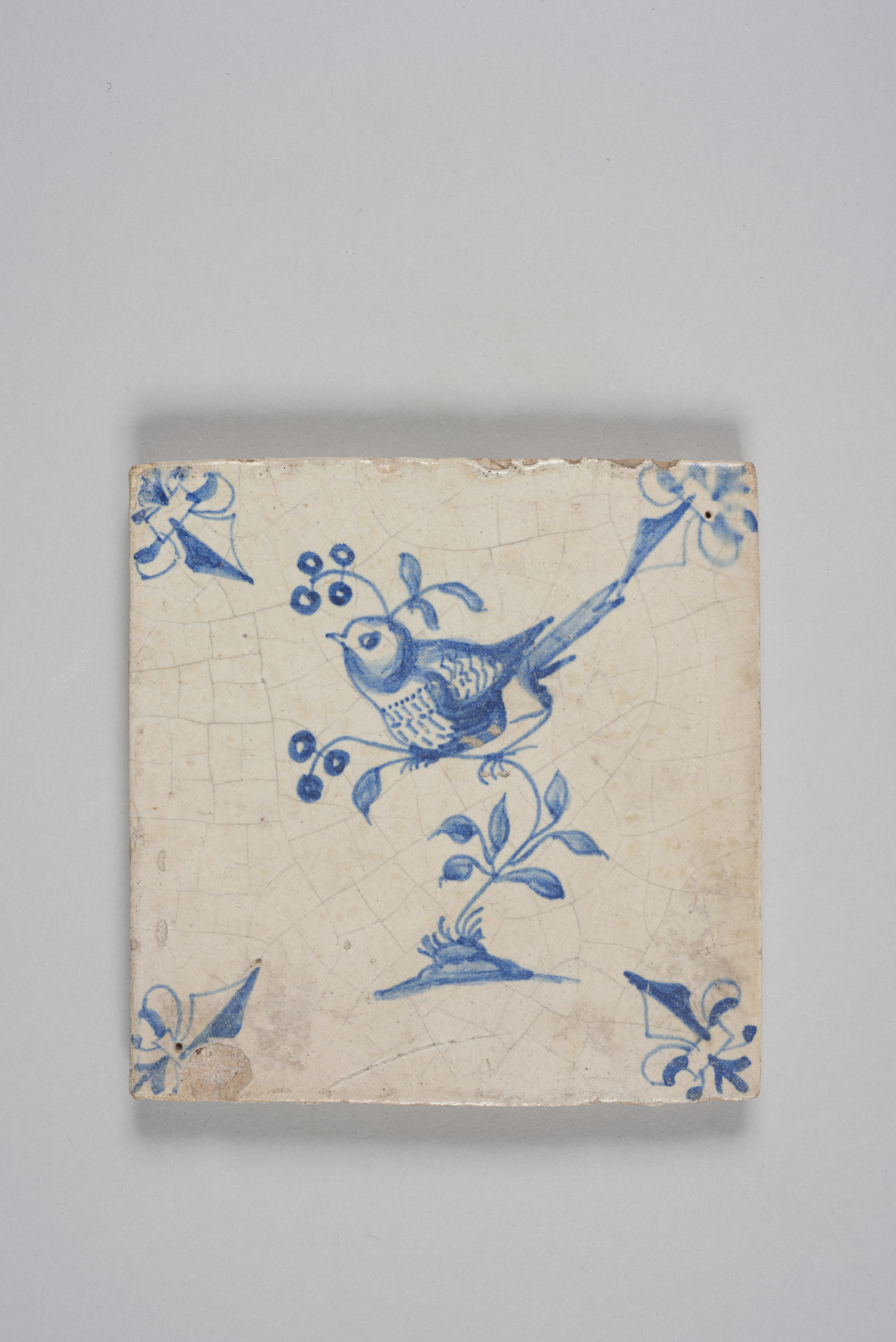 Wandtegel met een afbeelding van een vogel op een takje met bessen; blauw; hoekmotief: lelie.