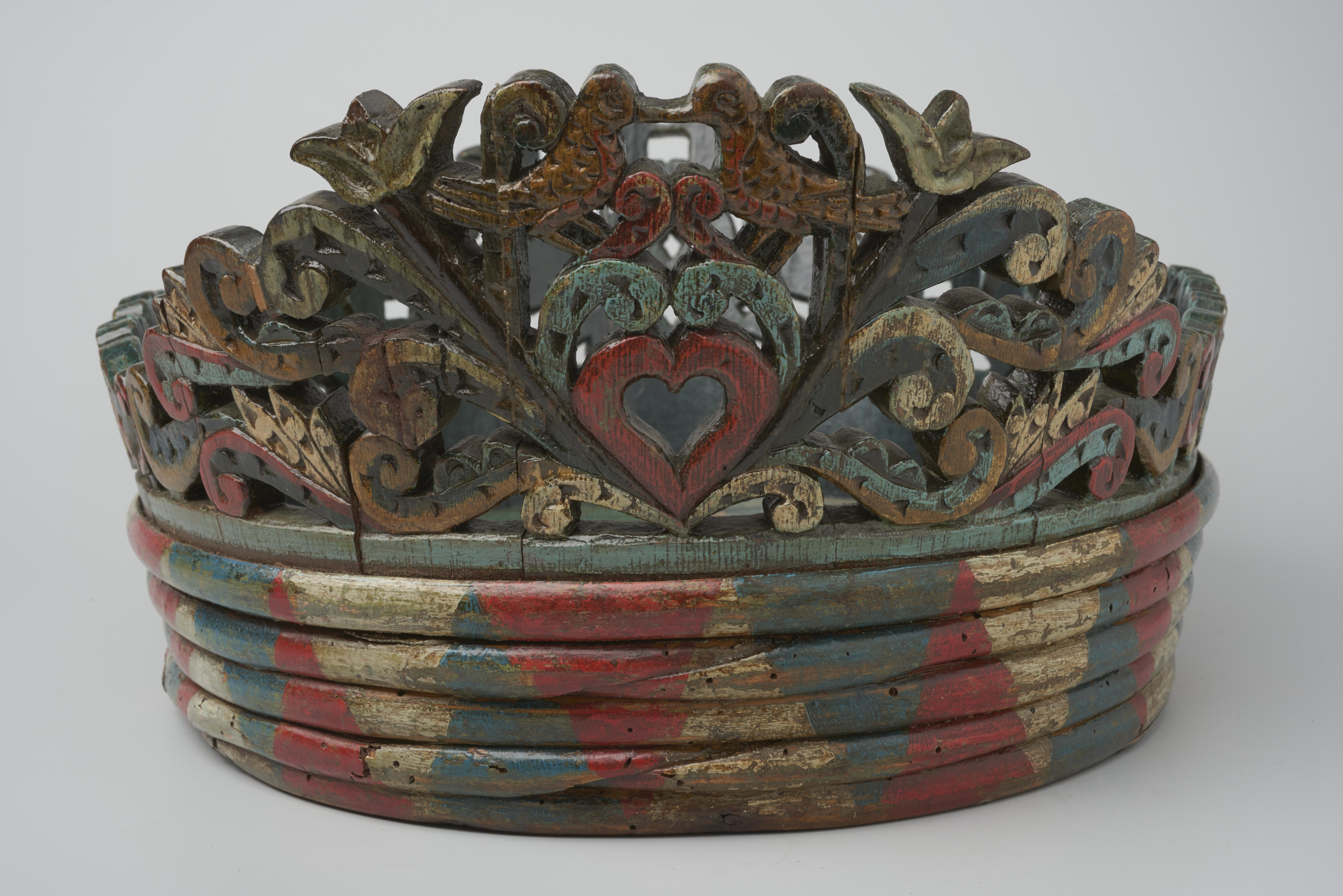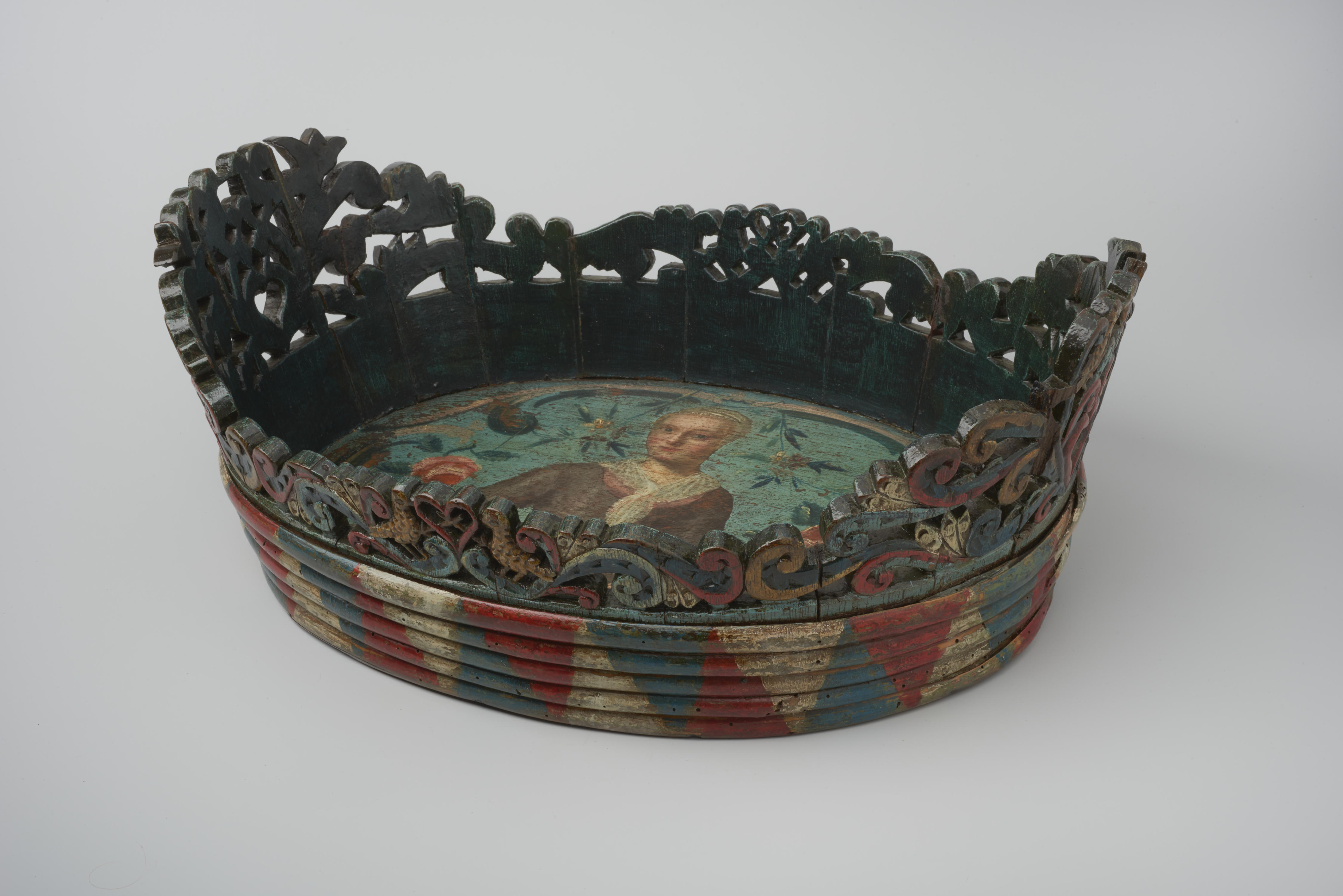 Eikenhouten kuipje met wilgentenen singels. De buitenzijde is beschilderd in de kleuren rood, wit, blauw en goud. De binnenzijde toont het portret van een vrouw op een lichtblauw fond, gedecoreerd met groen-witte rocaille en rode rozen. De vrouw houdt in haar linkerhand een bloem voor zich. De onderzijde en de binnenzijde van de opstaande wand ...
