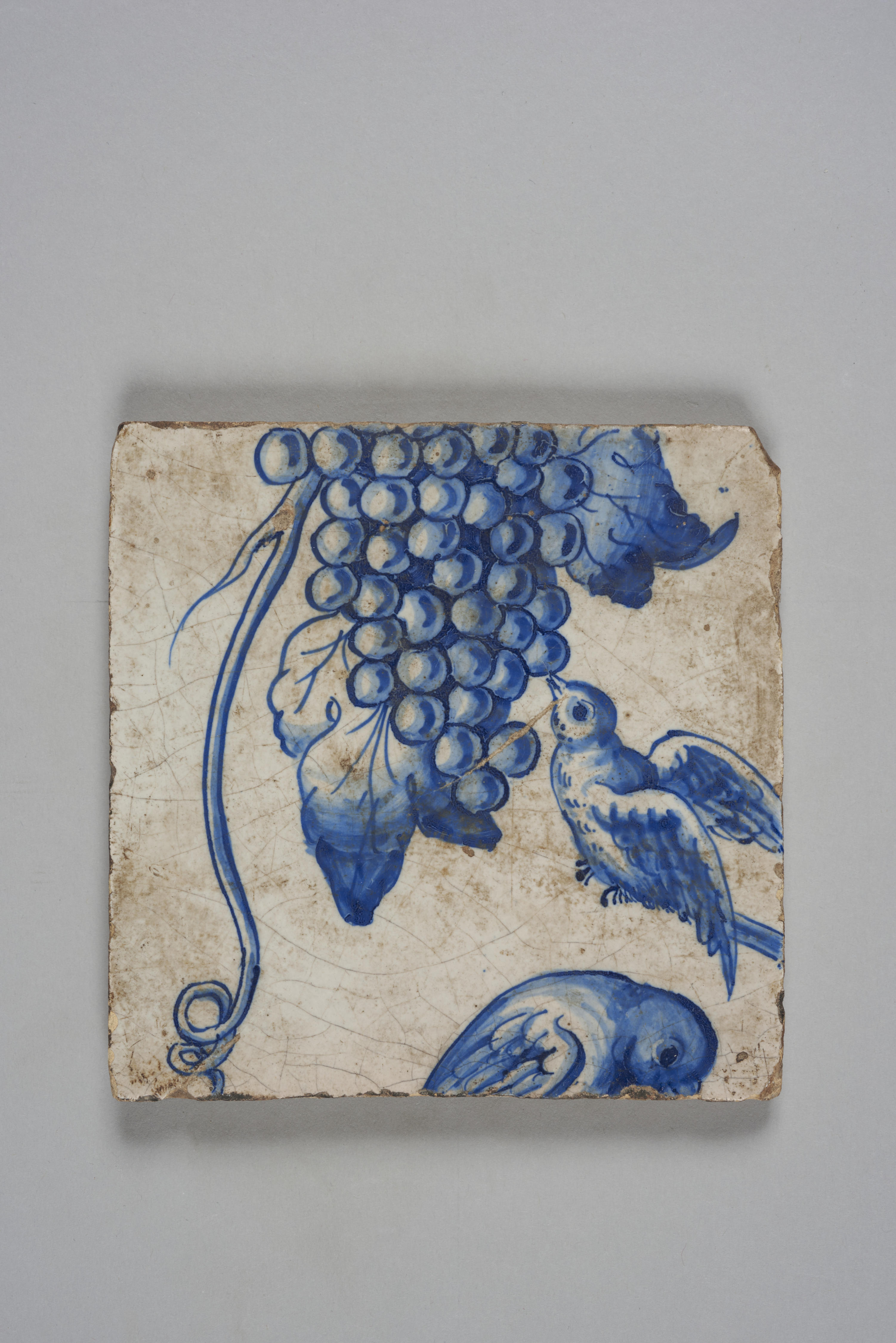Wandtegel (deel van tegeltableau) met afbeelding druiventros en vogels