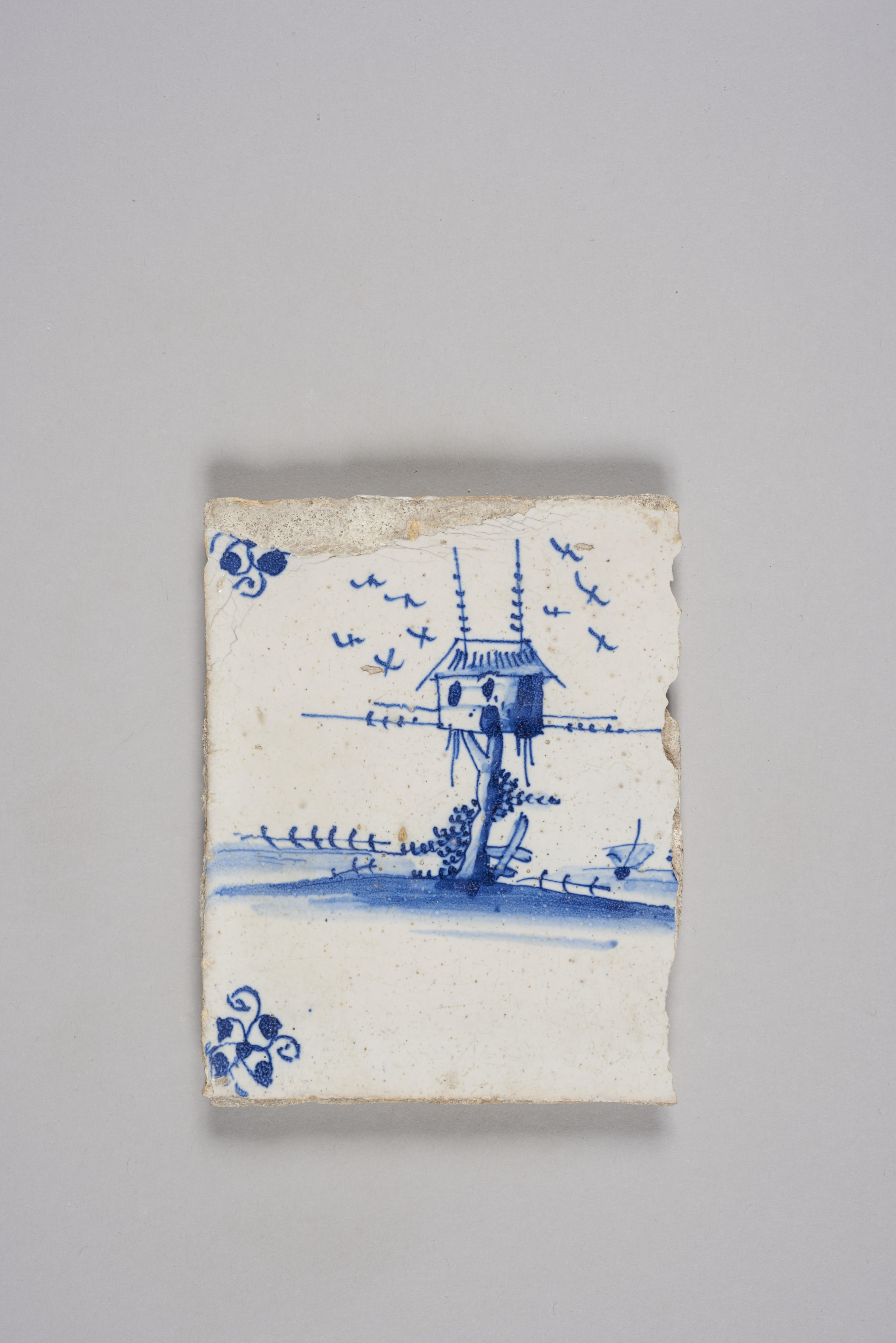 Wandtegel met een afbeelding van een landschap met een duiventil; blauw; hoekmotief: spin.