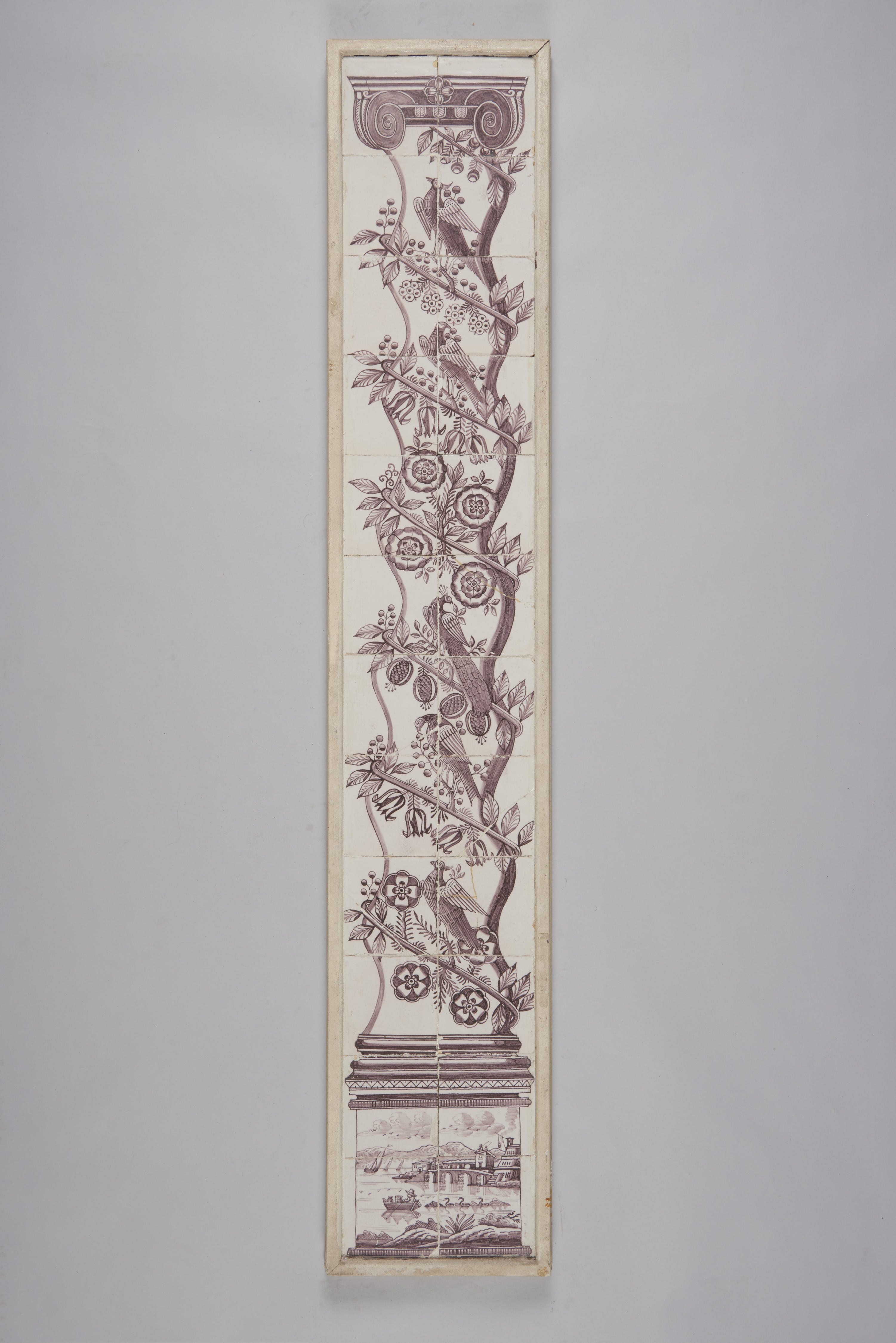 Tegeltableau, bestaande uit 24 tegels met een afbeelding van een dubbele pilaar met bloemen en vogels. Om de getorste zuil slingert een bloemenrank met vogels, bessen en granaatappels. In het basement is een landschapstafereel te zien met op de voorgrond een man in een bootje met in zijn kielzog drie zwanen. Op de achtergrond is ...