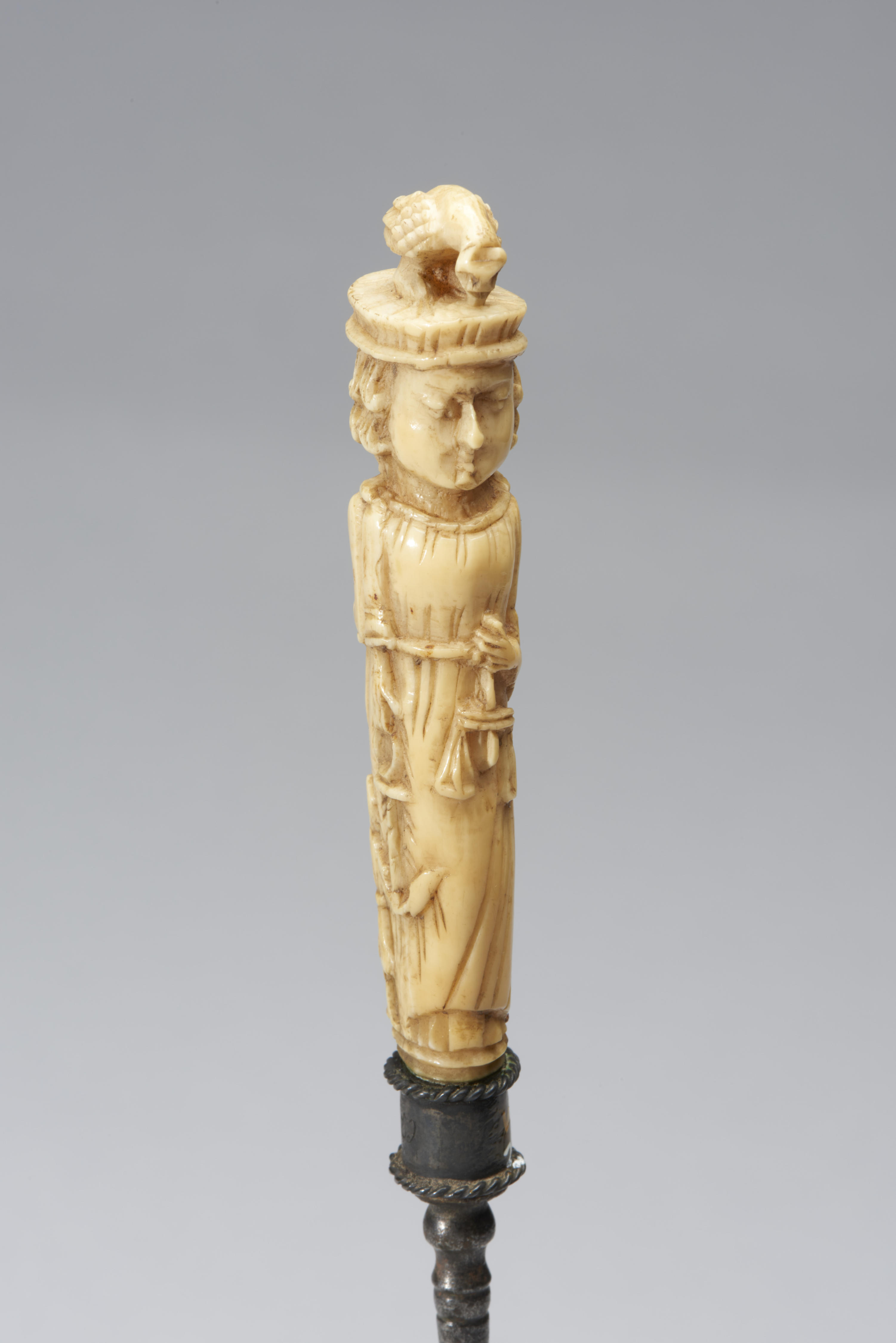 Vork, afkomstig uit Noordwest-Nederland. Het heft is gesneden in de vorm van vrouwen die geloof, hoop, liefde en gerechtigheid symboliseren, met een bekroning in de vorm van een vogel. De zilveren vatting is gemerkt: 'C.P.'