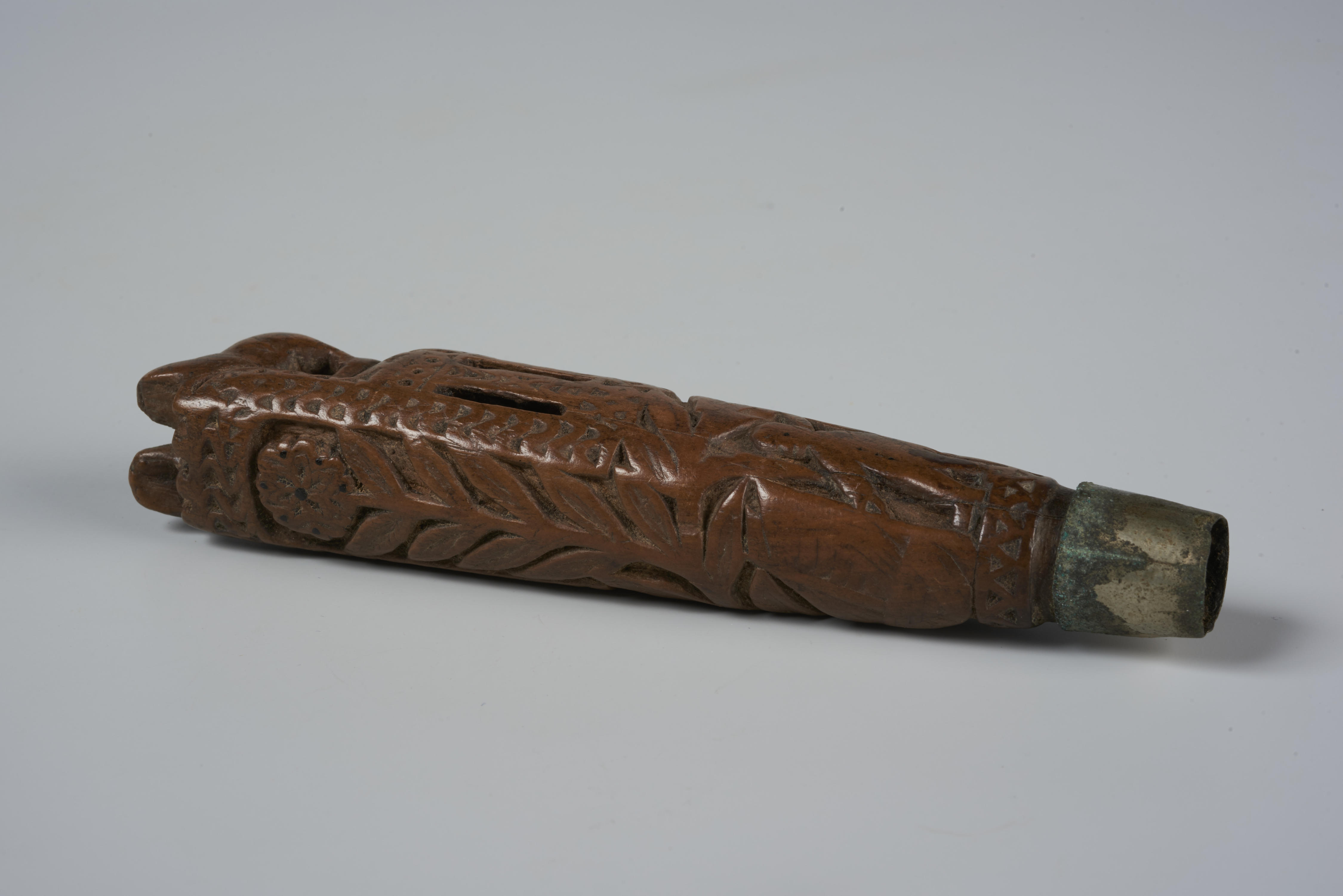 Palmhouten mesheft met de voorstelling van een man die onder bomen staat, met op de achtergrond een zeilboot en een vogel. Hierboven zijn een kooi met een balletje en bloemmotieven aangebracht. Het heft is bekroond met twee leeuwen.