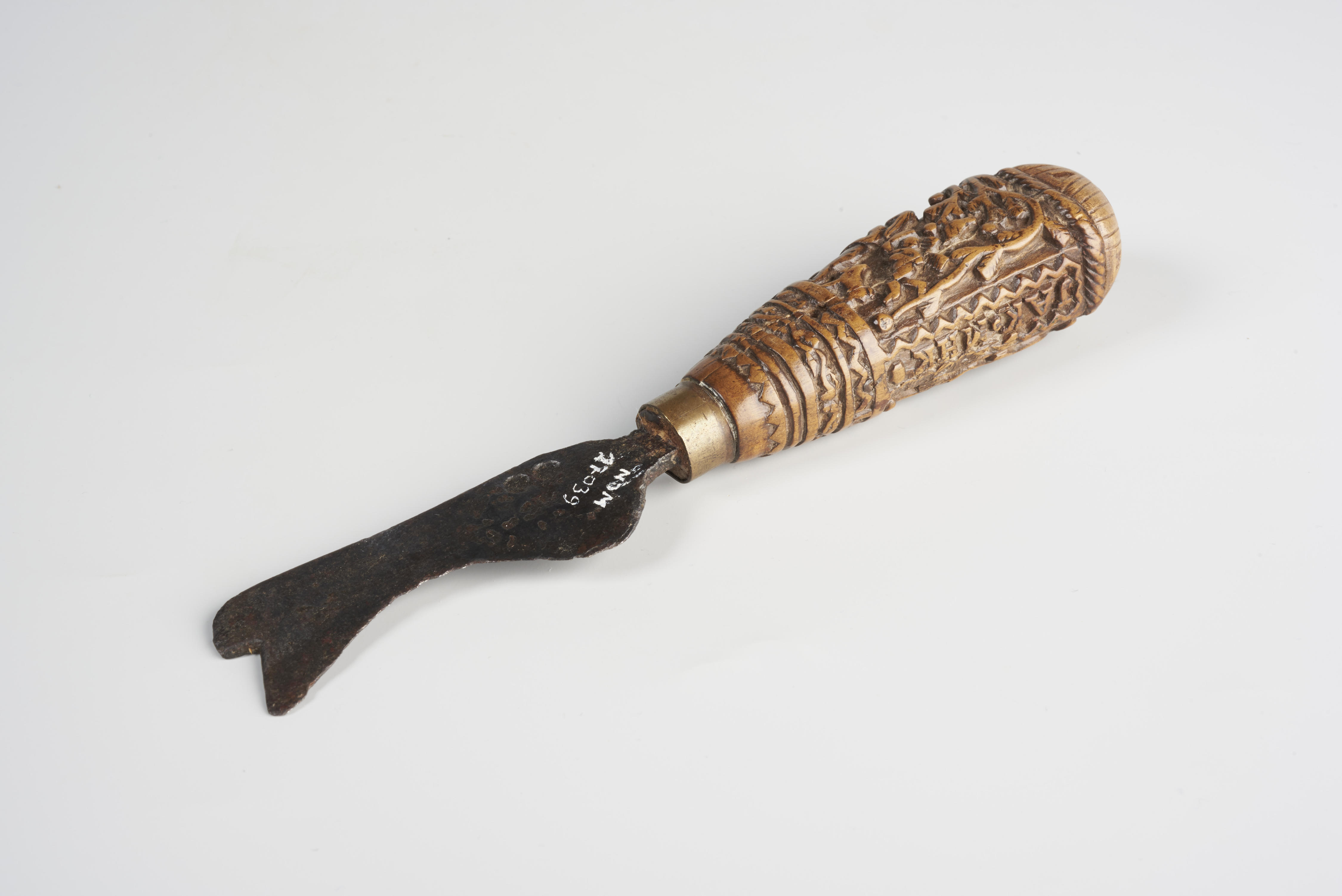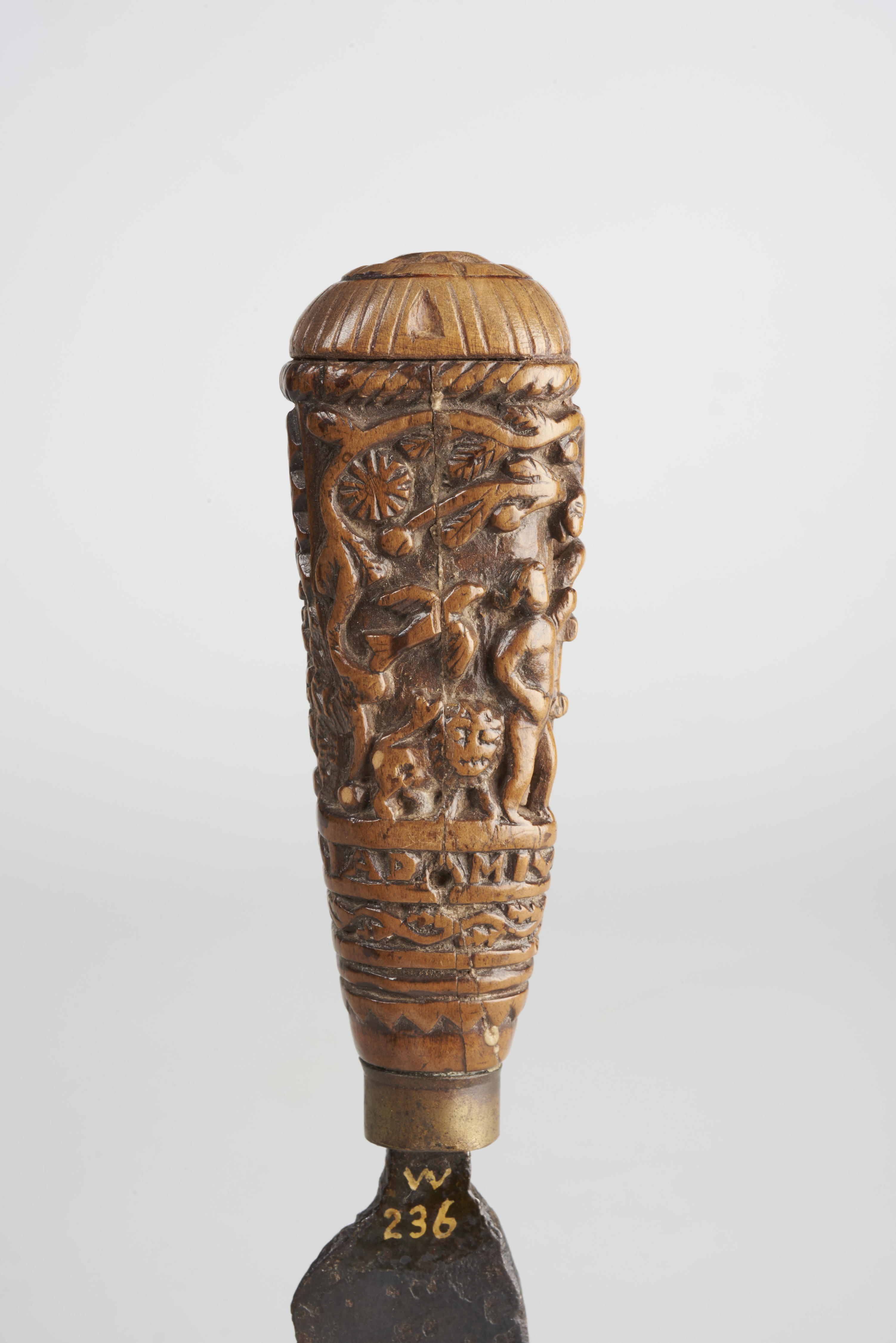 Mes met houten mesheft. Boven randen met driehoek- en rankenversiering staat het randschrift: 'Adam Eva'. Daarboven is de voorstelling van de zondeval in het paradijs te zien, met daarbij een leeuw, hondje of lam, vogels, de zon en de engel met het zwaard. In een rechtopstaand vak staan de naamletters: 'Jak. Mhko'. De bovenkant van ...