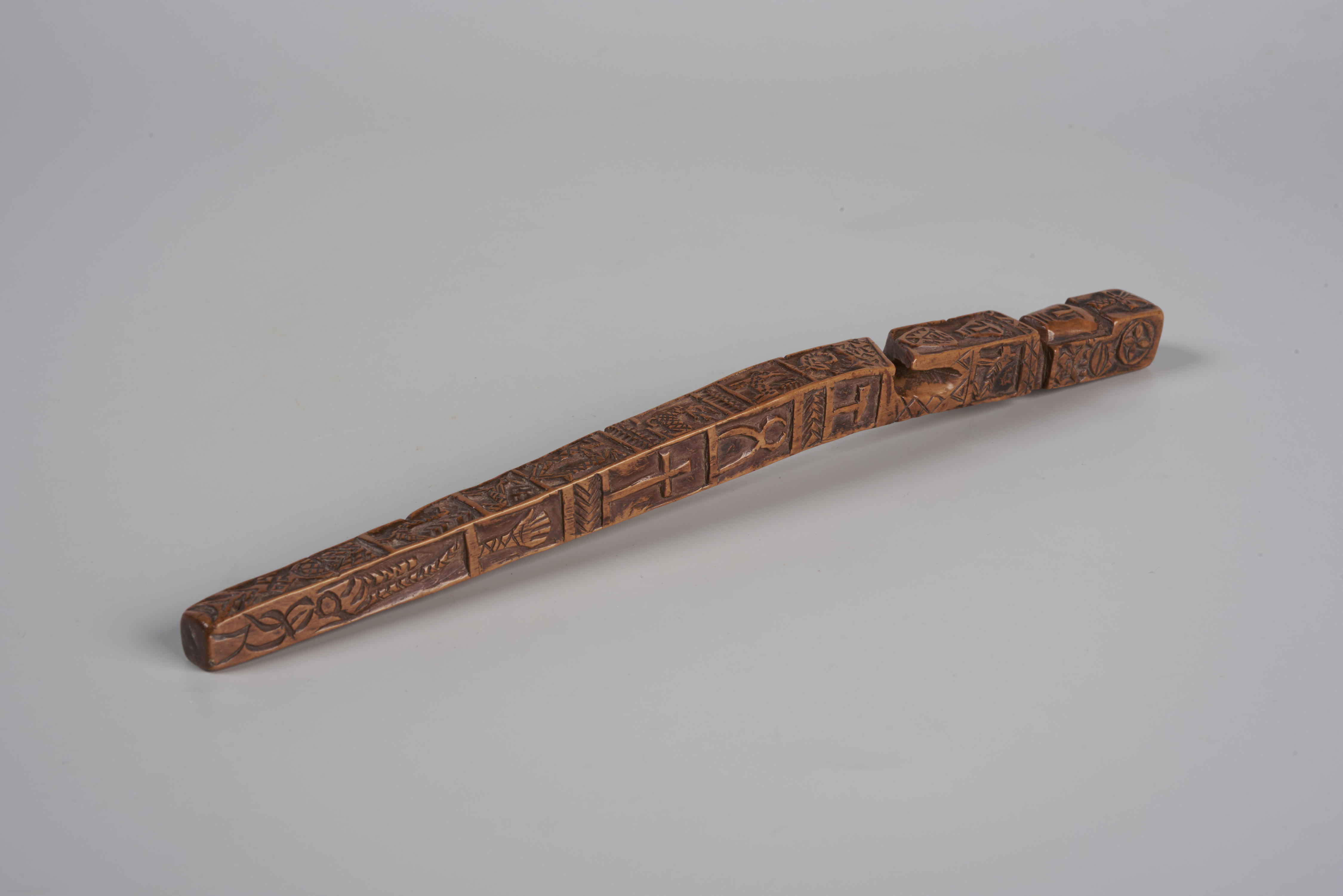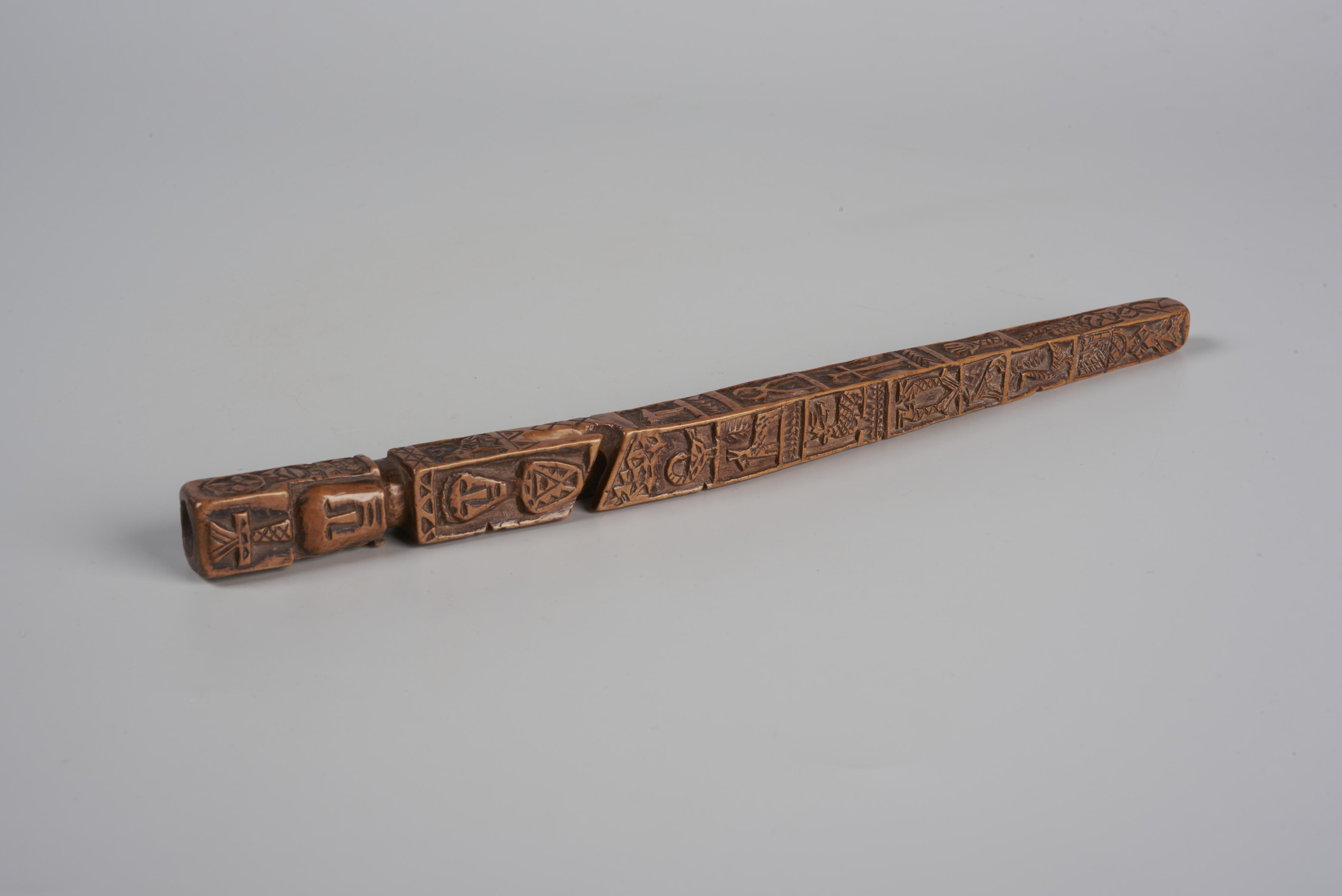 Houten breischede met een s-vormige sleuf voor het ophangen. De breischede is aan drie zijden versierd met onder andere een kruis, een vogel, een hond, een hert, hazen, een gans, een hamer, een nijptang, een kruis en de naamletters 'IVDB'. Het gat voor de breinaald is bovenin uitgestoken.
