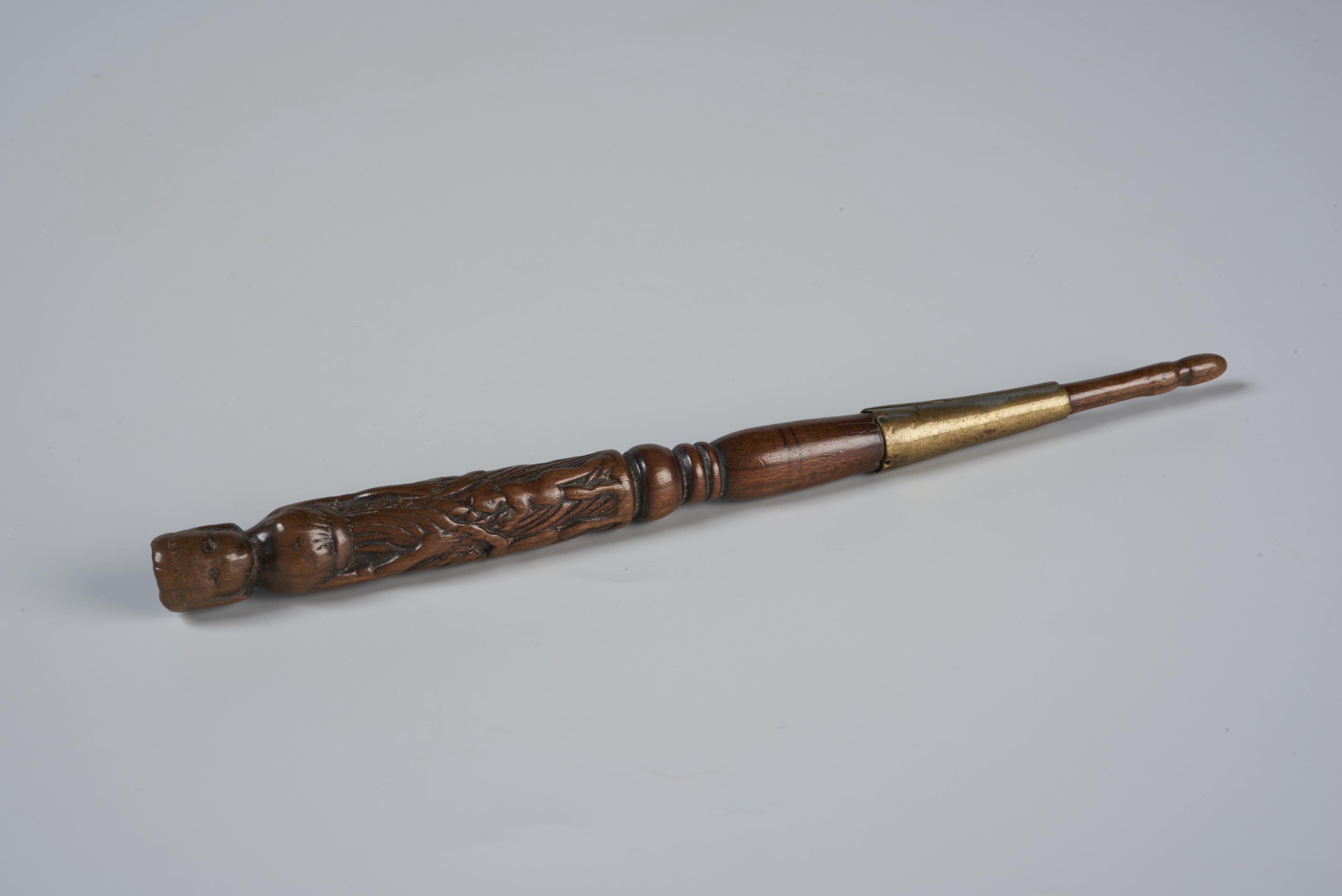 Breischede, waarvan het bovenste gedeelte is gesneden in de gedaante van een vrouw met kinderen aan haar rokken. Het onderste deel is versterkt met een metalen ring.