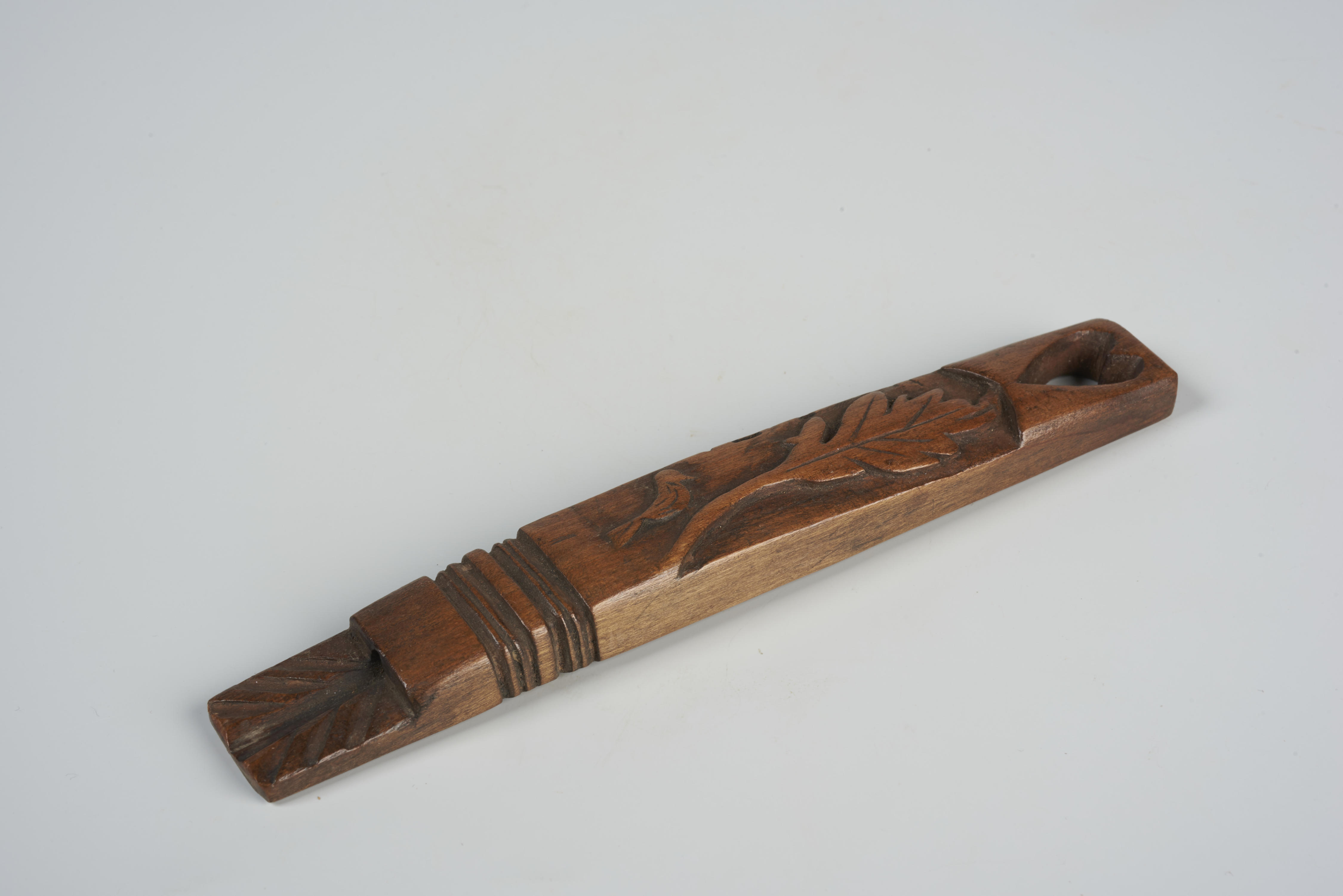 Breischede met op de voorzijde een voorstelling van een vogel op de steel van een blad met daaronder een uitgezaagd hart. De achterzijde is onversierd.
