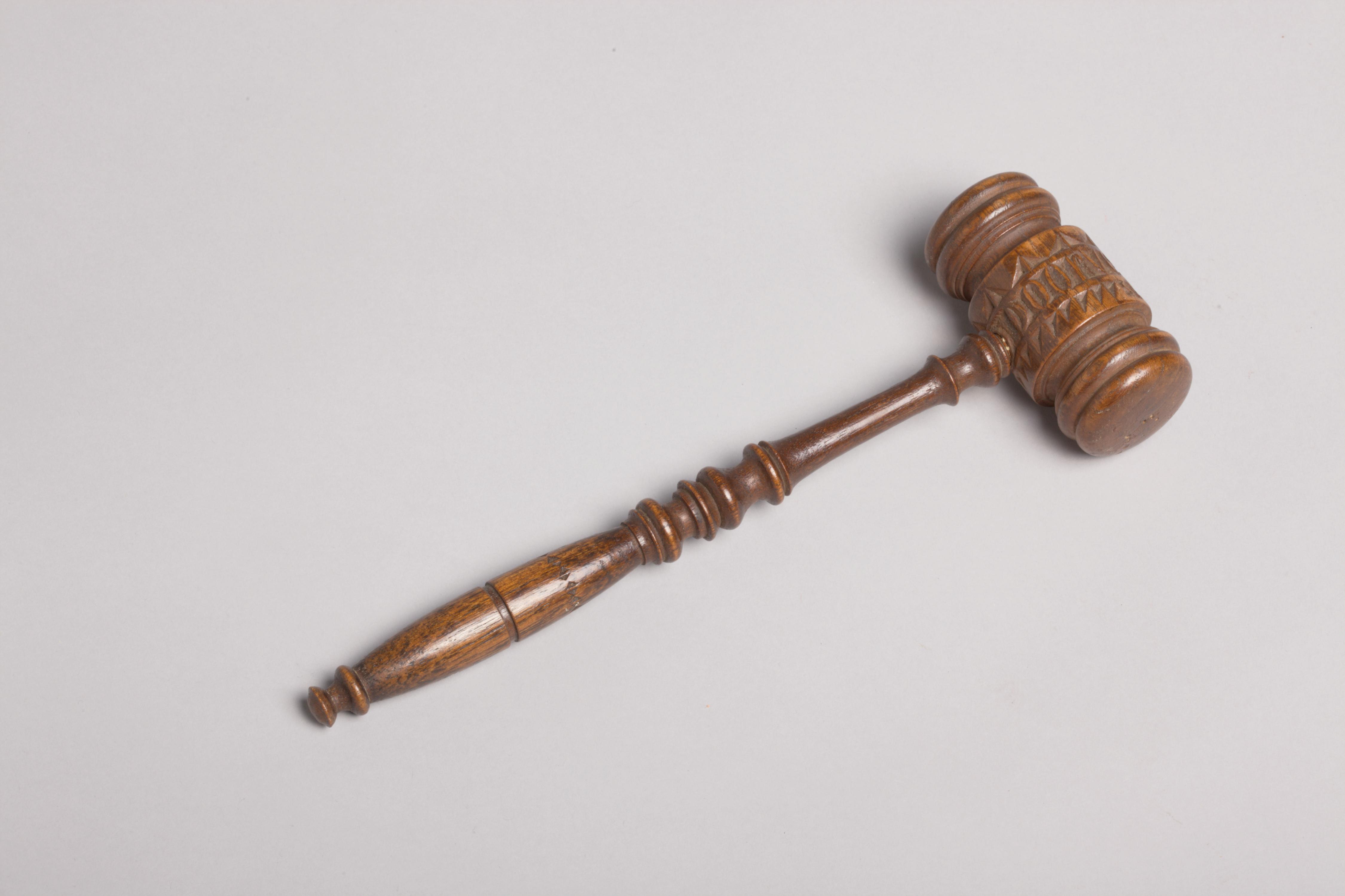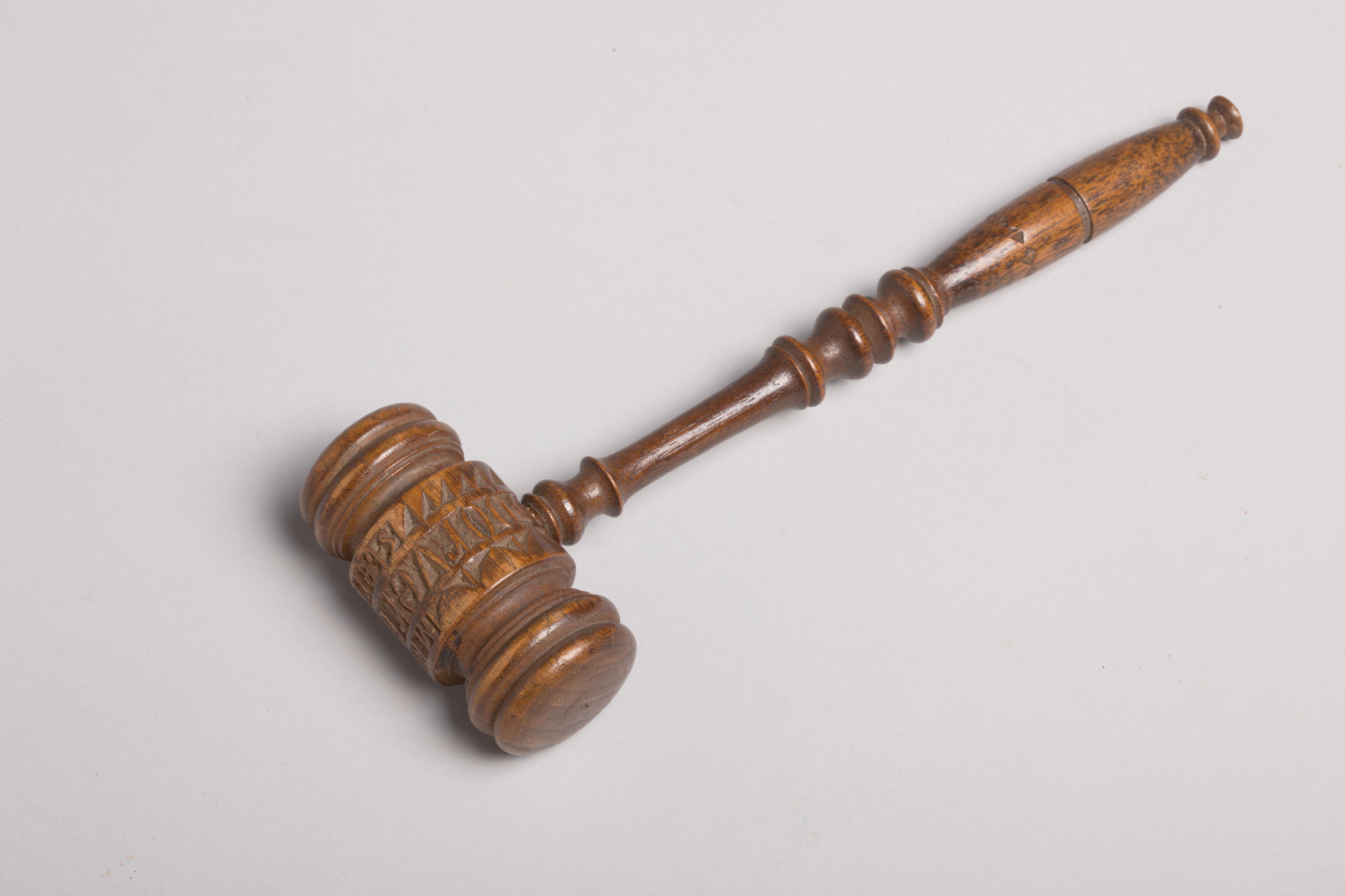 Houten voorzittershamer. In de kop van de hamer is tussen kerfsneeranden in zigzag- en driehoekspatronen de volgende tekst aangebracht: 'M B V Door Vereenigen Sterk 1899'.