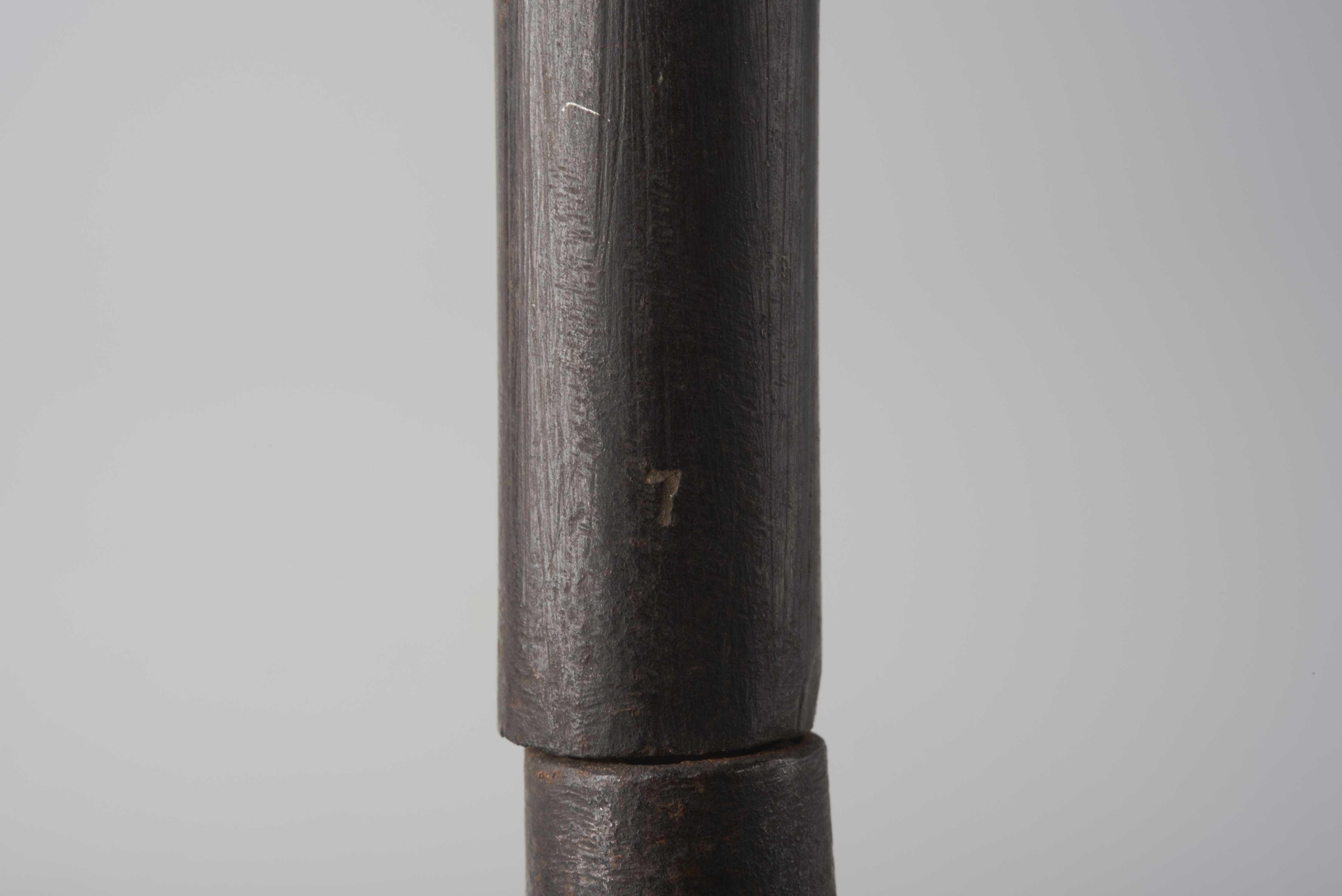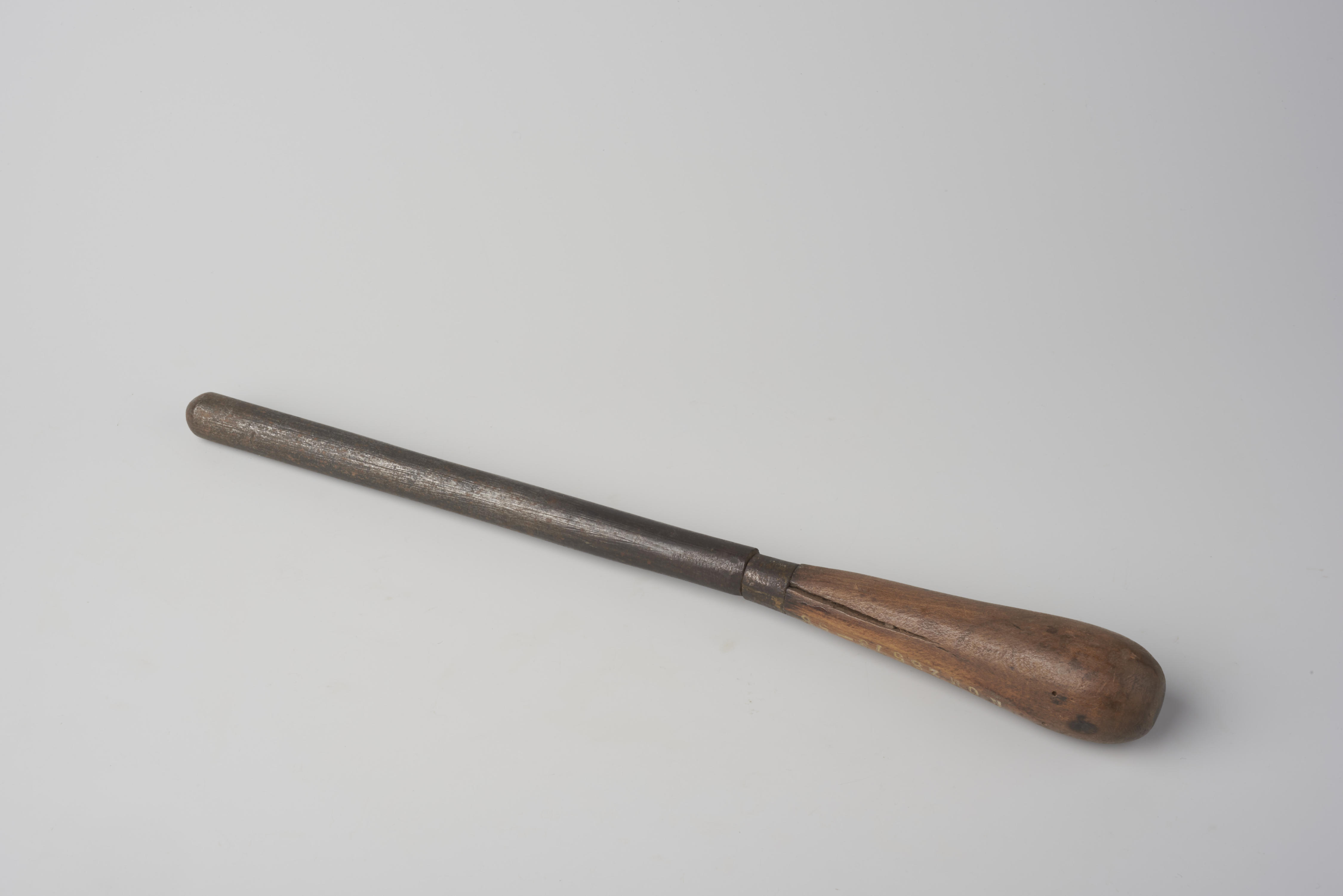 IJzeren mutsenplooistaaf. De staaf wordt verwarmd boven de kachel of het gasfornuis, waarna de plooien een voor een in de vochtige gesteven muts aangebracht worden. De plooistaaf is afkomstig uit Hellendoorn. Waarschijnlijk gebruikte Mina Klein Roseboom-Schooten (1863-1943) uit Hellendoorn deze plooistaaf voor het plooien van de achterstrook van haar Sallandse 'knipmutsen' (kornetmutsen).
