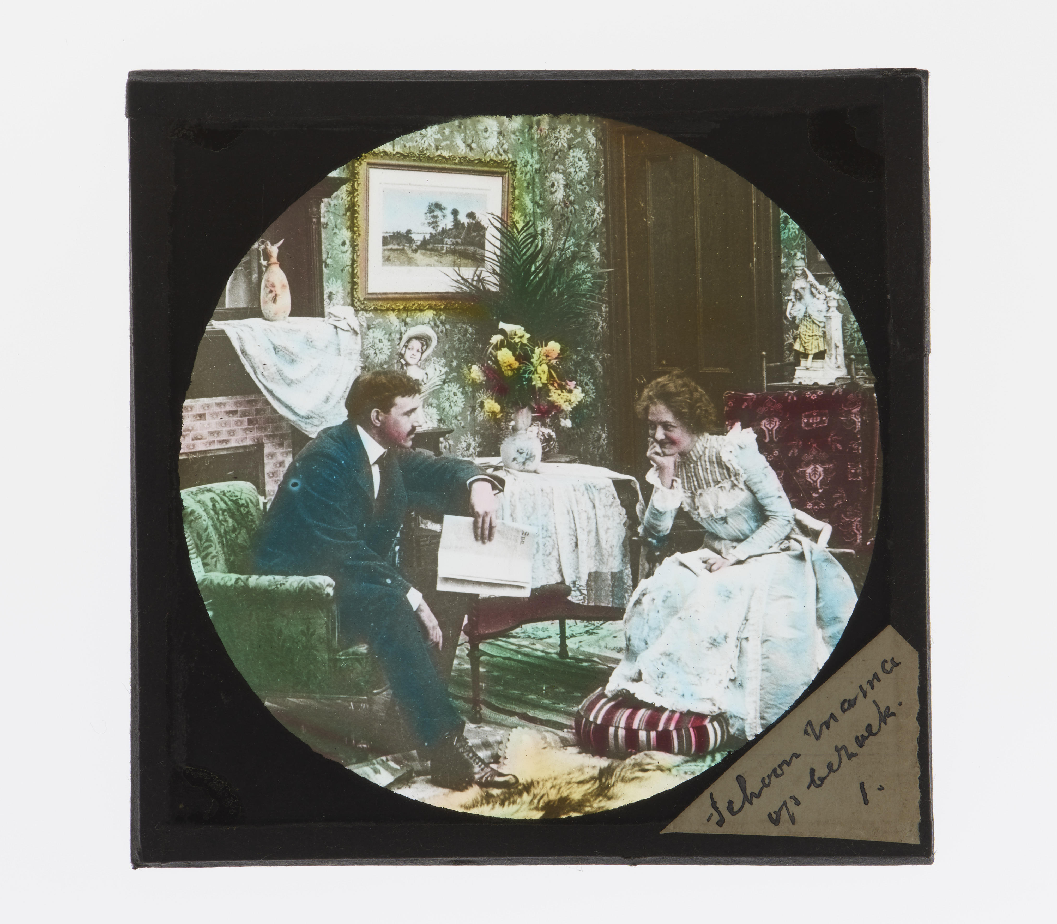 Een vrouw en een man in een interieur. Het opschrift op het etiket luidt: 'Schoonmama op bezoek 1.'