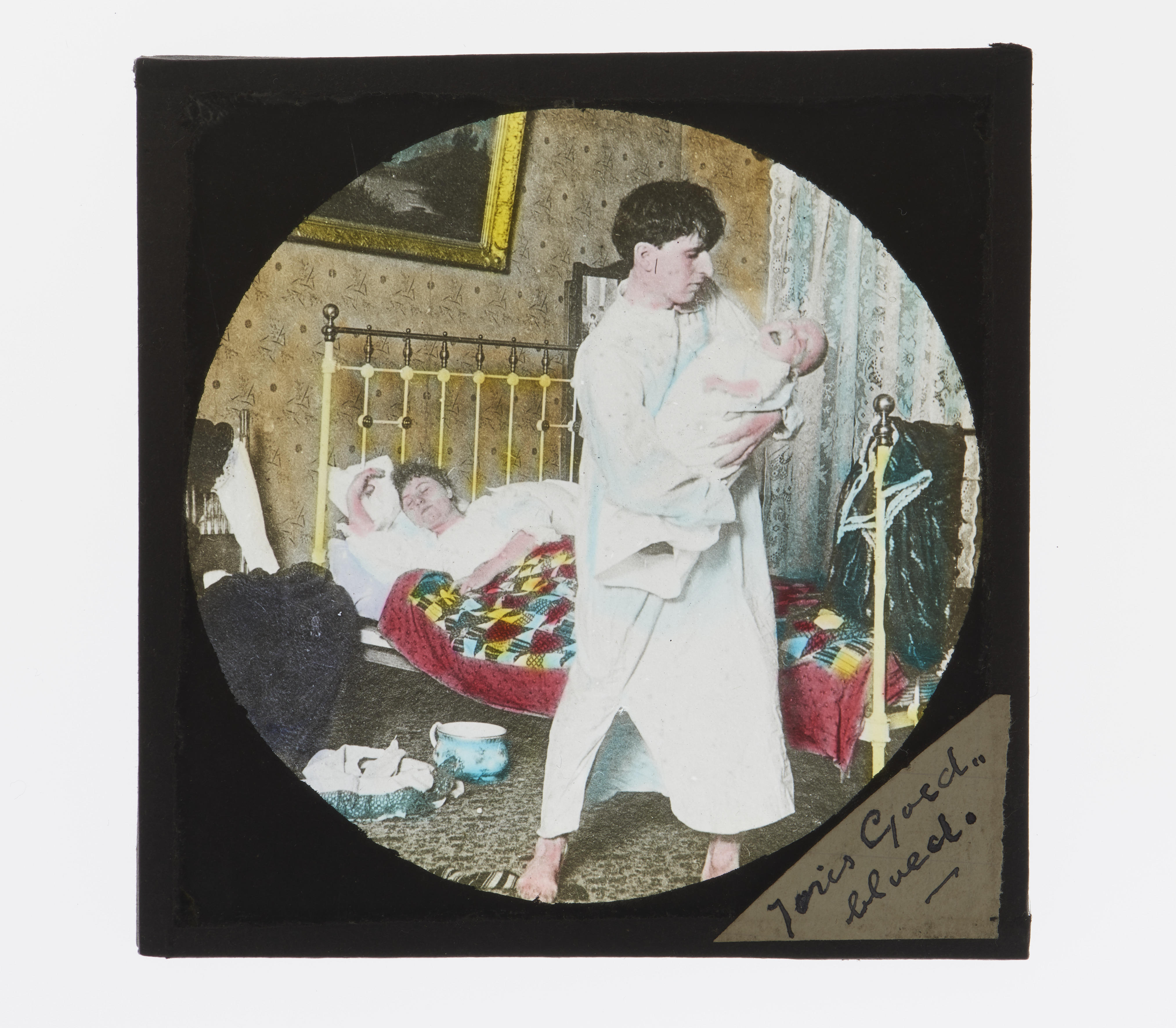 Een man met een huilende baby in een slaapkamer. Een vrouw ligt in bed te slapen. Het opschrift op het etiket luidt: 'Joris Goedbloed'.