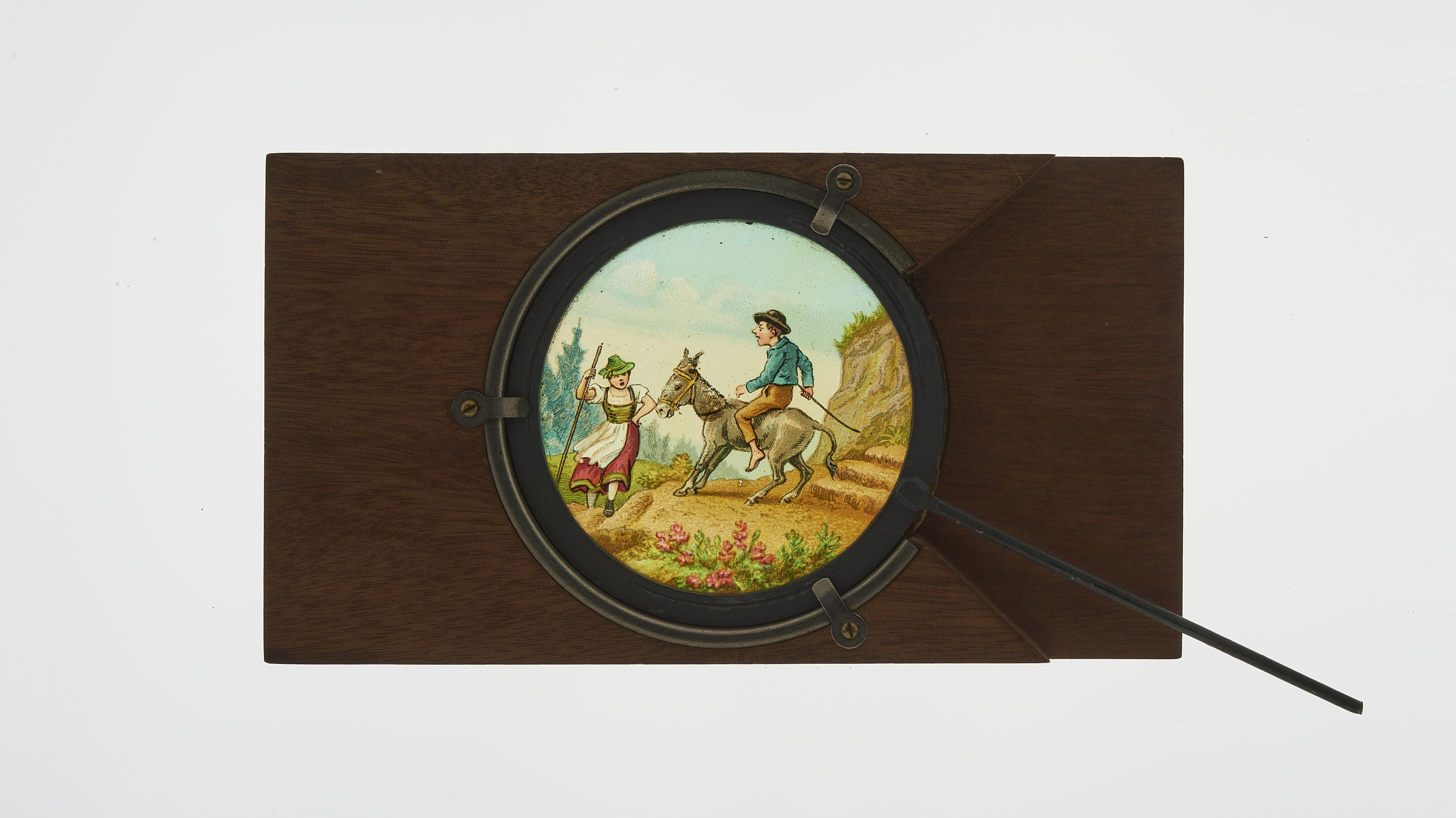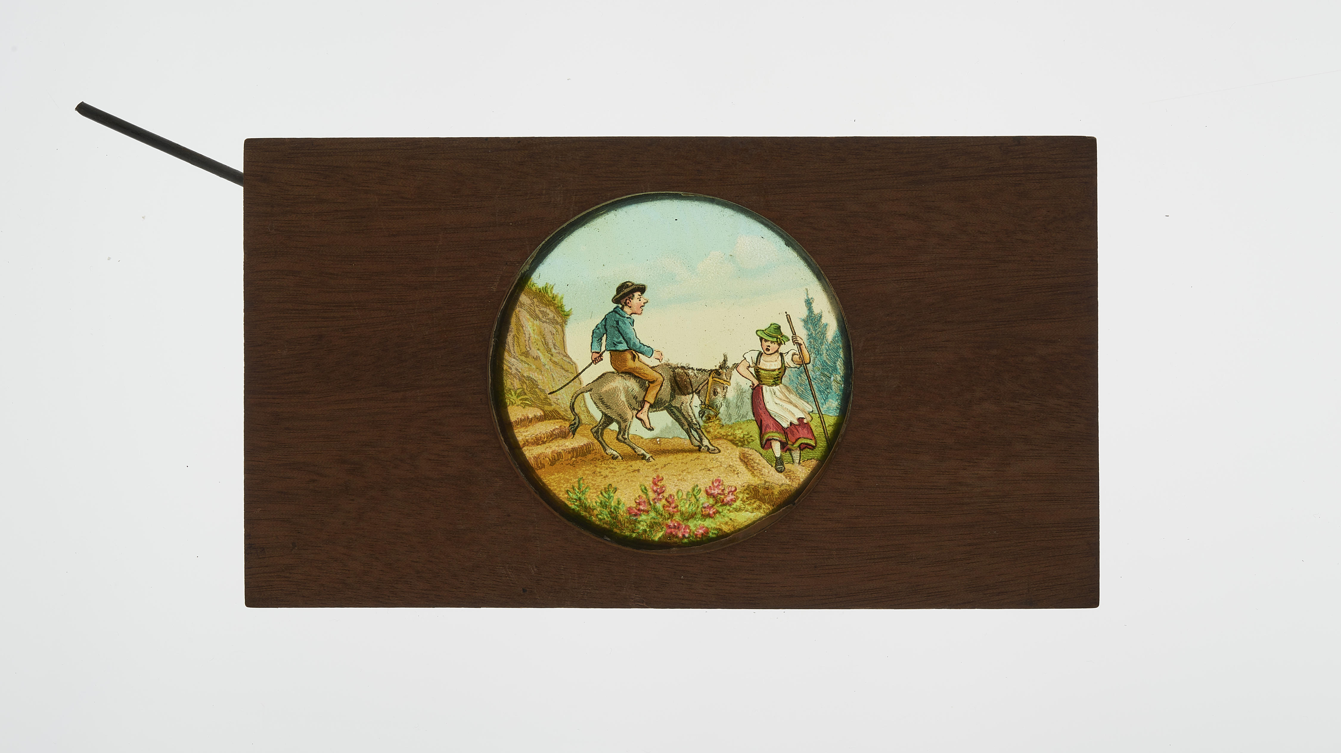 Een man zit op een ezel. Voor de ezel staat een vrouw met een stok.