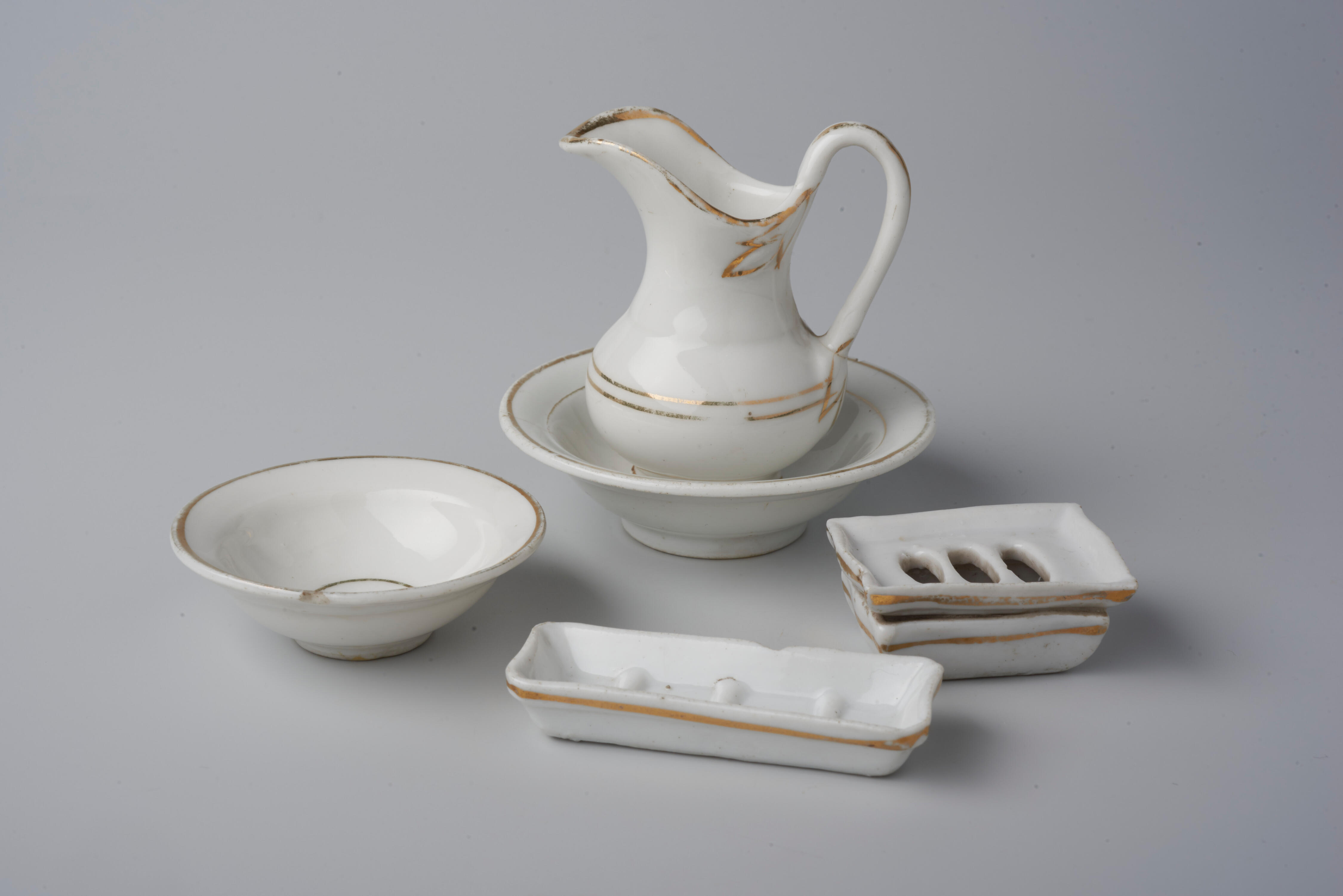 Miniatuurlampetstel van aardewerk. De set bestaat uit een waskom, kammenbakje (een deksel ontbreekt), zeepbakje met deksel en een kleinere kom. De laatste zou een po moeten zijn, maar de vorm is ongebruikelijk. Mogelijk gaat het om een extra waskom. De afzonderlijke stukken zijn verfraaid met een vergulde lijn. De kan is rijker versierd en is ...
