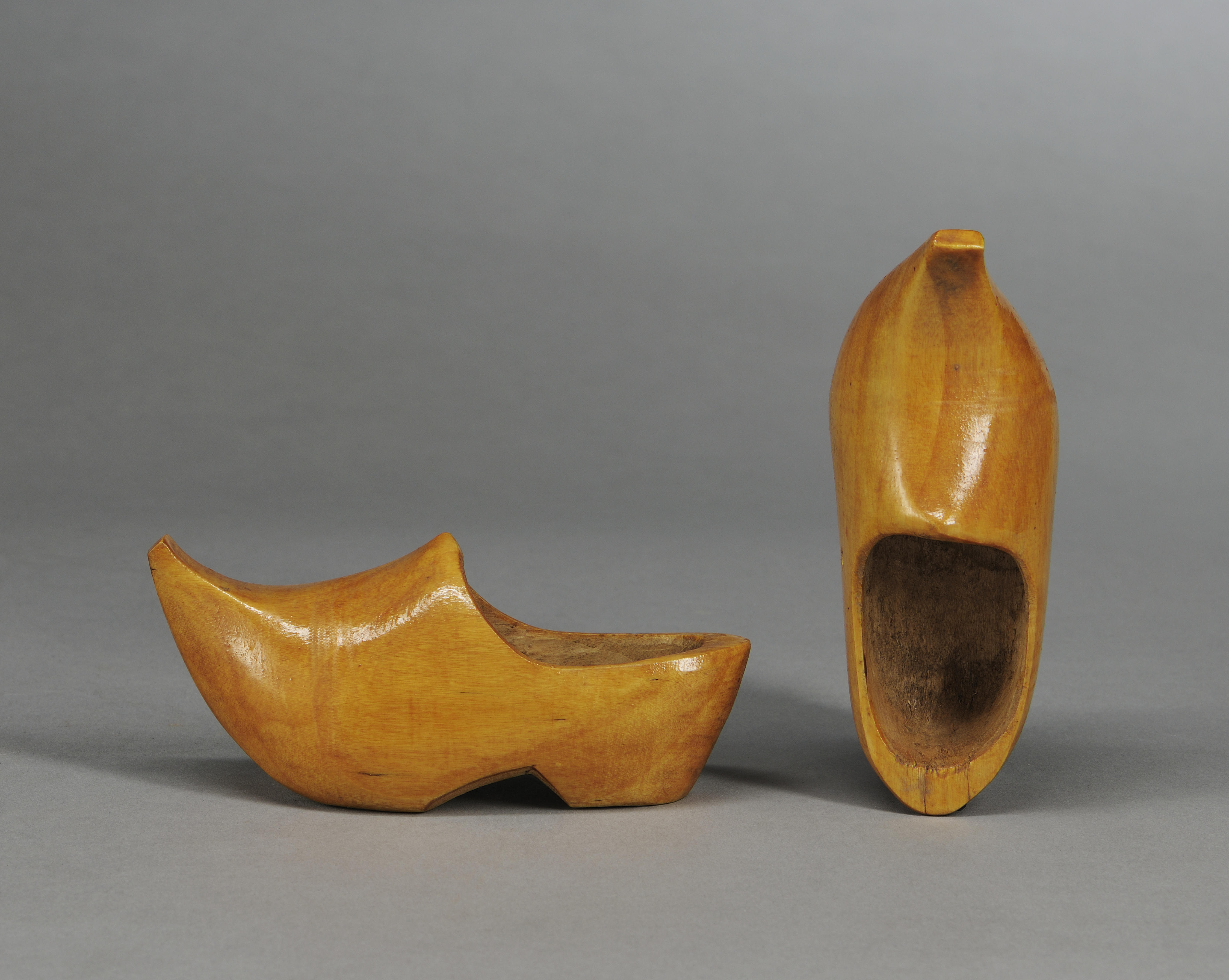 Miniatuurklomp van het model Leiderdorp. De klompen zijn van gelakt wilgenhout en met de hand gemaakt door de Nijmeegse klompenmaker J. de Kroon. Klompen van het Leiderdorper type werden veel door schippers en vissers gedragen. Meestal werden ze van wilgenhout gemaakt, omdat deze houtsoort minder water opneemt dan populierenhout. Klompen zijn niet uniek voor Nederland ...