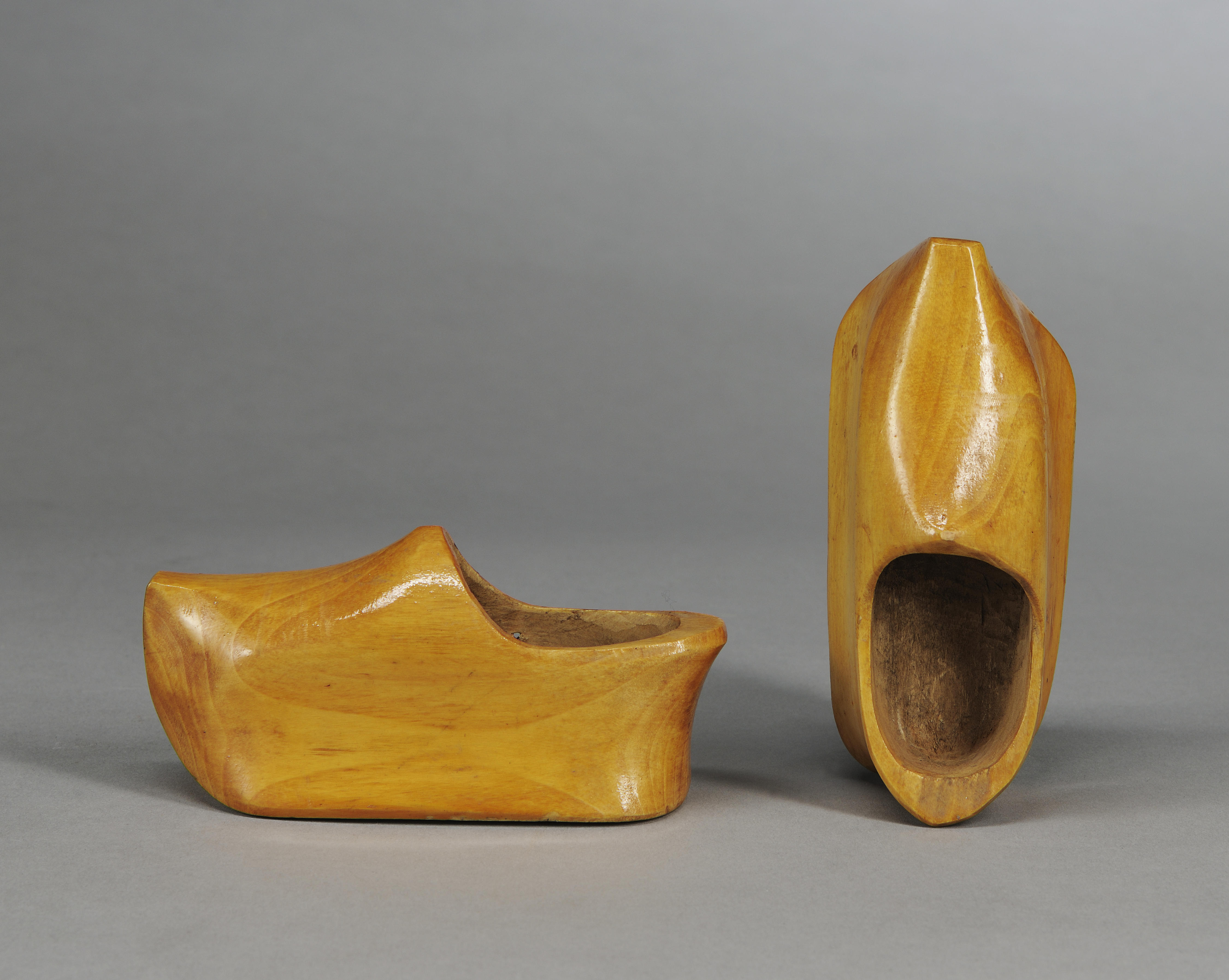 Miniatuur van Utrechtse tuindersklomp. De klompen zijn van gelakt wilgenhout en met de hand gemaakt door de Nijmeegse klompenmaker J. de Kroon. Van deze klomp is het loopvlak zo breed en plat mogelijk gehouden, vermoedelijk om de bovenlaag van ingezaaide grond gelijkmatig aan te kunnen drukken door middel van lichaamsgewicht. Dergelijk klompen zijn erg zwaar ...