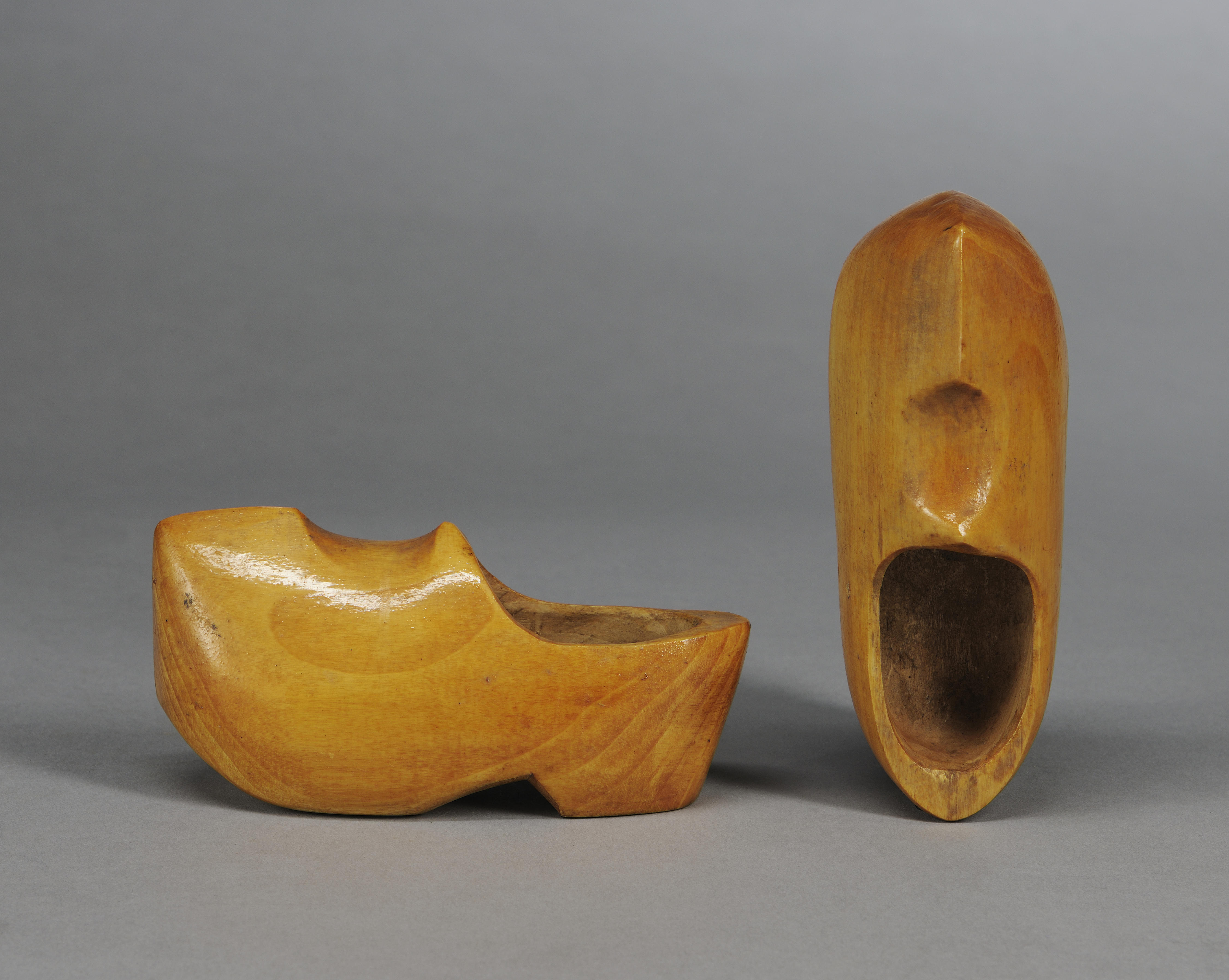Miniatuurklomp van het Rijssens model. De klompen zijn van gelakt wilgenhout en met de hand gemaakt door de Nijmeegse klompenmaker J. de Kroon. In Rijssen was men afnemer van de 'Enterse snoeteklomp', met een opvallend gevormde neus. De opstaande kam werd daar 'kroak' genoemd. Klompen zijn niet uniek voor Nederland geweest, maar er wel veel ...