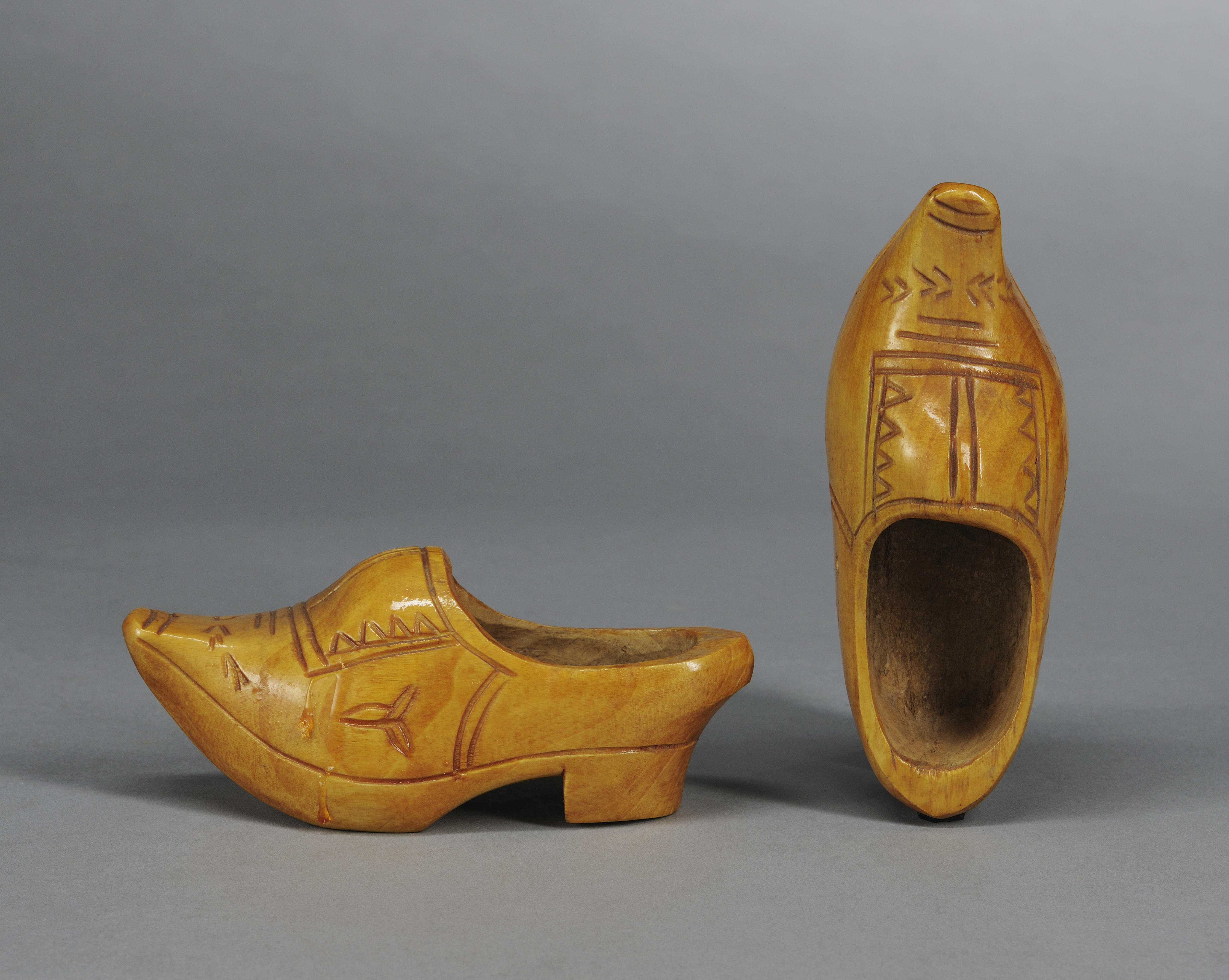 Miniatuurklomp van het Gronings model. De klompen zijn van gelakt wilgenhout en met de hand gemaakt door de Nijmeegse klompenmaker J. de Kroon. Ze zijn versierd met kerfsnijwerk. Klompen zijn niet uniek voor Nederland geweest, maar er wel veel gedragen. Het was het daagse schoeisel van mannen, vrouwen en kinderen. Mensen die het zich konden ...