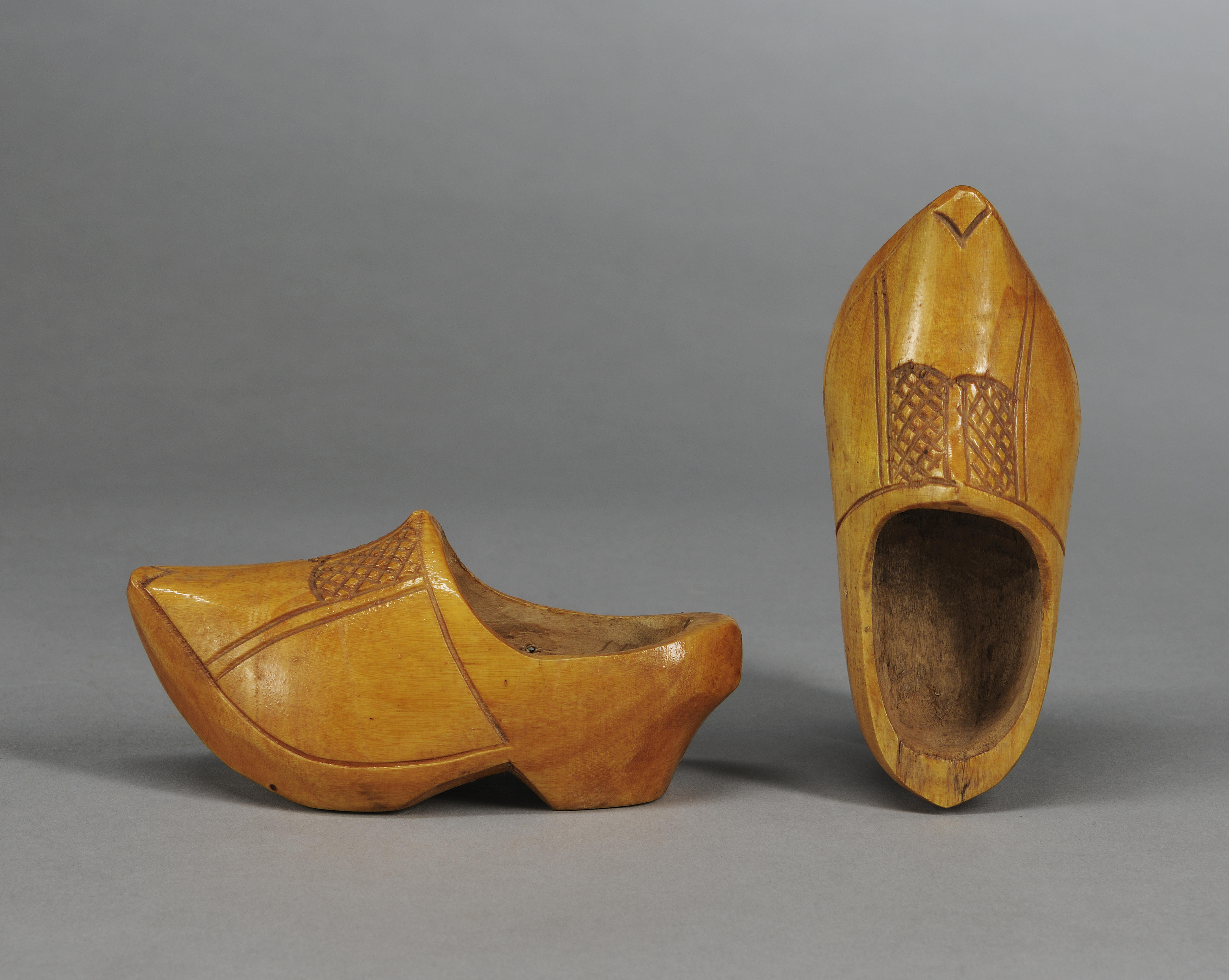 Miniatuurklomp van het model uit Gelderland. De klompen zijn van gelakt wilgenhout en met de hand gemaakt door de Nijmeegse klompenmaker J. de Kroon. Ze zijn versierd met kerfsnijwerk. Klompen zijn niet uniek voor Nederland geweest, maar er wel veel gedragen. Het was het daagse schoeisel van mannen, vrouwen en kinderen. Mensen die het zich ...