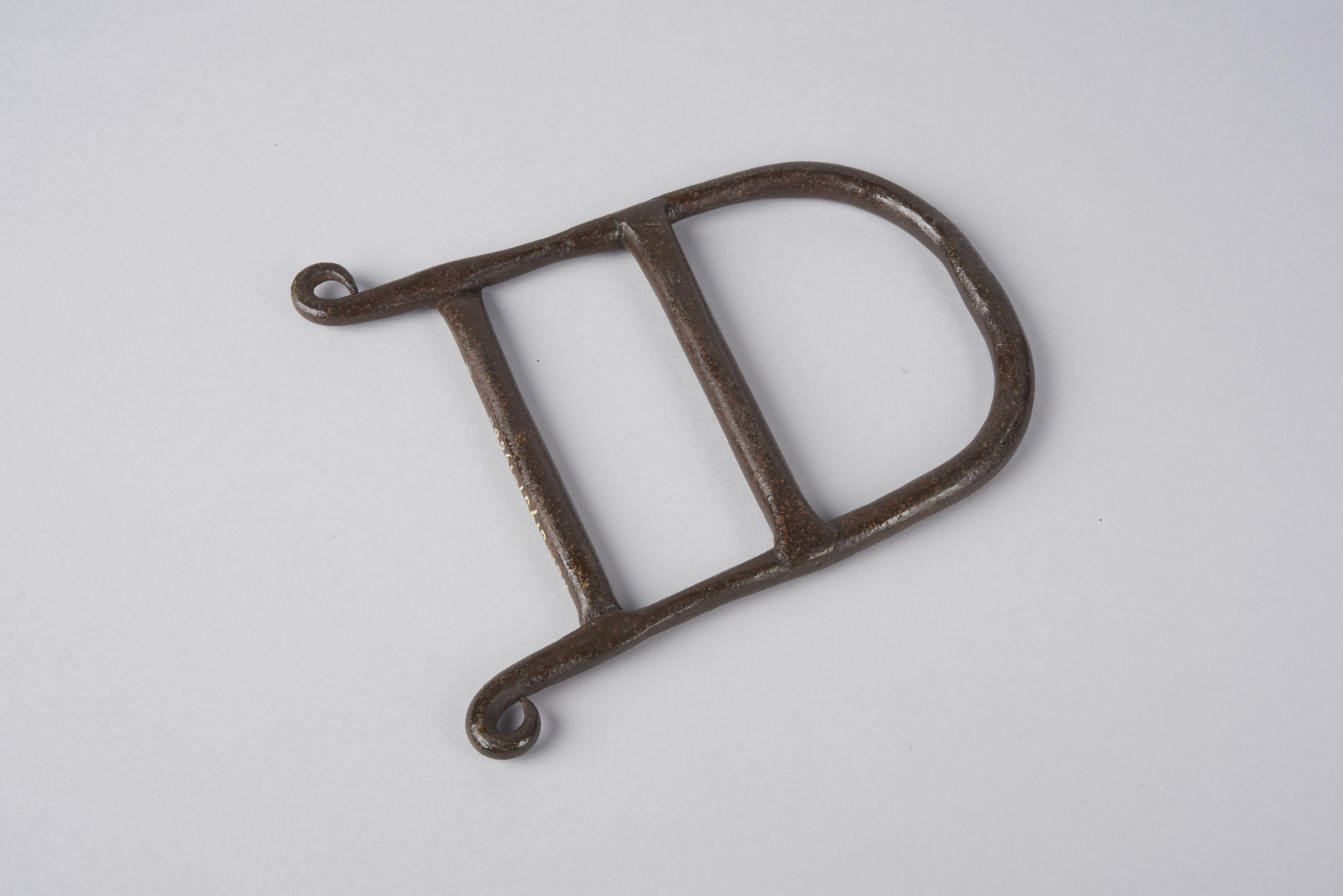 Smeedijzeren mondspiegel, gebruikt door Th. A. Poppe, hoefsmid in Zwolle. Met deze mondspiegel zette Poppe de mond van het paard open door de spiegel eerst horizontaal in te brengen en daarna in verticale stand te draaien. Vervolgens kon hij ongehinderd zijn hand in de mond van het paard steken om het gebit te controleren op ...