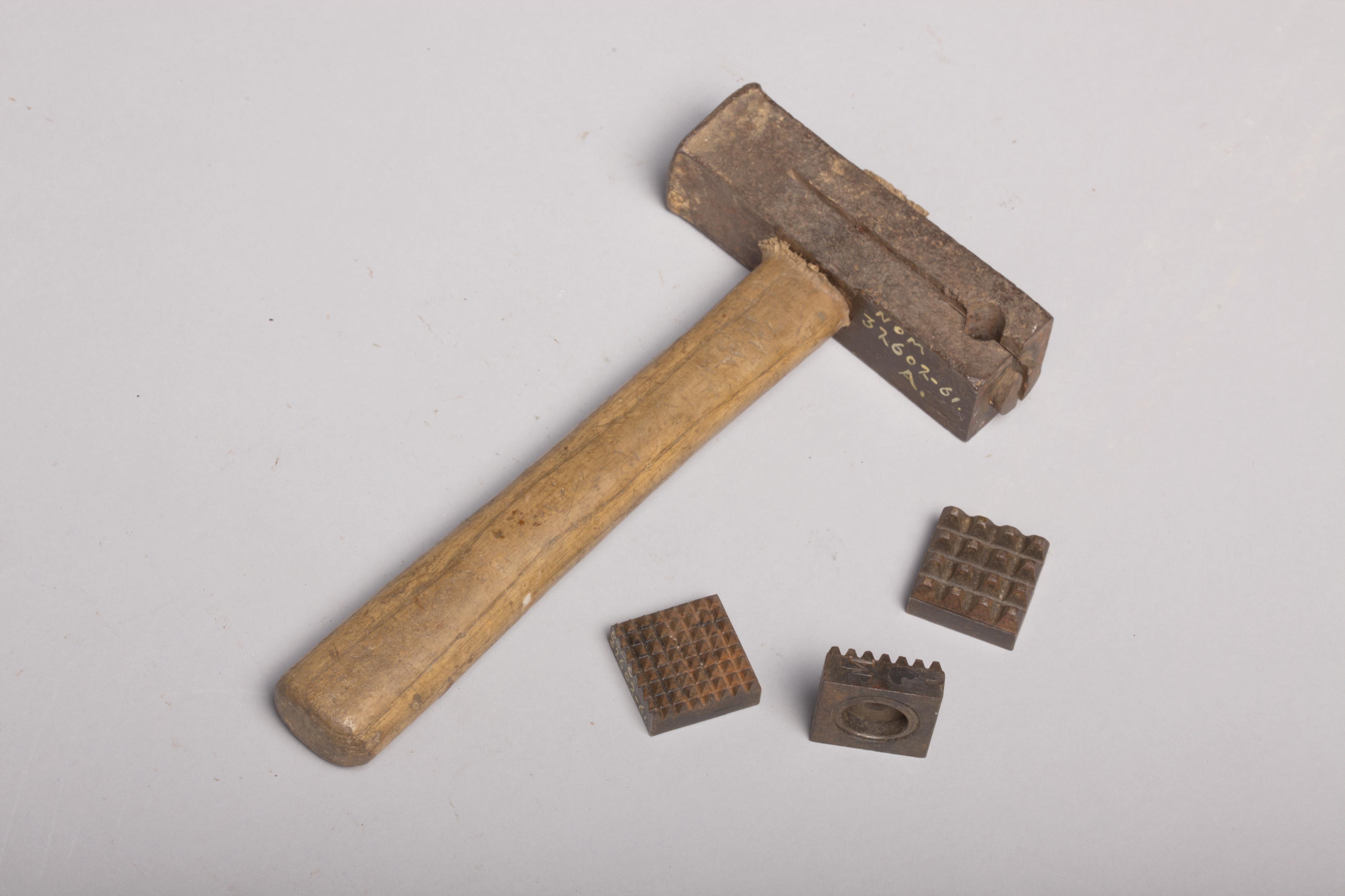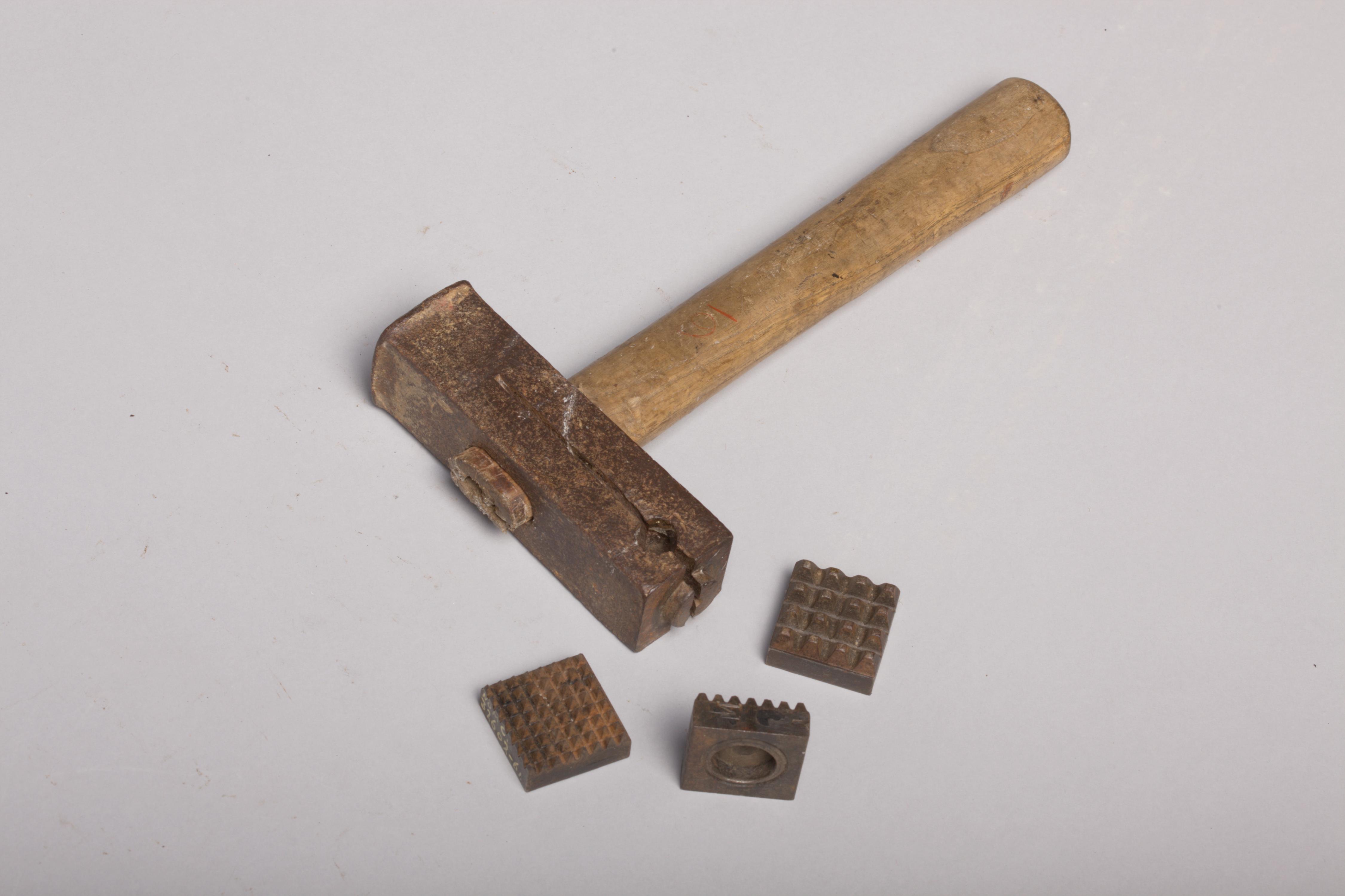 Bouchardhamer met drie verwisselbare banen. Op het midden van de metalen hamerkop zit een beukenhouten steel. De hamerkop heeft aan één kant, in het midden over de lange zijde, tot aan de wig een spleet en een gat. Door een metalen pen in het gat te steken kan de hamerkop iets uit elkaar gedrukt worden ...