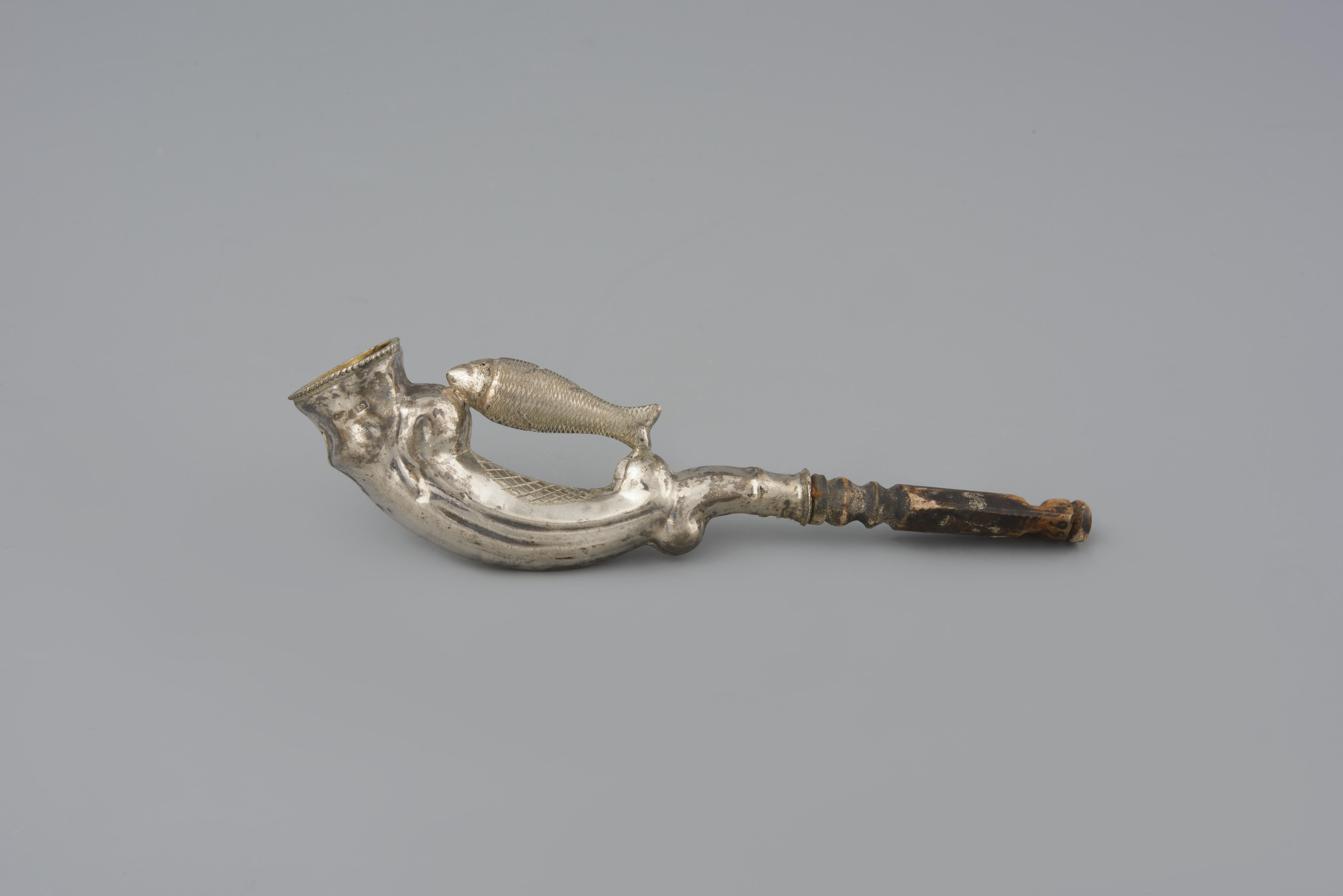 Sigarenpijpje van eerste of tweede gehalte zilver, gemaakt tussen 1906-1918. Dit model met een vis komt minder vaak voor dan pijpjes met paarden en scheepjes. Het pijpje is toegeschreven aan edelsmid de weduwe H. Zieldorff uit Schoonhoven.