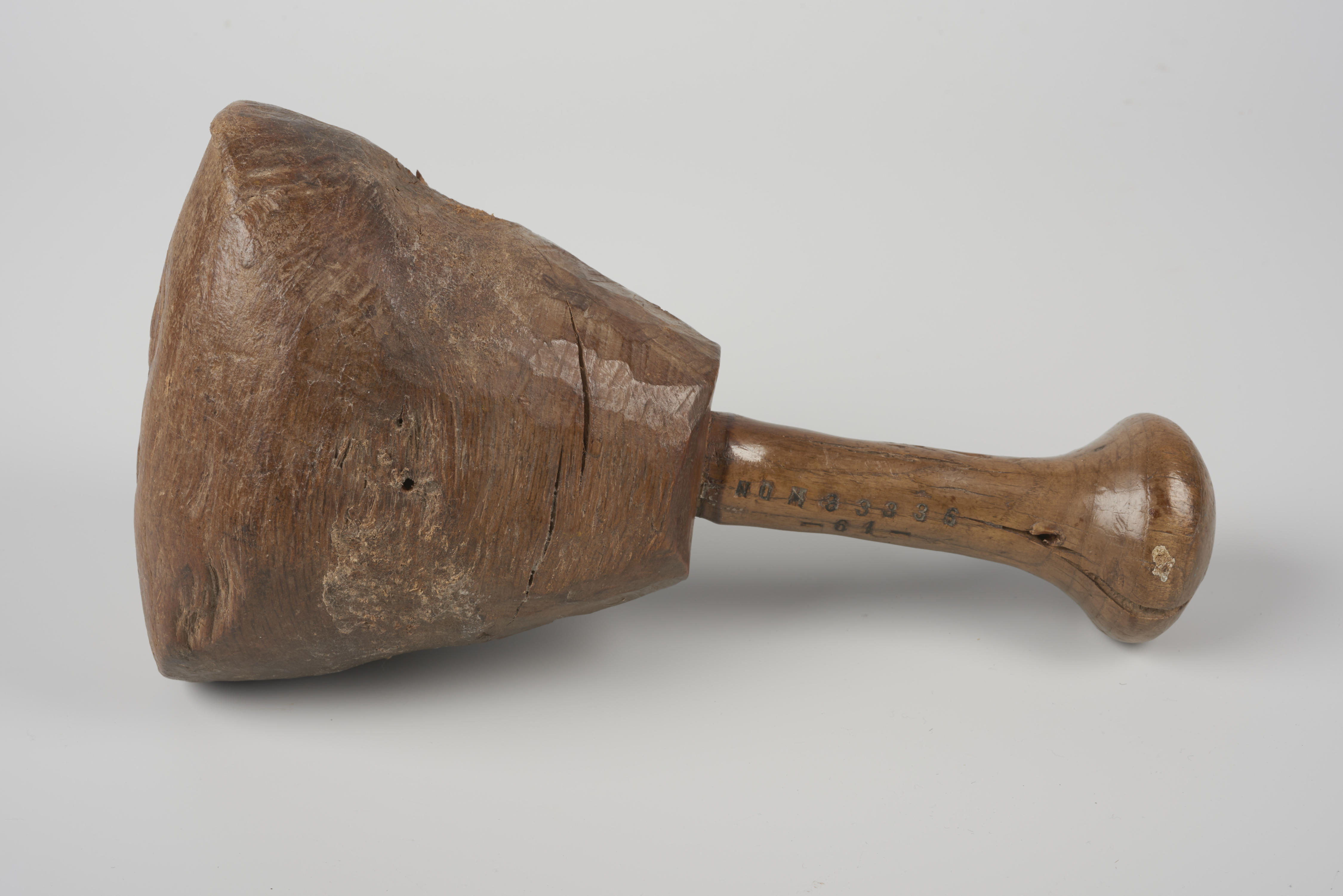 Houten steenhouwershamer met een kenmerkende korte steel en een grote, ronde kop die naar de steel taps toeloopt. Door deze schuine banen kan de beitel van de steenhouwer altijd recht geraakt worden. De kop vertoont duidelijke vervaardigings- en gebruikssporen.