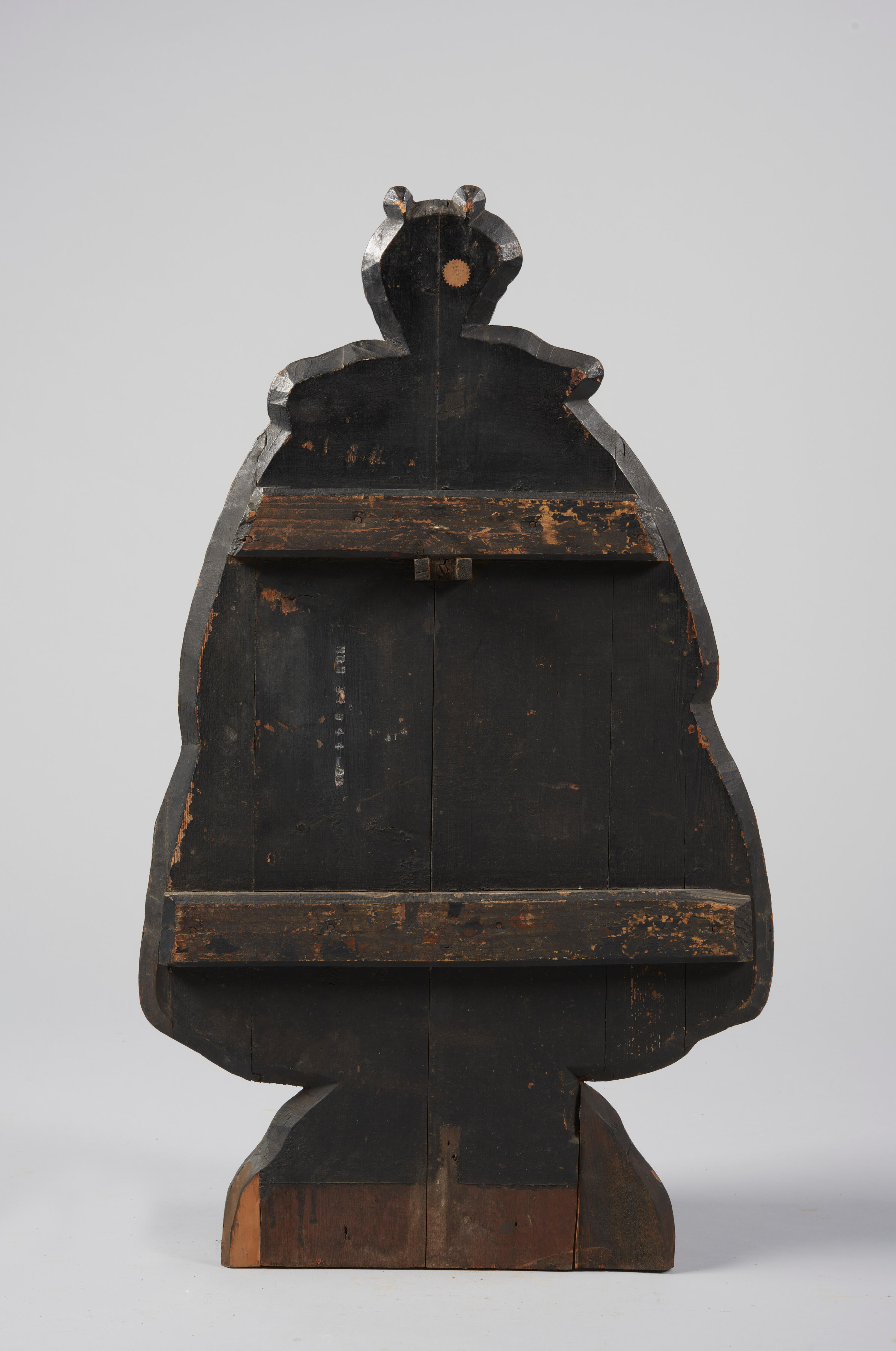 Een vurenhouten haardfiguur in de vorm van een vrouw in Scheveningse streekdracht. Haardfiguren werden in de haardopening geplaatst wanneer er geen vuur brandde.