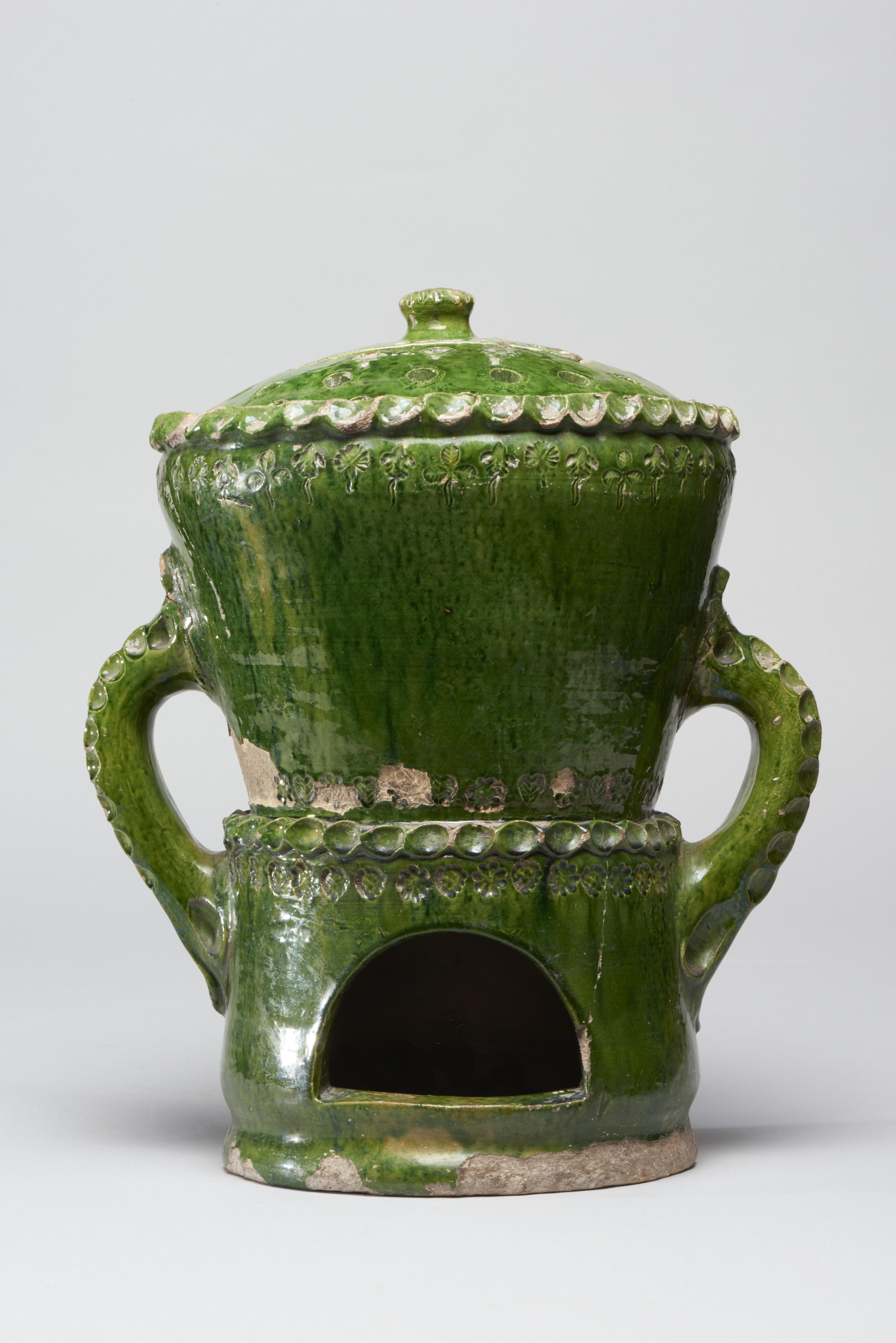 Kachel, versierd met rozetten. Het voorwerp is misschien ook gebruikt voor het drogen van luiers.