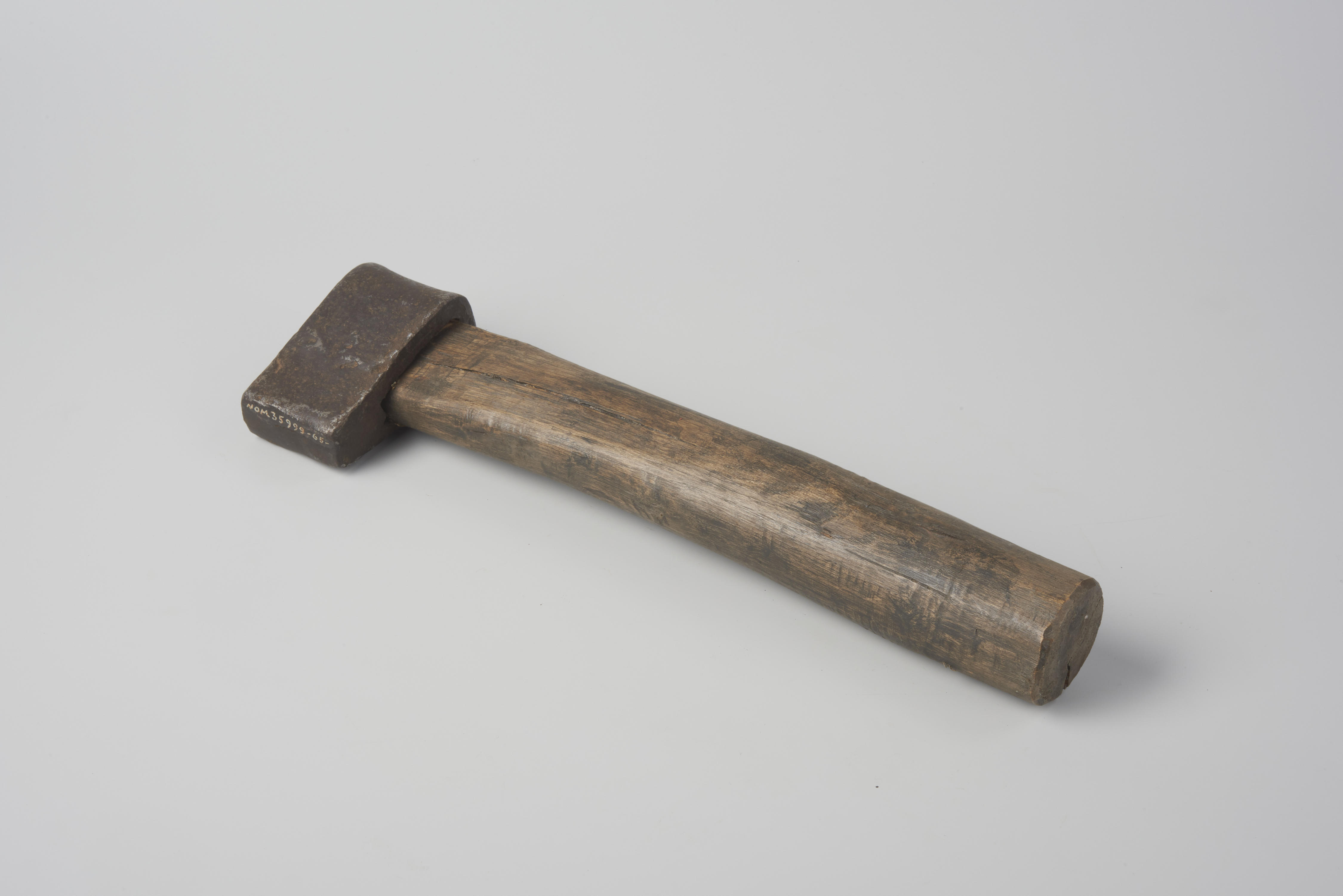 Bijlvormige eekhamer voor het bastkloppen van eikenbomen ter winning van looistoffen. De hamer heeft een metalen kop en beukenhouten steel. Hij is gebruikt door een eekschiller.