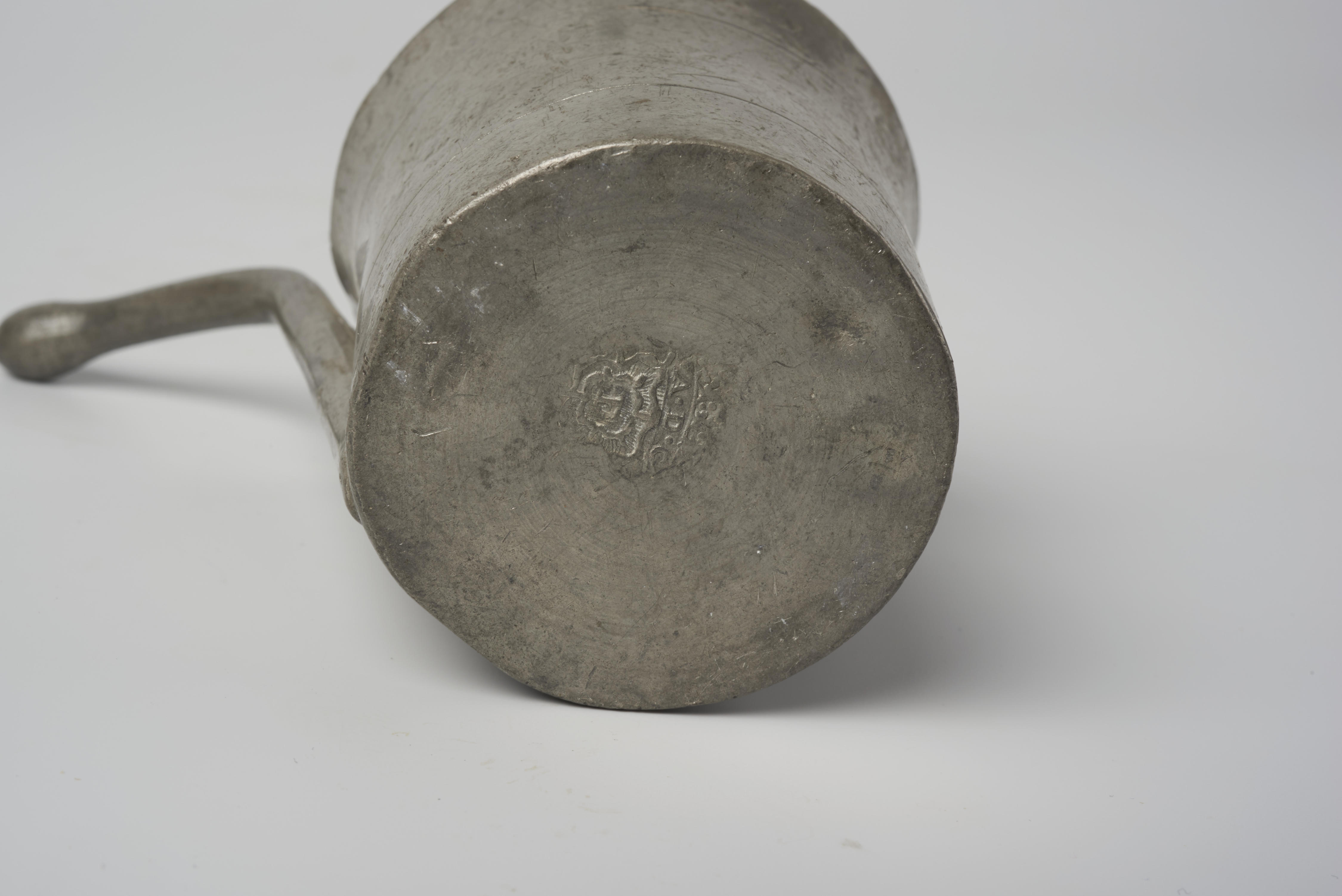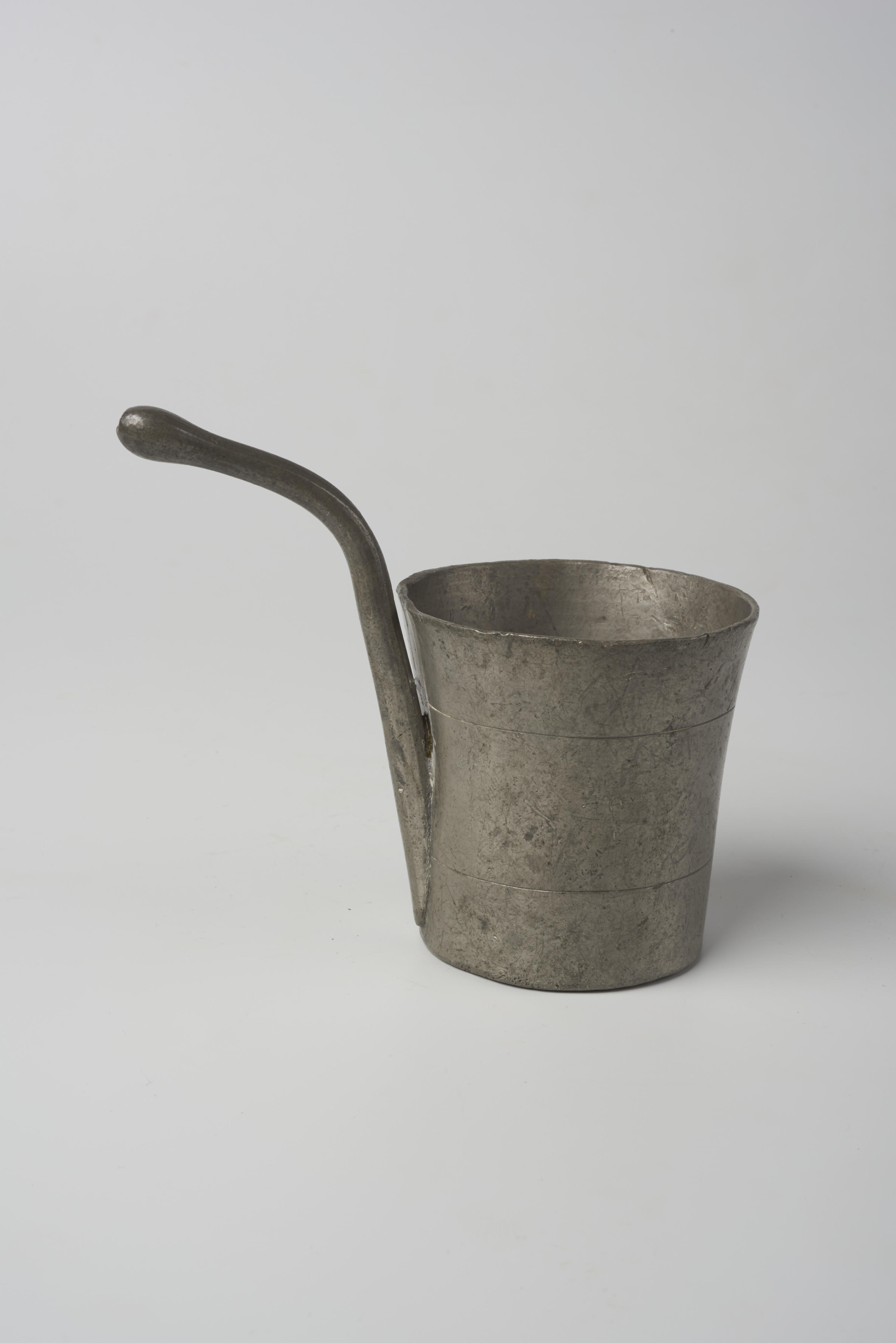 Tinnen ziekenbeker, onderop gemerkt met een gekroonde roos met in het hart van de roos de letter F voor 'fijn tin' en in de band van de kroon de gietersinitialen 'ADC' van P.A. de Caes in Utrecht.