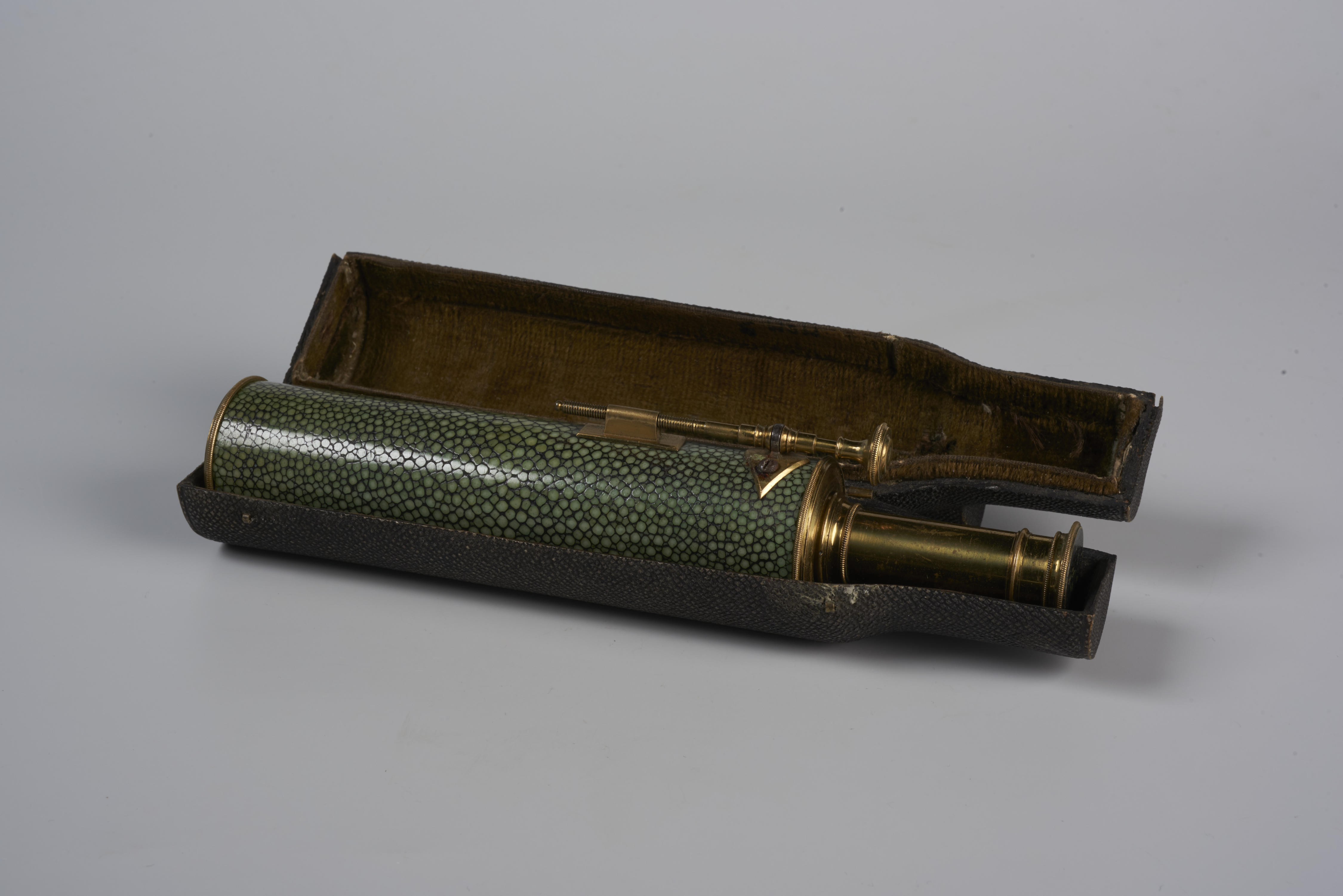 Verrekijker, gemaakt van messing en bekleed met groen gepolijst haaienleer. Het foudraal bestaat uit een kartonnen koker die bekleed is met zwarte roggenhuid en gevoerd is met bruin fluweel.