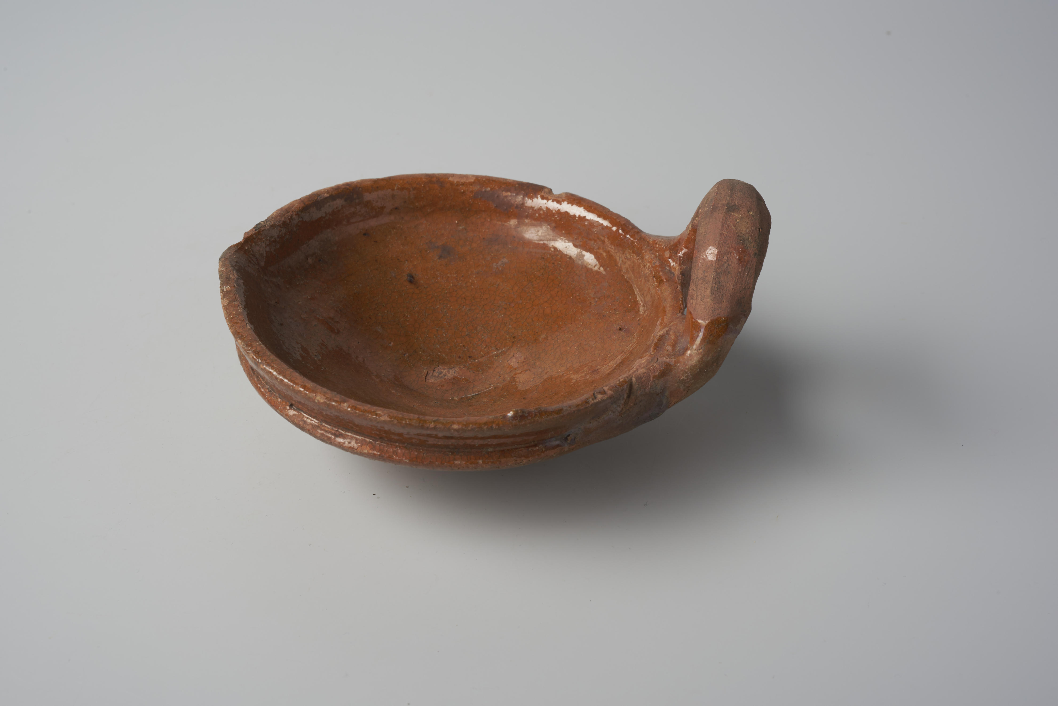 Aardewerken olielamp van roodbakkende klei. De olielamp bestaat uit een bak met een schenklip en een hangoor. De olielamp heeft resten van een loodglazuren laag. De kaars die in het bakje zat, werd gemaakt van dierlijk vet of bijenwas. Door een pit (doorgaans van mos of in elkaar gedraaide vezels) in vloeibaar gemaakte restje vet ...
