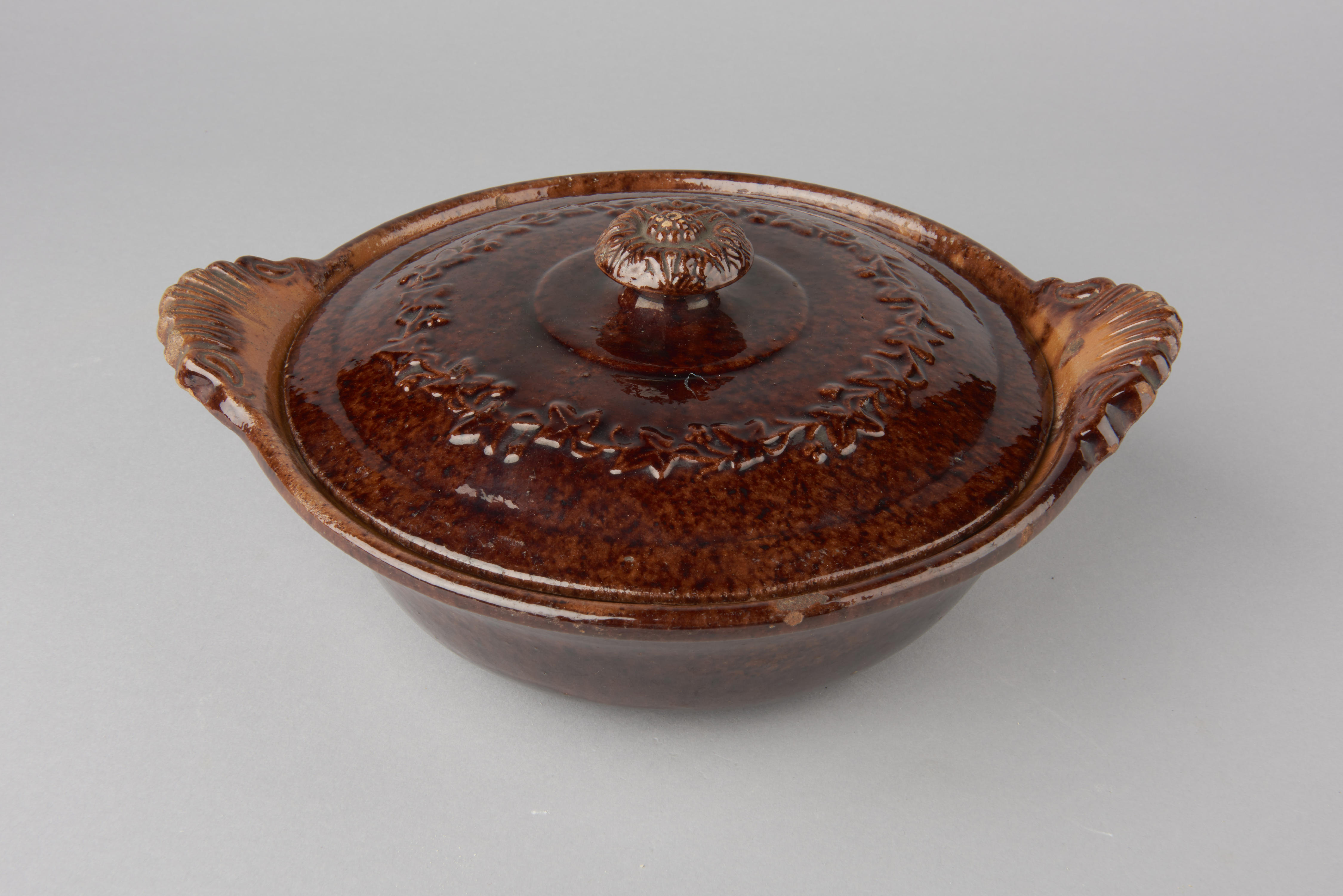 Pan met deksel, versierd met plantaardige ornamenten.