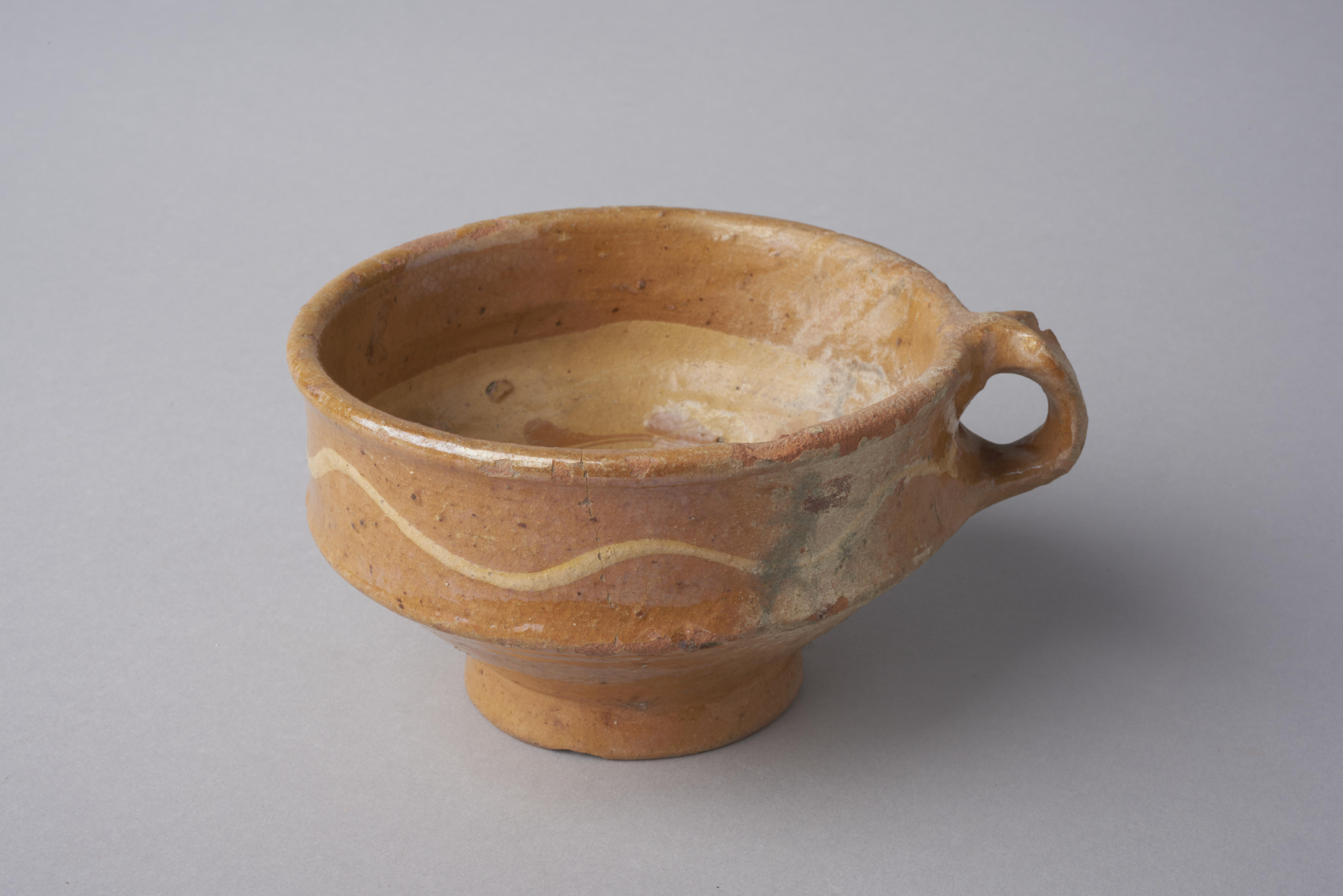 Geel geglazuurde vuurtest van roodbakkende klei. Op de buitenrand is een eenvoudige slingerlijn aangebracht ter decoratie. In de test werden kolen geplaatst, waarna het geheel in een voetenstoofje ging. In de bodem van de vuurtest zitten gebruikssporen.