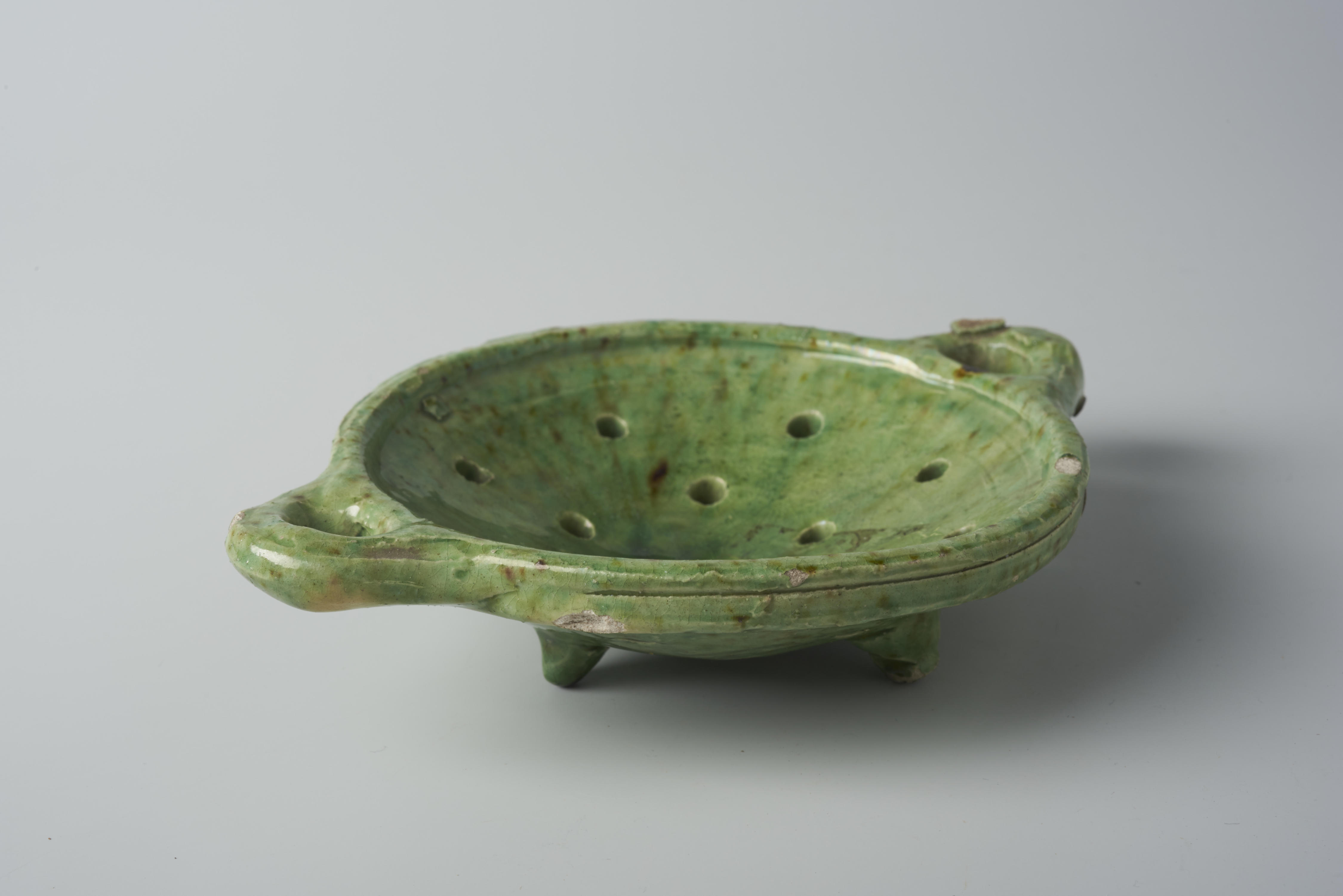 Groen geglazuurd speelgoedvergiet van Goedewaagen. Dit vergiet is onderdeel van een kinderservies dat wordt aangeboden in de Goedewaagen Star catalogus uit 1910. De vormgeving gaat terug op algemene archaïsche vormen en eeuwenoude modellen van Nederlands gebruiksaardewerk. Het servies is Gouds-groen geglazuurd.