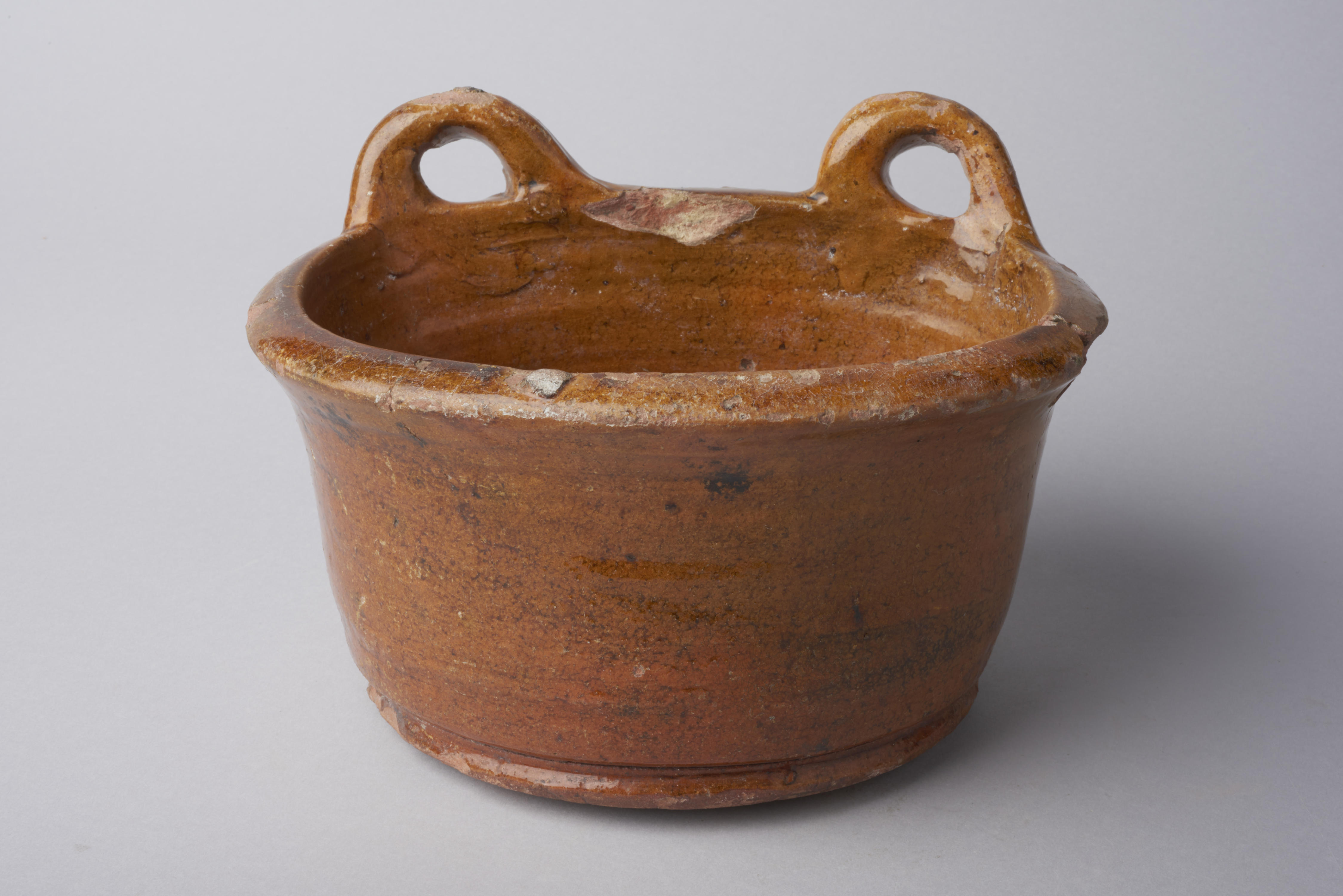 Zeepkop met aan de achterzijde twee gebogen ophangogen, vermoedelijk gebruikt voor het bewaren van groene zeep of iets dergelijks.