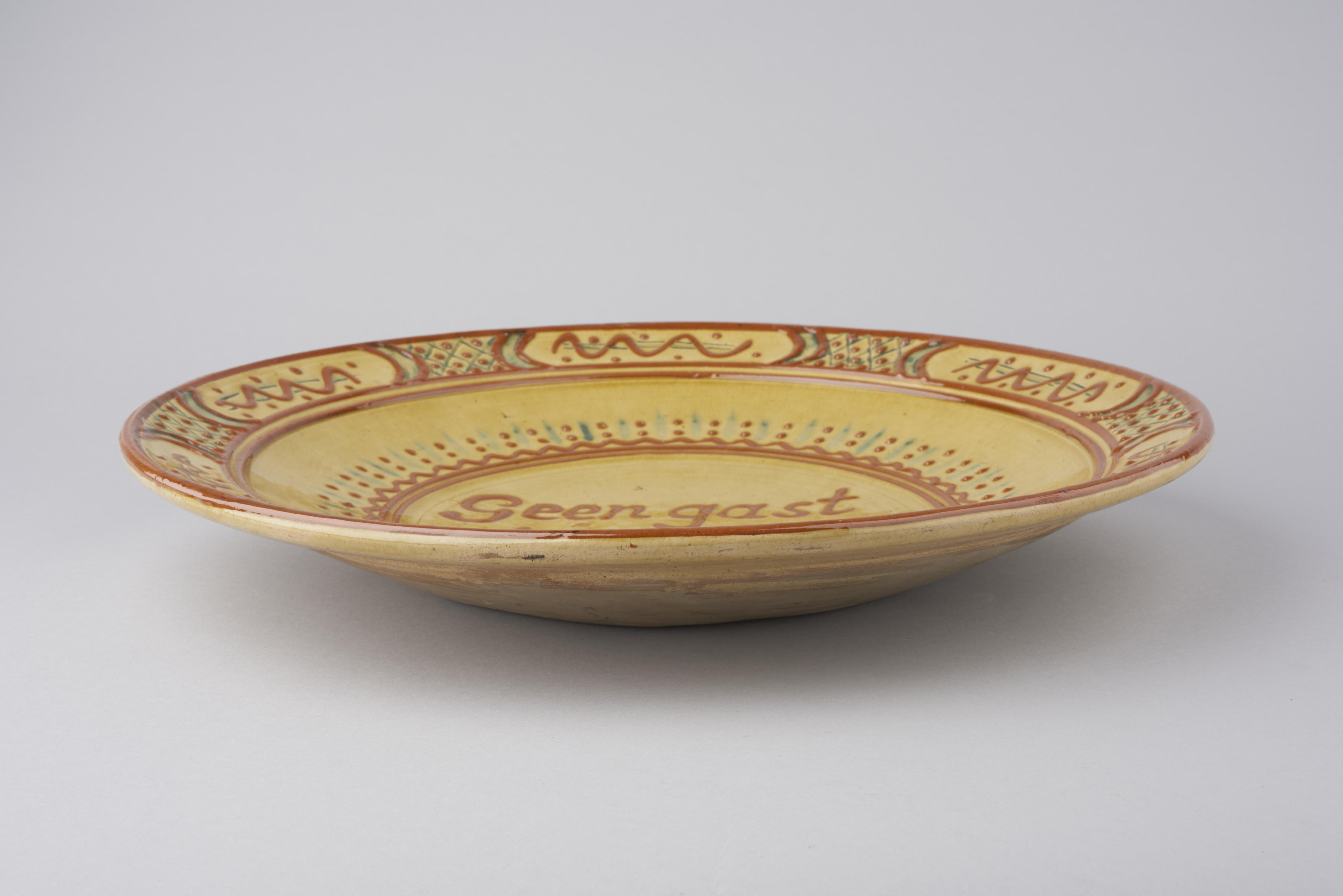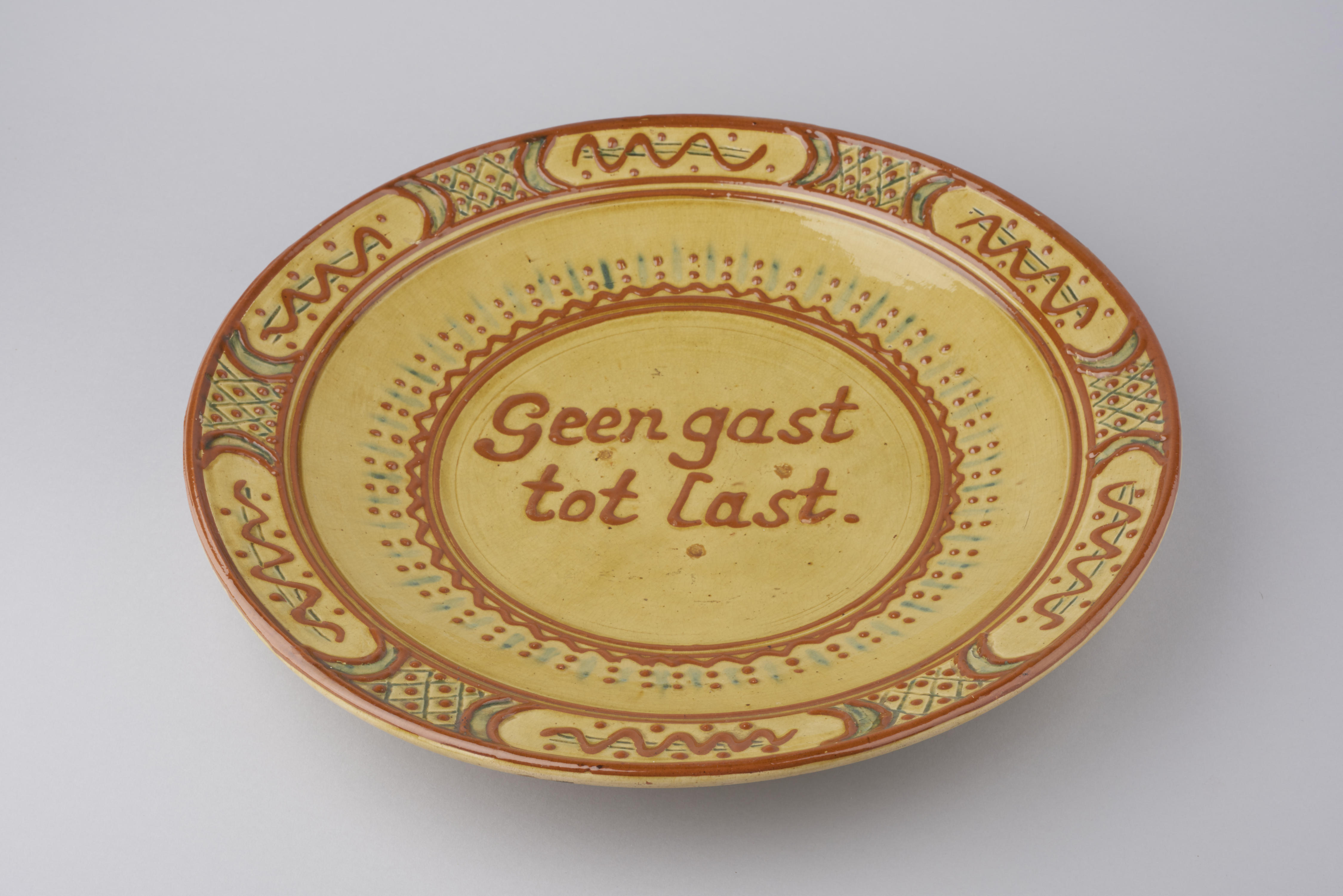 Schotel, versierd met geometrische ornamenten en het opschrift: 'Geen gast tot last.' De schotel heeft de vorm van het gewone gebruiksgoed, maar is gezien het opschrift en ophangoog als sierobject bedoeld.