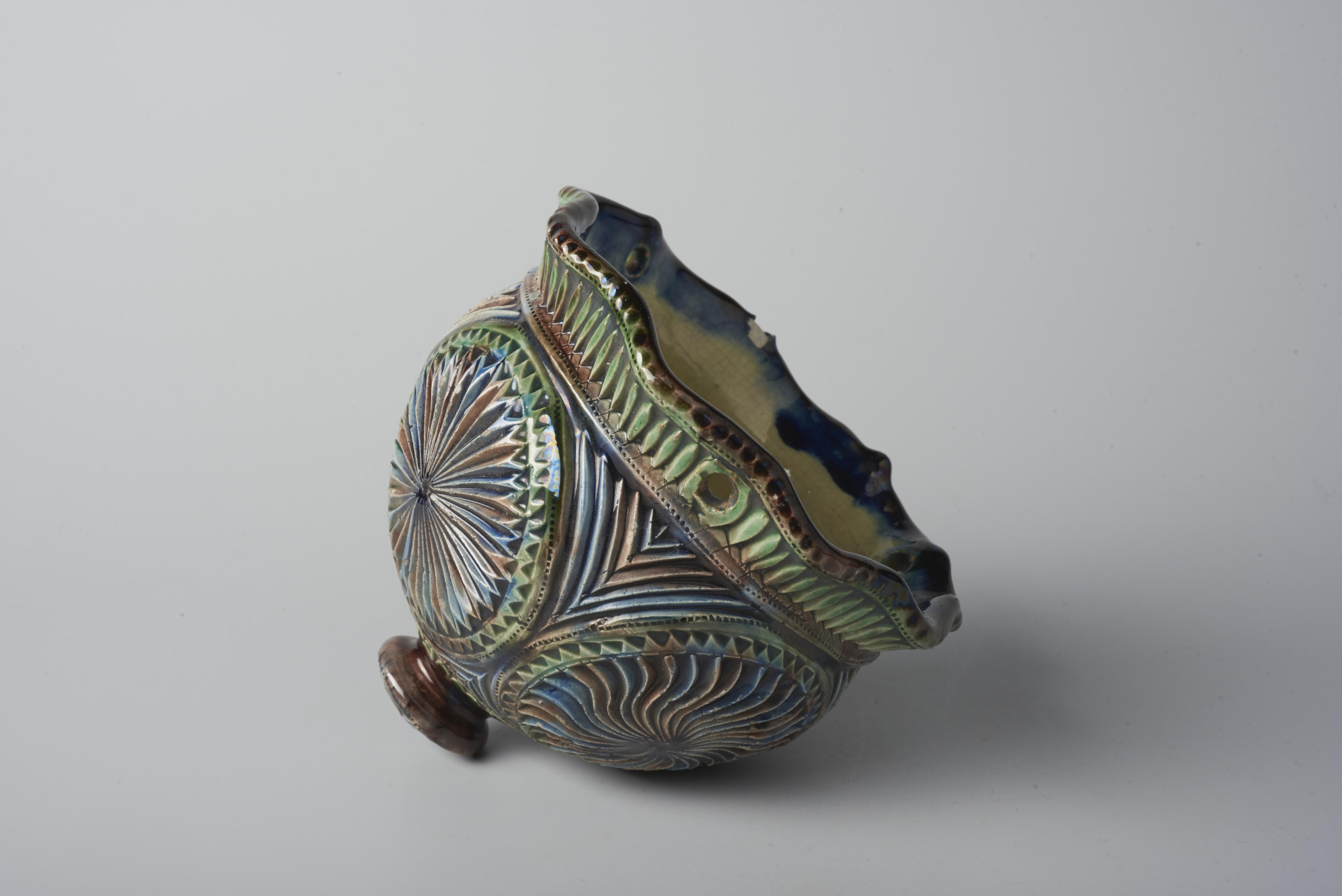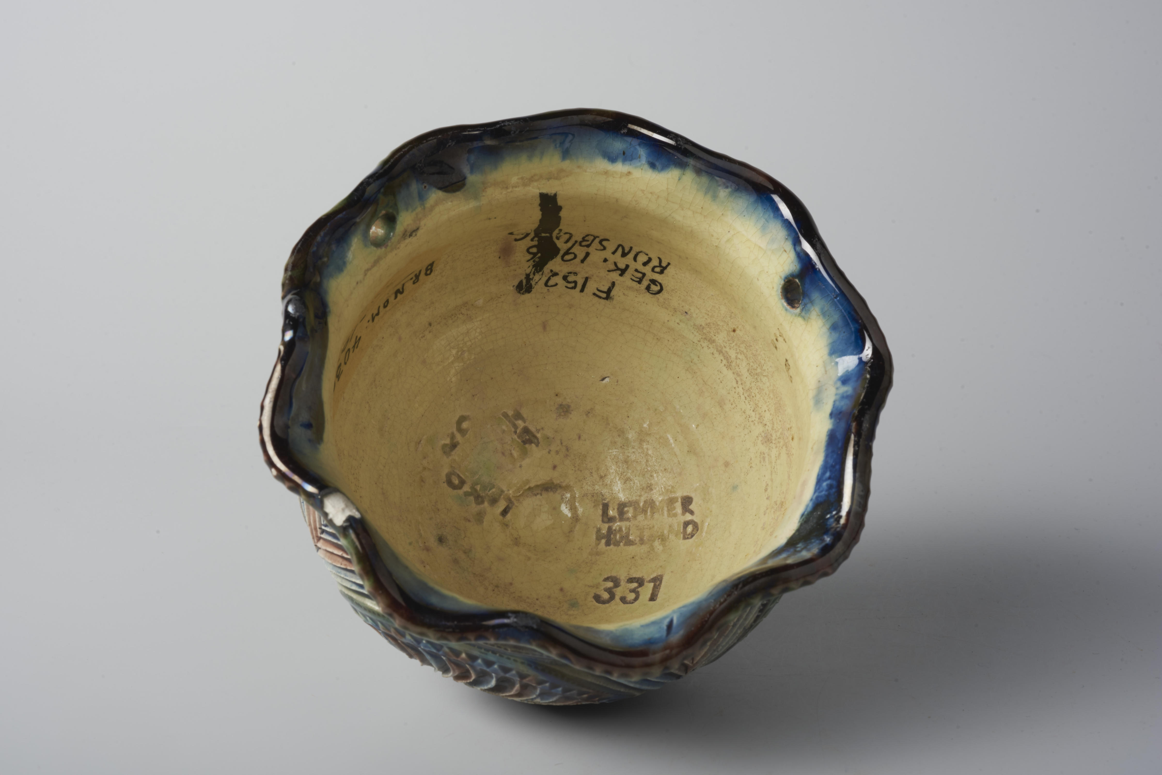 Bloempothanger, versierd met geometrische ornamenten. De hanger draagt het merk: 'Lemmer, Holland, 133'.
