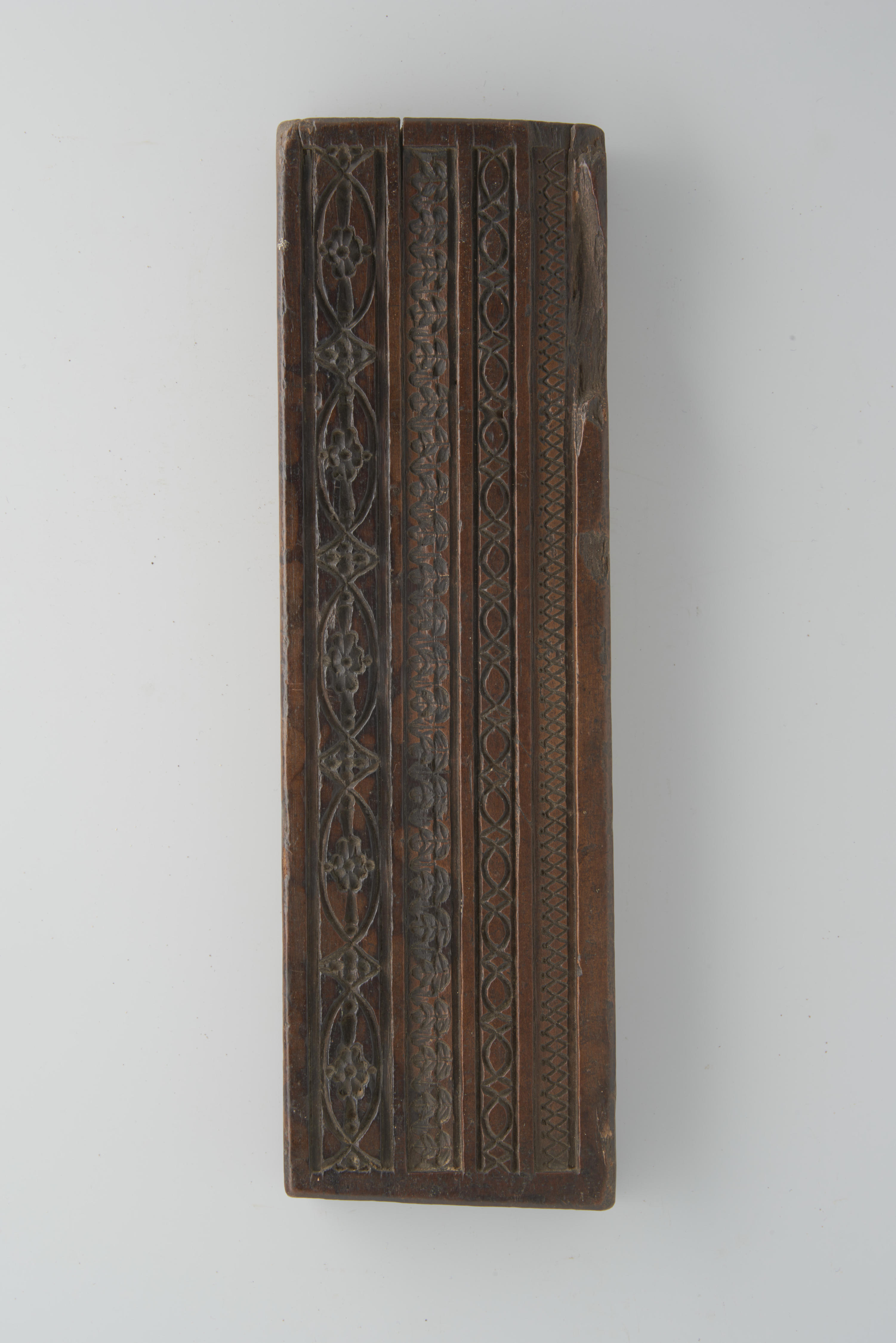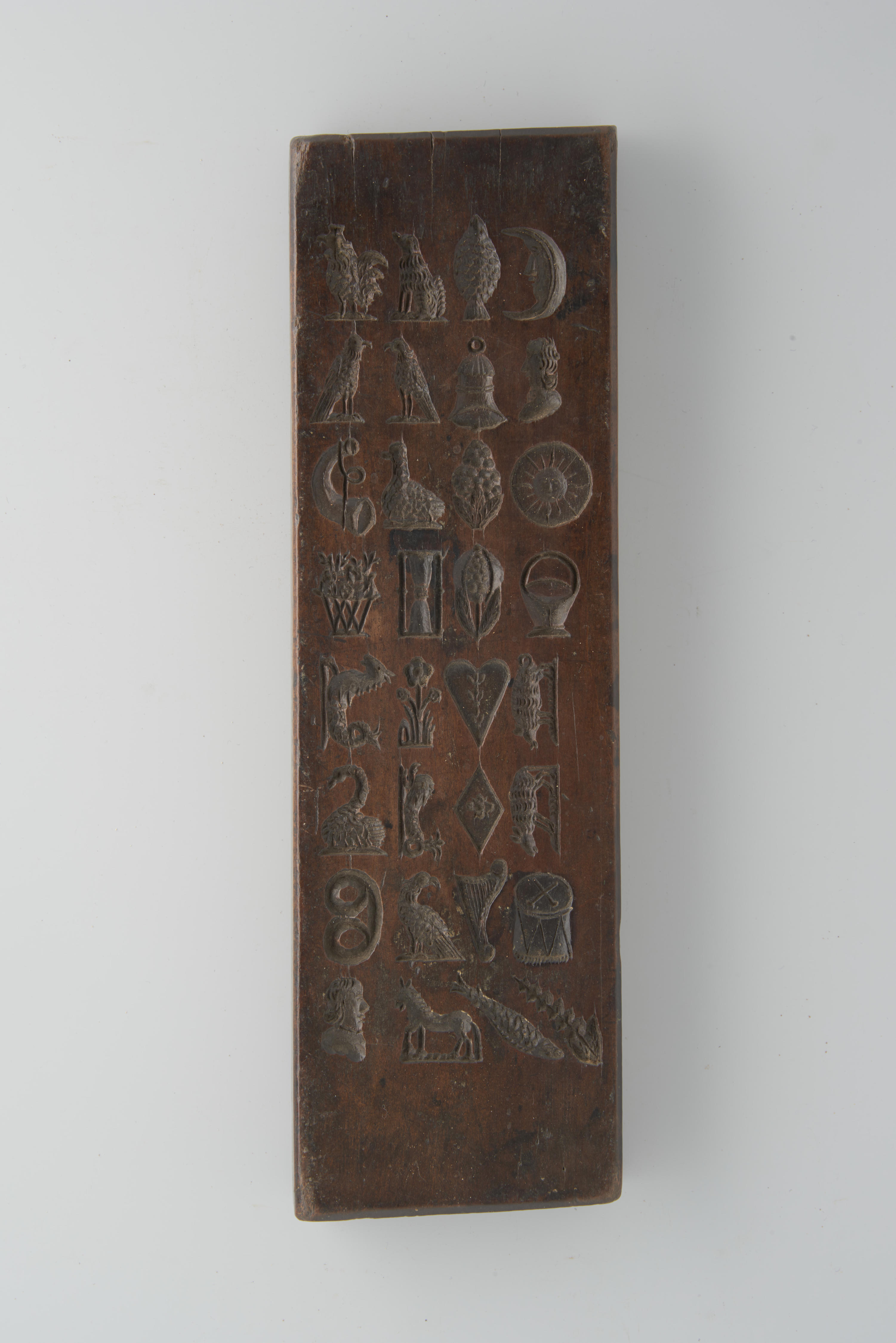 Houten suikerwerkplank. De plank is aan één zijde besneden met 34 voorstellingen, waaronder een halve maan, een zon en een hart. De andere zijde van de plank is besneden met vier banen waarin verschillende motieven gesneden zijn.