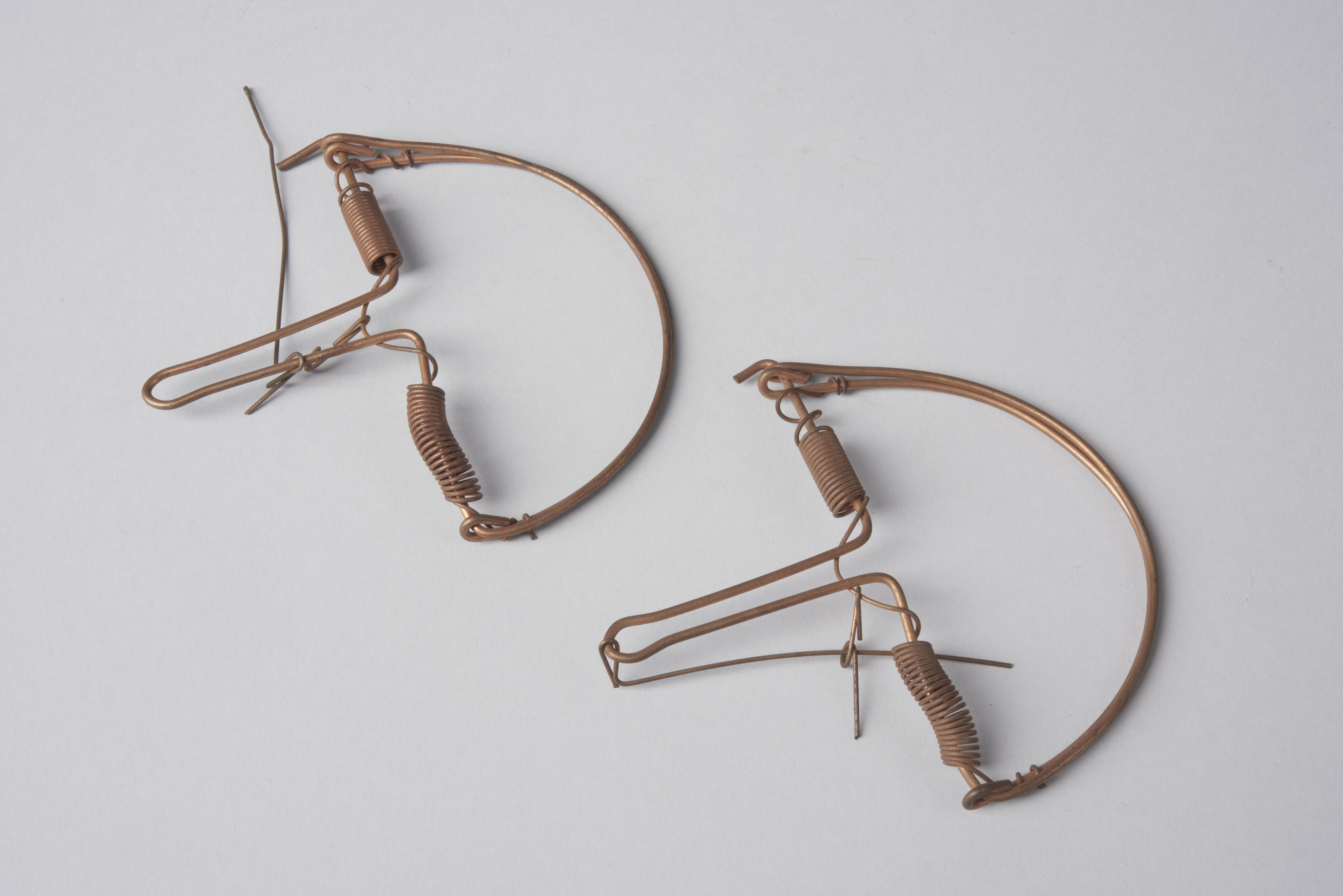 Twee mussenklemmen, vervaardigd van verkoperd ijzerdraad.