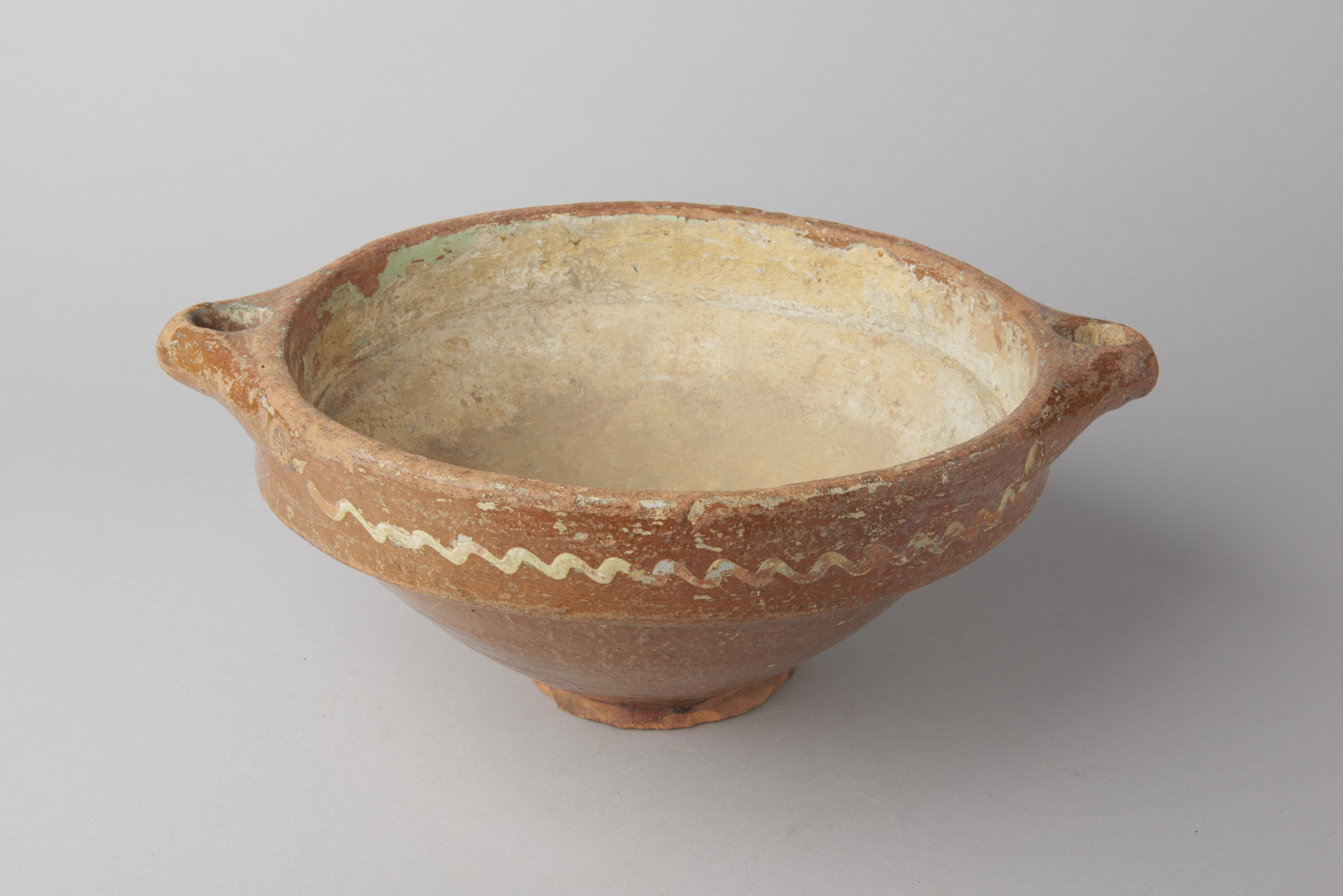 Kom, versierd met een golvende lijn om de rand. De kom is het laatst gebruikt om verf in te mengen.