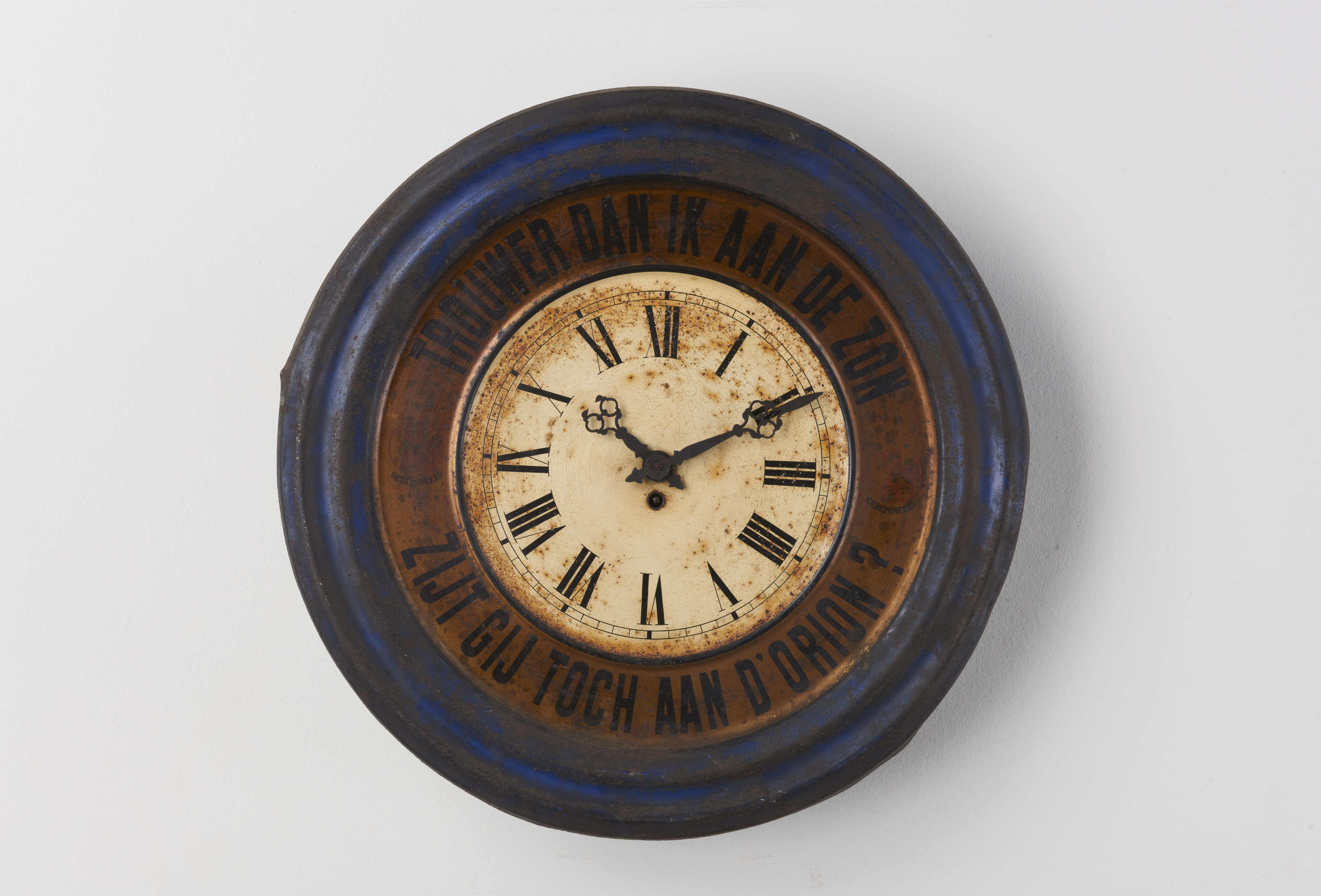 Reclame-uurwerk van Orion. Orion was een bedrijf in Zaandam en maakte spenenvet, remvloeistof en poetsolie. Het opschrift luidt: 'Trouwer dan ik aan de zon/Zijt gij toch aan d'Orion?' De wijzerplaat is van gestanst blik. Het monogram op het uurwerk is van Japy Frères et Cie Beaucourt France.