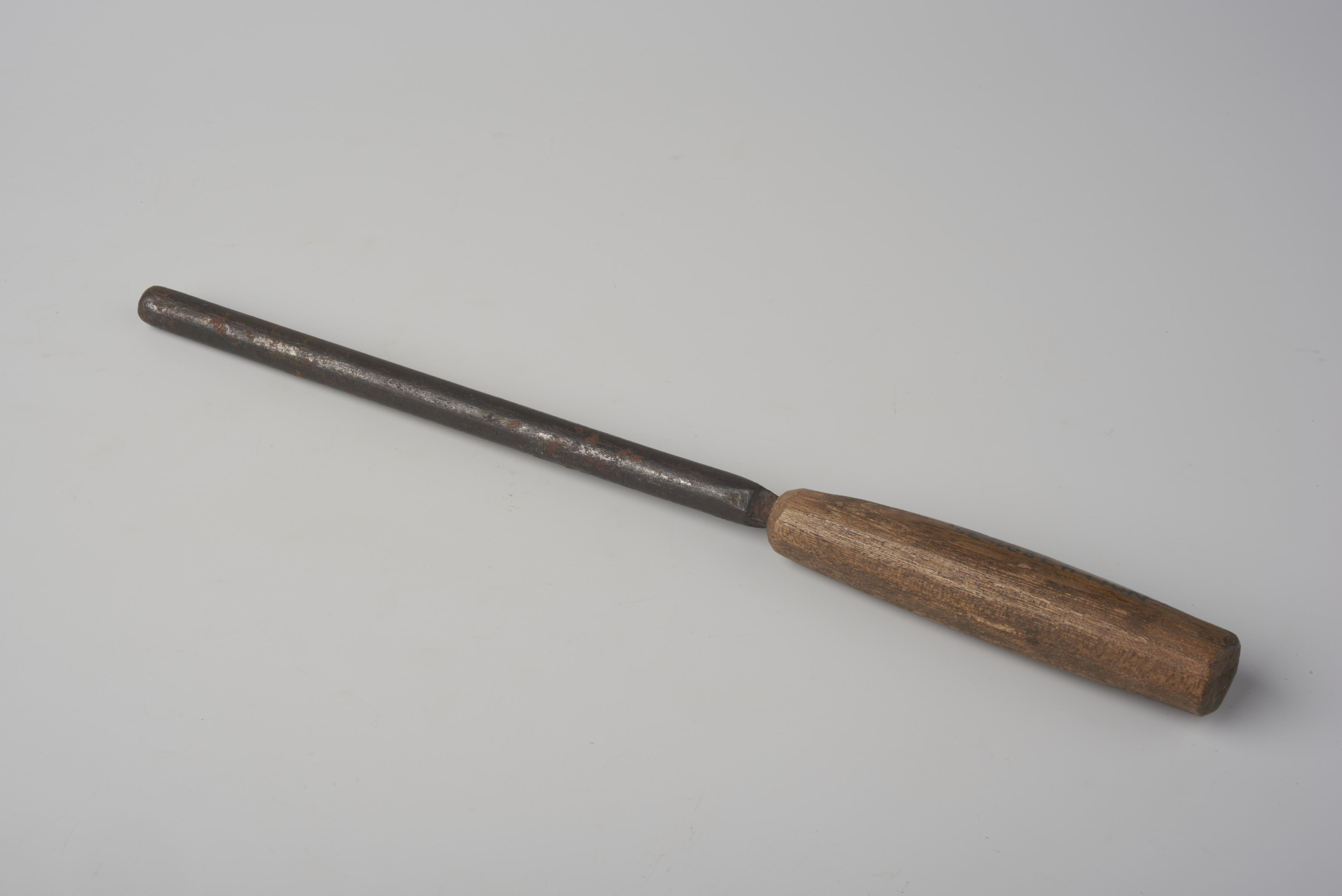 IJzeren mutsenplooistaaf. De staaf wordt verwarmd boven de kachel of het gasfornuis, waarna de plooien één voor één in de vochtige gesteven muts aangebracht worden. De plooistaaf is verworven via een handelaar in Friesland, maar het is niet bekend voor welk type muts hij precies gebruikt is.