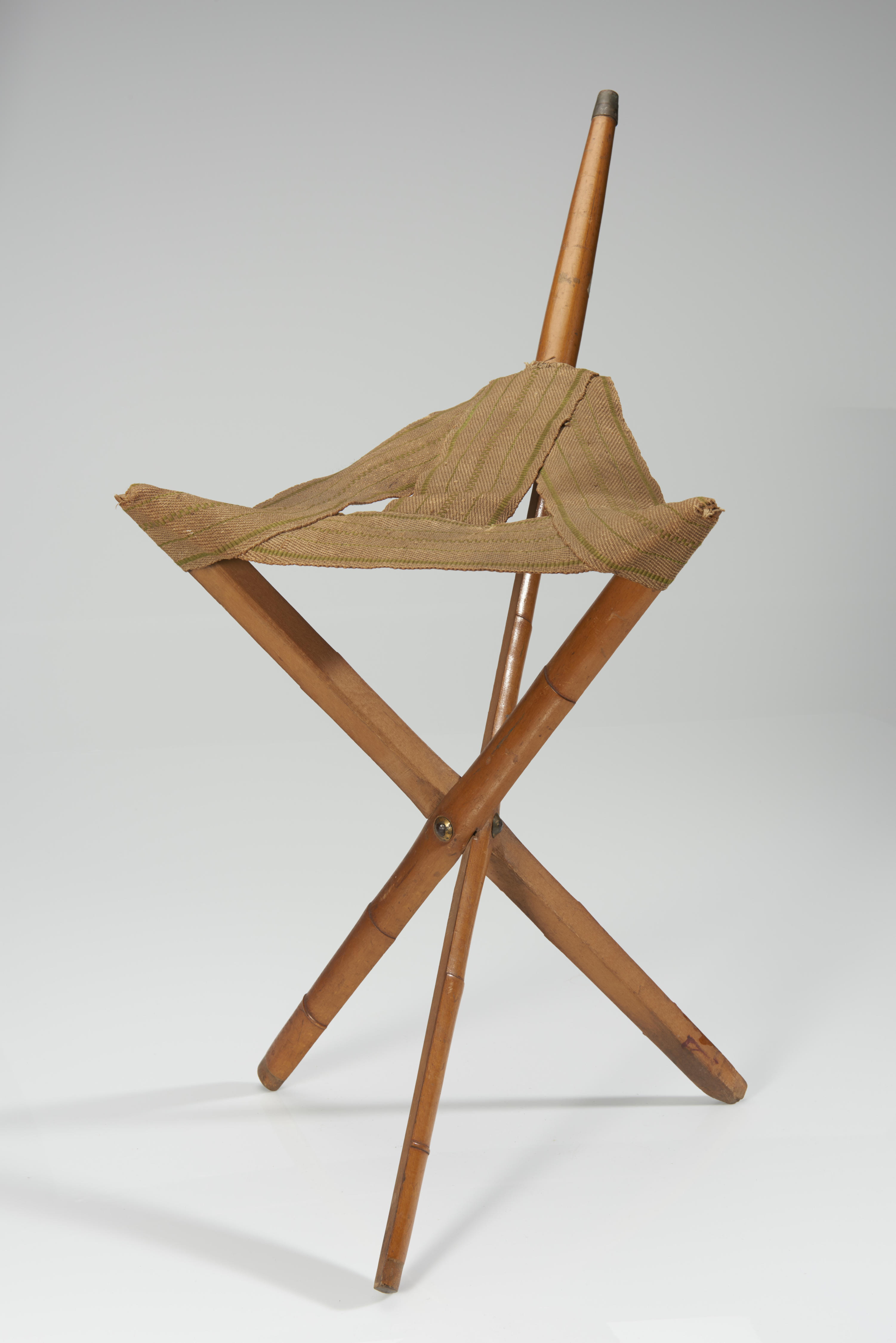 Houten wandelstok met een uitklapbare zitting van jute.