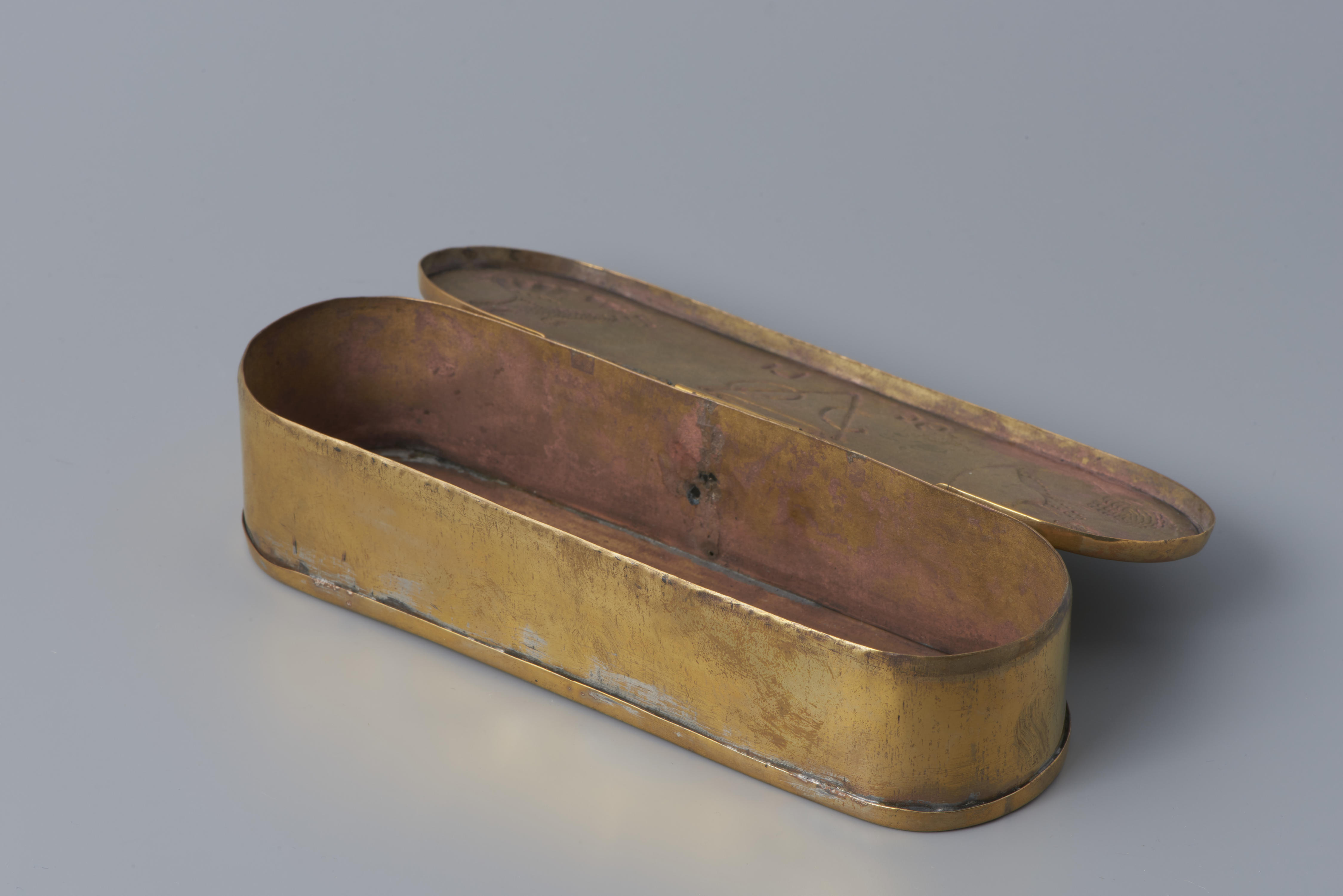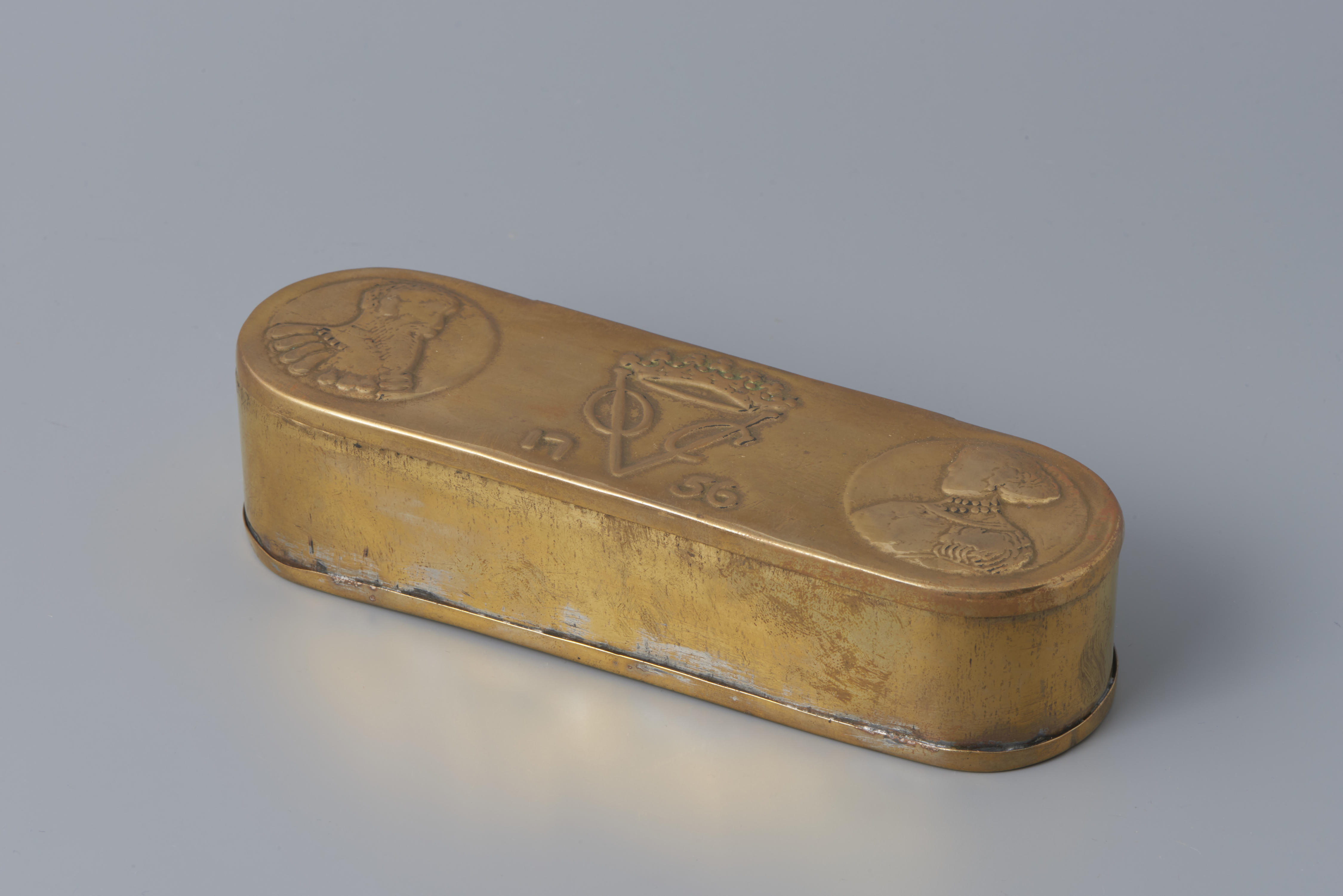 Messing tabaksdoos, gegraveerd met twee afbeeldingen van menselijke figuren. In het midden staat het VOC-embleem onder een kroon en het jaartal 1756.