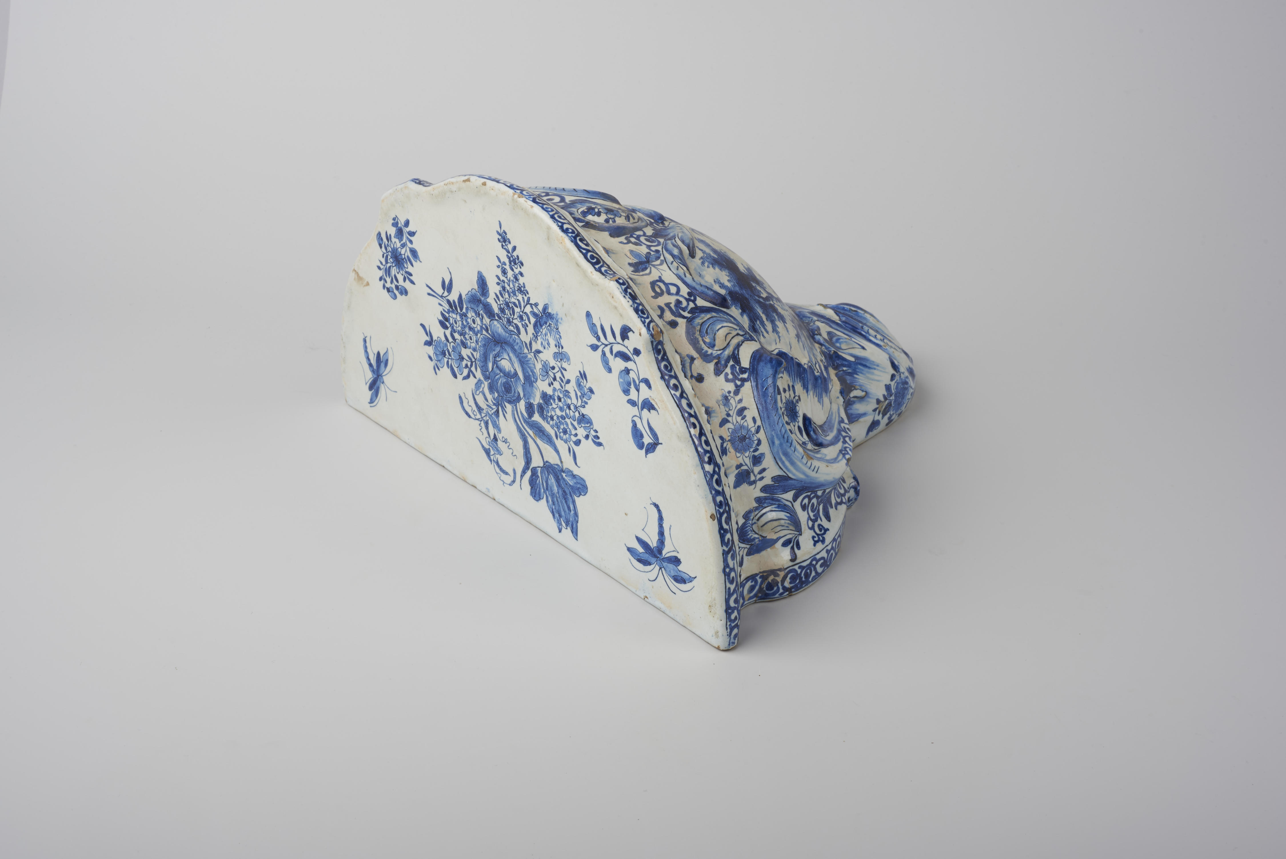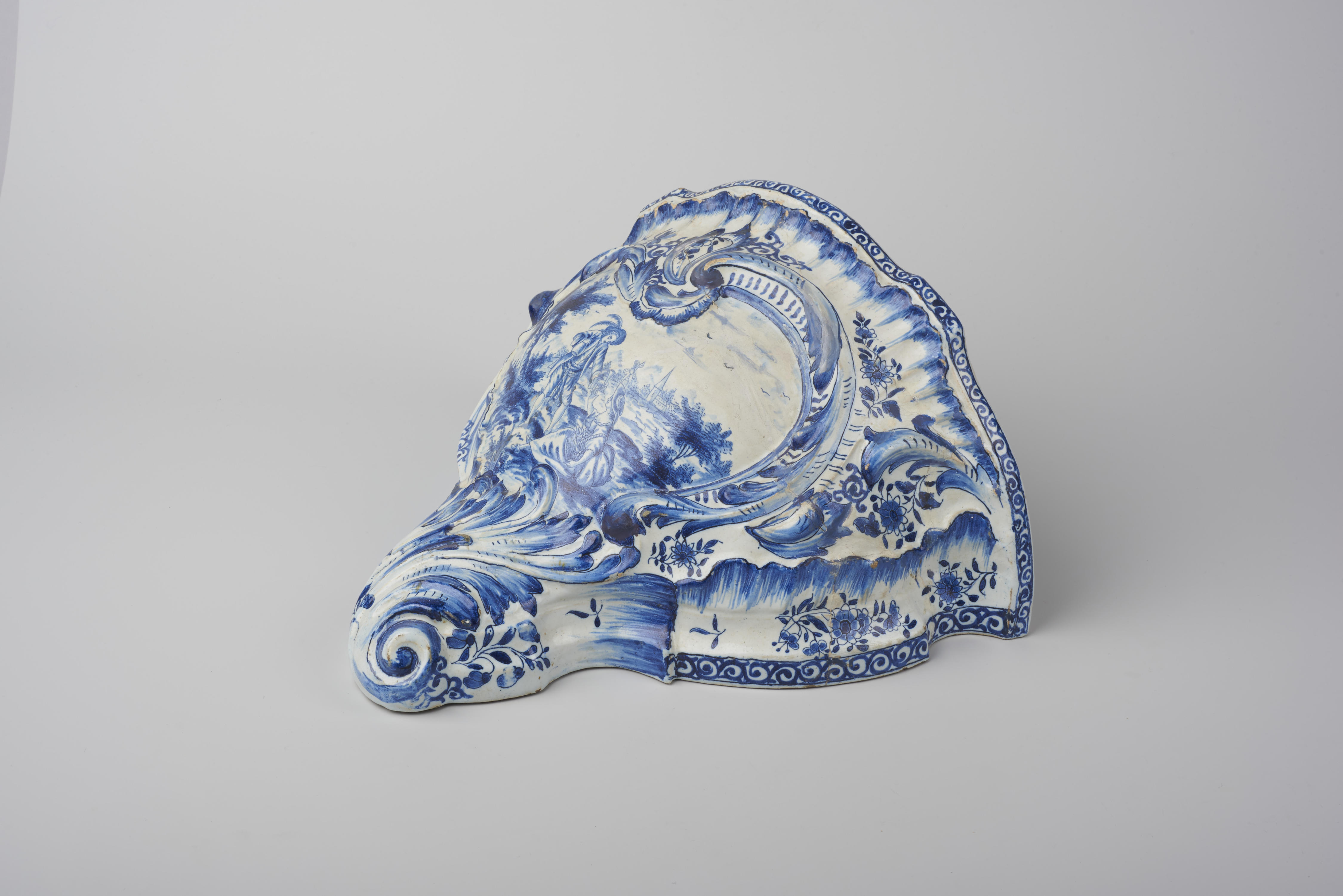 Console met een voorstelling van een picknickend paar in een landschap. De console is verder versierd met bloemboeketten en libelles. Het voorwerp is aan het eind van de negentiende eeuw vermoedelijk in een Noordfrans productiecentrum gemaakt