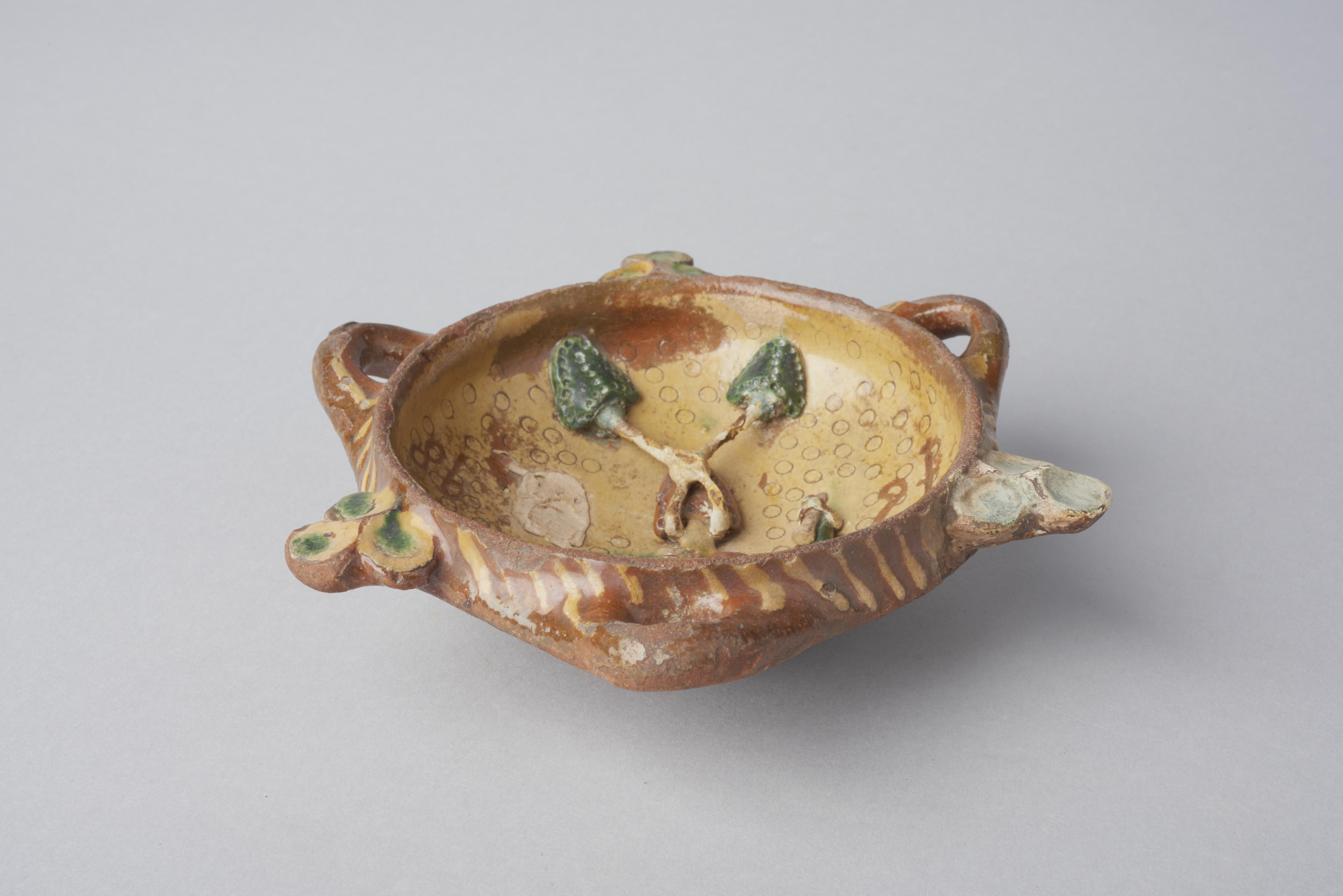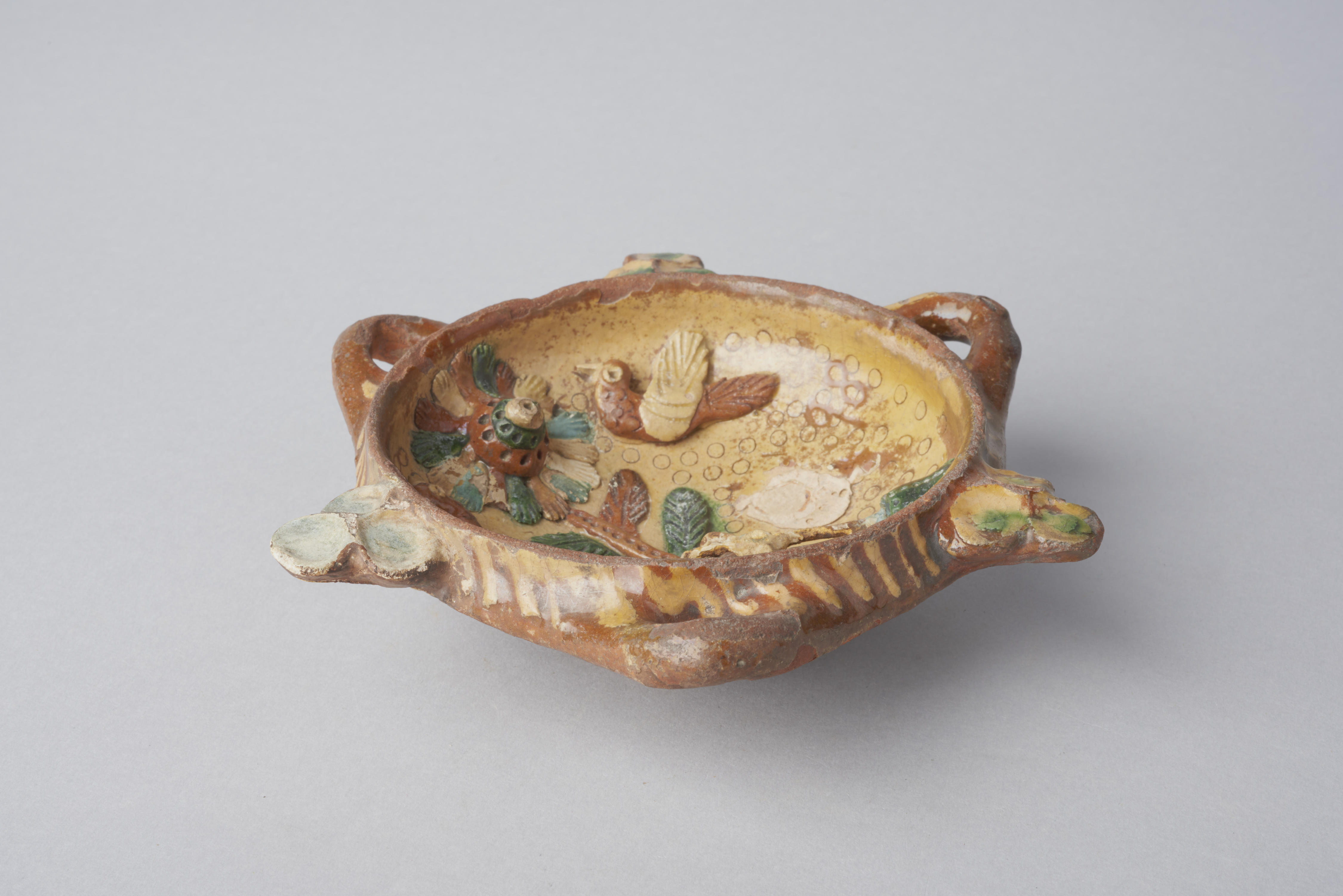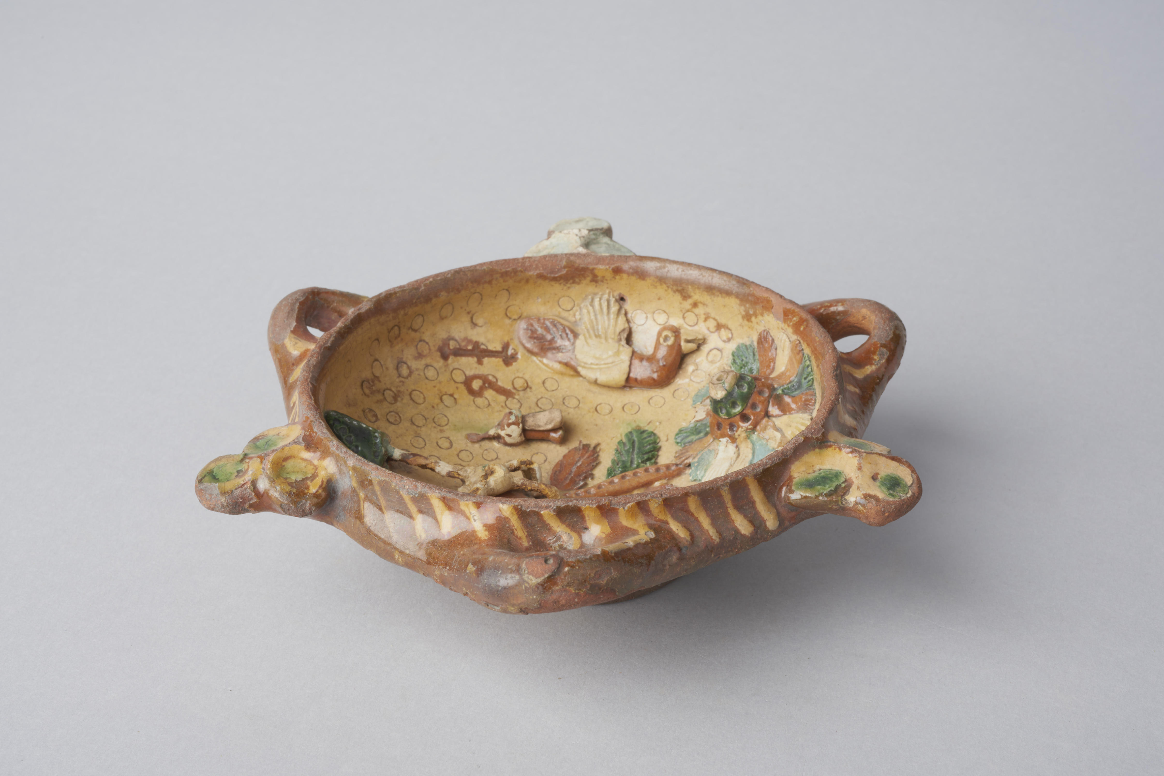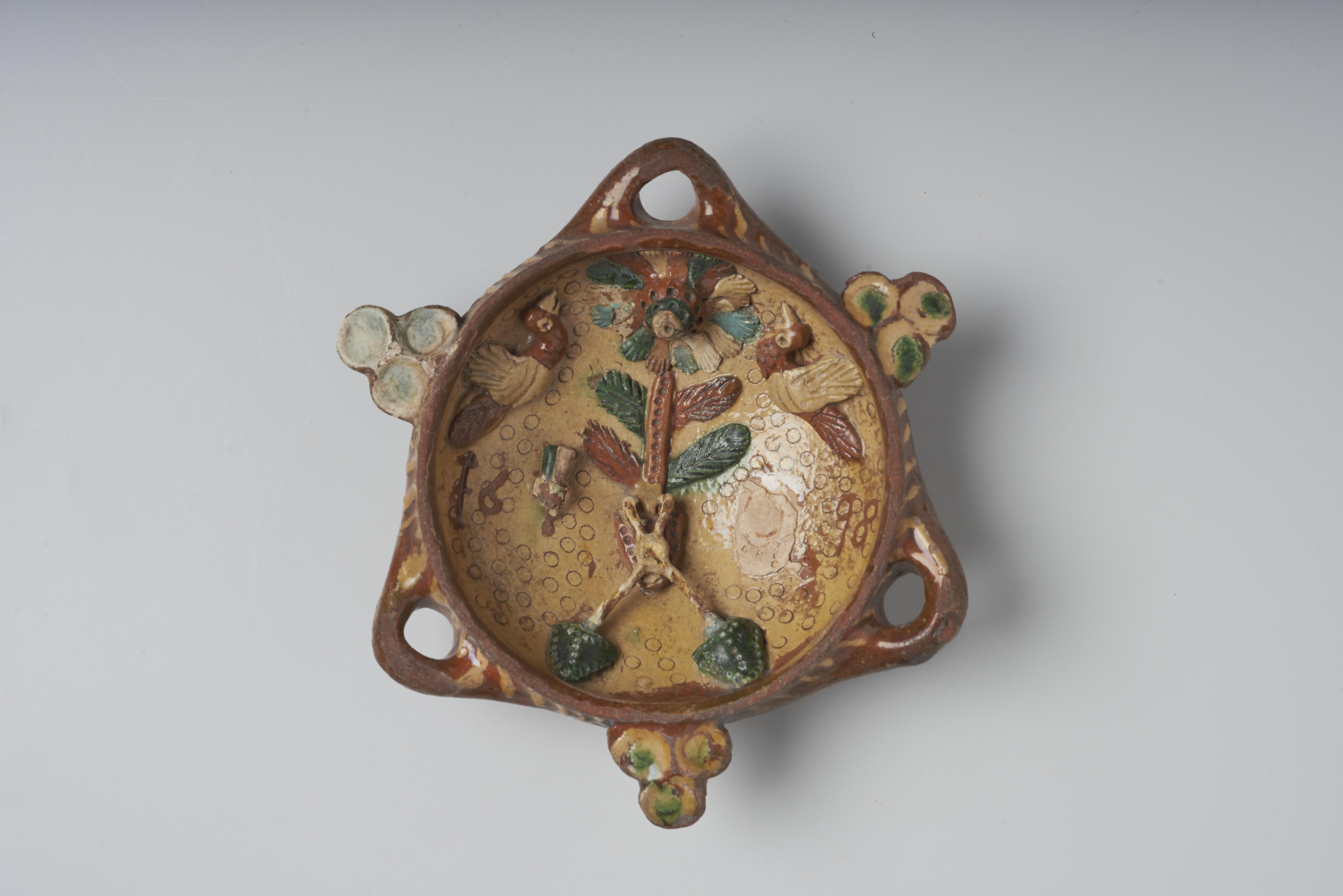 Bakje, versierd met diverse gelegenheidssymbolen, zoals vogels en een bloem. Het opschrift luidt: '1698'. Dit voorwerp is gebruikt als een soort grabbelbakje, waaruit snoepgoed (muisjes) aan kinderen gepresenteerd werd.