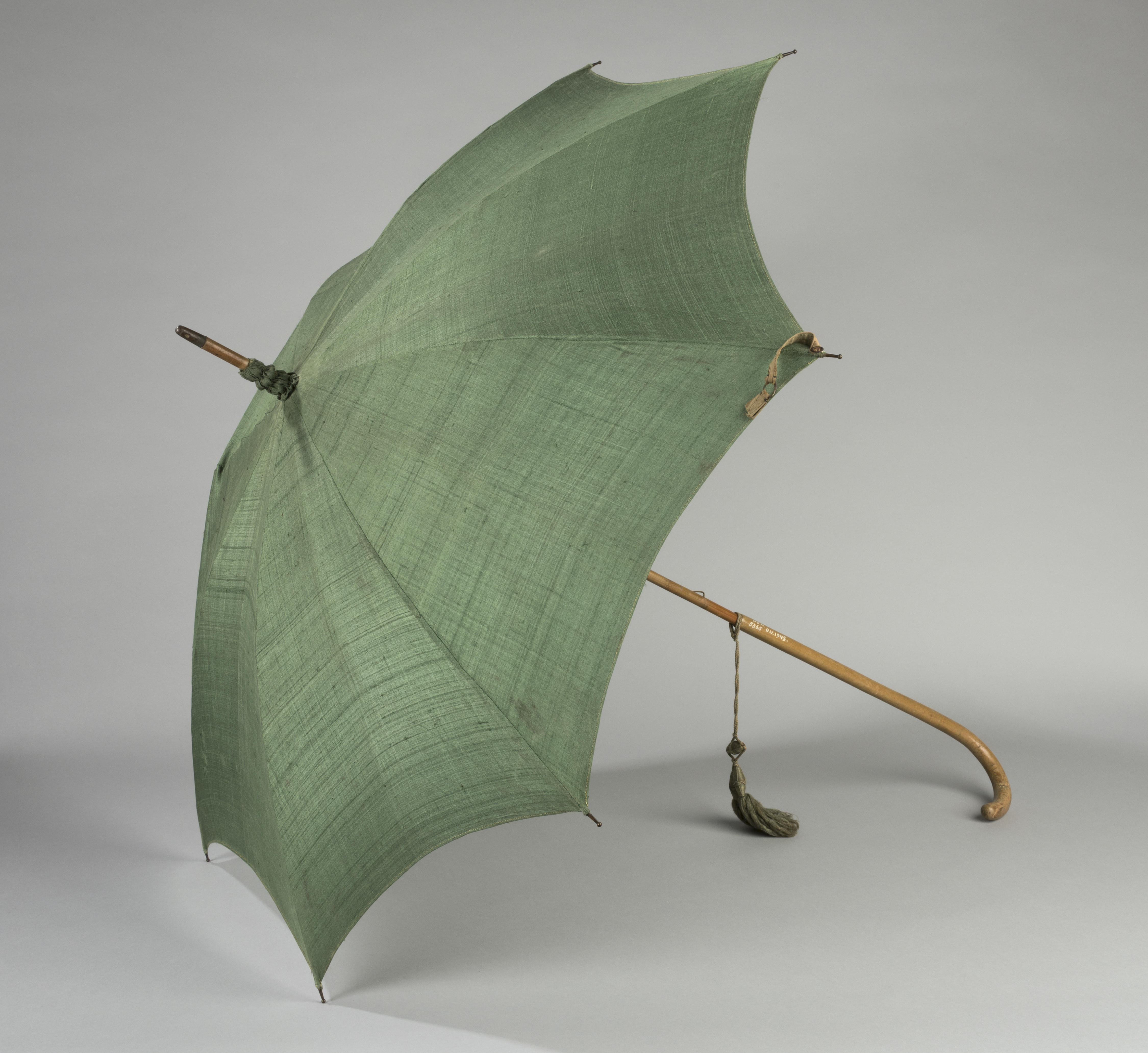 Parasol met een houten handvat en bespannen met groene tafzijde. Deze parasol is in 1944 aan het Nederlands Openluchtmuseum geschonken nadat het huis van de eigenaresse aan de Händelstraat in Arnhem is gevorderd.